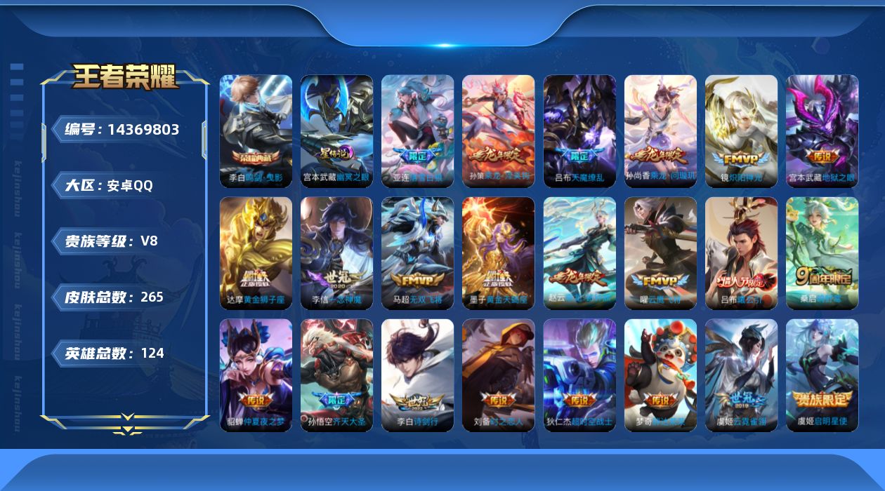 [14369803]v8-265皮肤-1典藏-23传说-62史诗,xl2016 【英雄全皮】:蒙恬全皮 【荣耀典藏】:李白鸣剑曳影 【传说皮肤】:桑启鸣野蒿,墨子黄金天蝎座,亚连落雪白狼,吕布曦玄引,孙尚香乘龙问璇玑,孙策乘龙淬吴钩,赵云乘龙铭钟鼎,孙悟空齐天大圣,李白诗剑行,马超无双飞将,铠绛天战甲,镜炽阳神光,虞姬启明星使,曜云鹰飞将,李信一念神魔,刘备时之恋人,虞姬云霓雀翎,达摩黄金狮子座,梦奇胖达荣荣,貂蝉仲夏夜之梦,宫本武藏地狱之眼,吕布天魔缭乱,狄仁杰超时空战士 【限定皮肤】:白起狰,姜子牙天穹之誓,狄仁杰阴阳师,赵云皇家上将,嬴政优雅恋人,鲁班七号狮舞东方,高渐离死亡摇滚,芈月重明,吕布天魔缭乱,吕布猎兽之王,元歌无心,夏侯惇朔风刀,典韦穷奇,马可波罗山海玄木吟,狄仁杰魔术师,狄仁杰万华元夜,达摩沙漠行僧,项羽海滩派对,老夫子醍醐杖,程咬金演武夺筹,韩信飞衡,兰陵王金庭之子,孙悟空齐天大圣,牛魔御旌,李元芳云中旅人,虞姬启明星使,钟馗神迹守卫,钟馗驱傩正仪,杨玉环遇见飞天,杨戬潮玩骑兵,太乙真人饕餮,太乙真人华丽摇滚,鬼谷子原初探秘者,鬼谷子五谷丰年,百里玄策原初追逐者,百里守约朱雀志,弈星混沌棋,梦奇顽趣,沈梦溪大漠名商,明世隐疑决卦,裴擒虎擒涛扼浪,狂铁御狮,米莱狄御霄,云中君纤云弄巧,盾山御銮,上官婉儿梁祝,鲁班大师探海日志,桑启海盐诗旅,艾琳女武神,张良古海寻踪,蒙犽百解令,蒙恬荣光圣徽,高渐离燃音魔法,妲己灵卜魔法,鬼谷子天穹祈灯,伽罗琥珀纪元,孙尚香乘龙问璇玑,孙策乘龙淬吴钩,赵云乘龙铭钟鼎,吕布曦玄引,亚连落雪白狼,沈梦溪龙舞盛年,鲁班七号蔬乡物语,李元芳蔬乡物语,刘邦剑破天穹,程咬金群星魔术团,镜青焰无极,项羽苍威无极,周瑜熔金海岸 【年限皮肤】:百里守约朱雀志,韩信飞衡,马超神威,马可波罗山海玄木吟,孙尚香乘龙问璇玑,孙策乘龙淬吴钩,赵云乘龙铭钟鼎 【赛季限定】:白起狰,芈月重明,夏侯惇朔风刀,典韦穷奇,狄仁杰万华元夜,达摩沙漠行僧,老夫子醍醐杖,程咬金演武夺筹,兰陵王金庭之子,张良古海寻踪,牛魔御旌,李元芳云中旅人,钟馗驱傩正仪,太乙真人饕餮,鬼谷子原初探秘者,百里玄策原初追逐者,弈星混沌棋,梦奇顽趣,沈梦溪大漠名商,明世隐疑决卦,裴擒虎擒涛扼浪,狂铁御狮,米莱狄御霄,盾山御銮,鲁班大师探海日志,桑启海盐诗旅,鬼谷子天穹祈灯,蒙恬荣光圣徽,刘邦剑破天