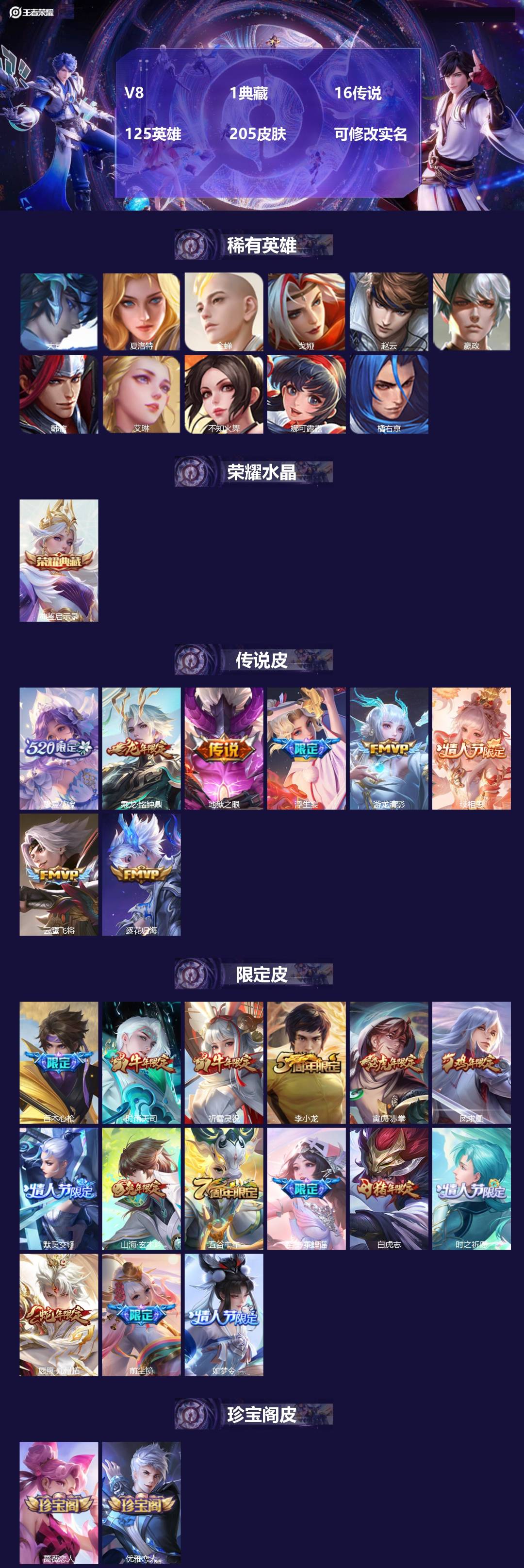 v8 1典藏 16传说 125英雄 205皮肤 可修改实名 【英雄全皮】:娜可露露全皮蒙恬全皮海诺全皮夏洛特全皮 【稀有英雄】:大司命嬴政始皇帝韩信韩跳跳夏洛特夏师傅艾琳橘右京橘子娜可露露鸟人不知火舞赵云金蝉唐僧戈娅 【荣耀水晶】:神鉴启示录 【传