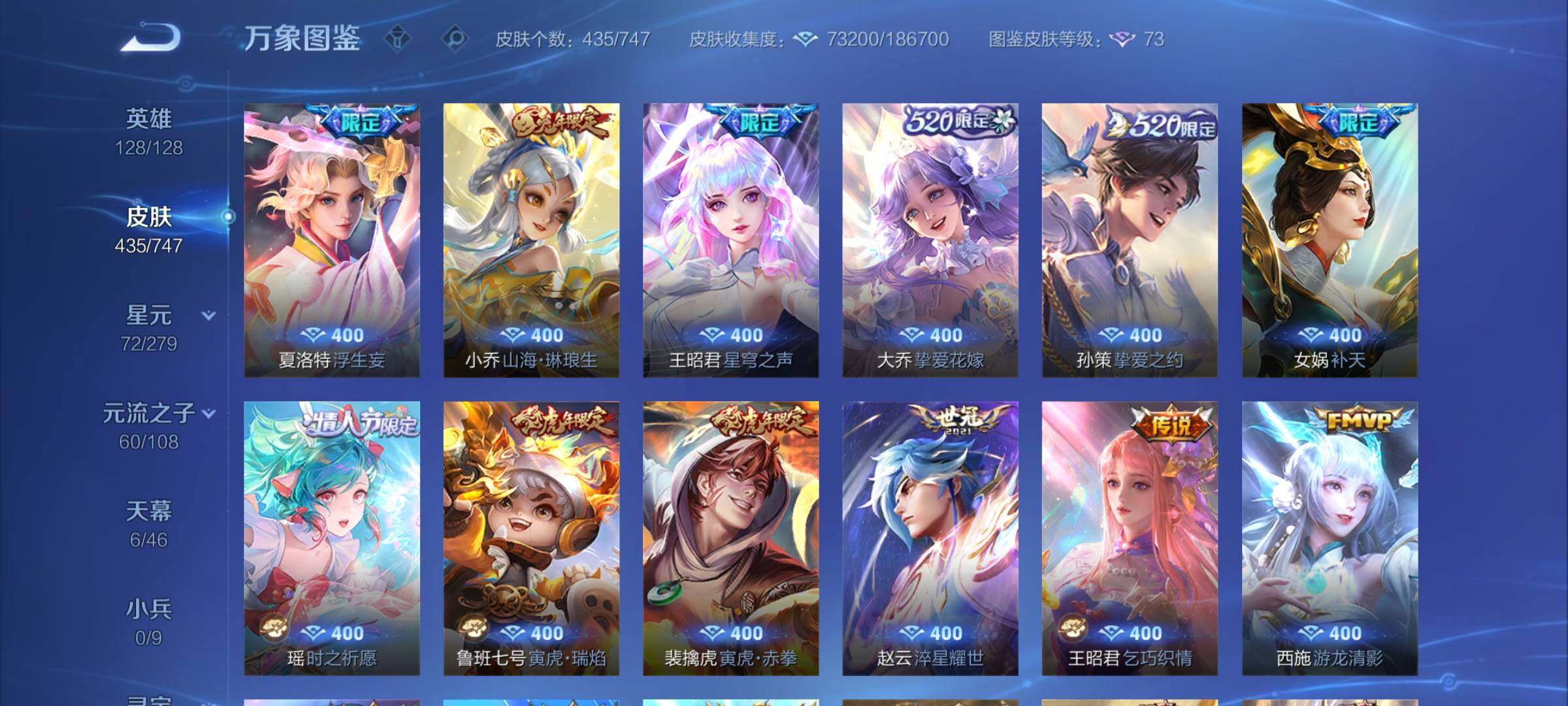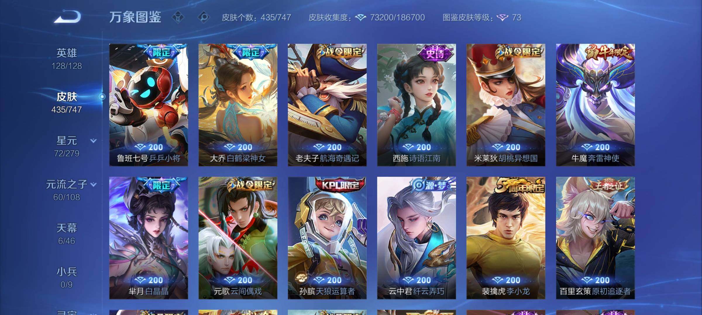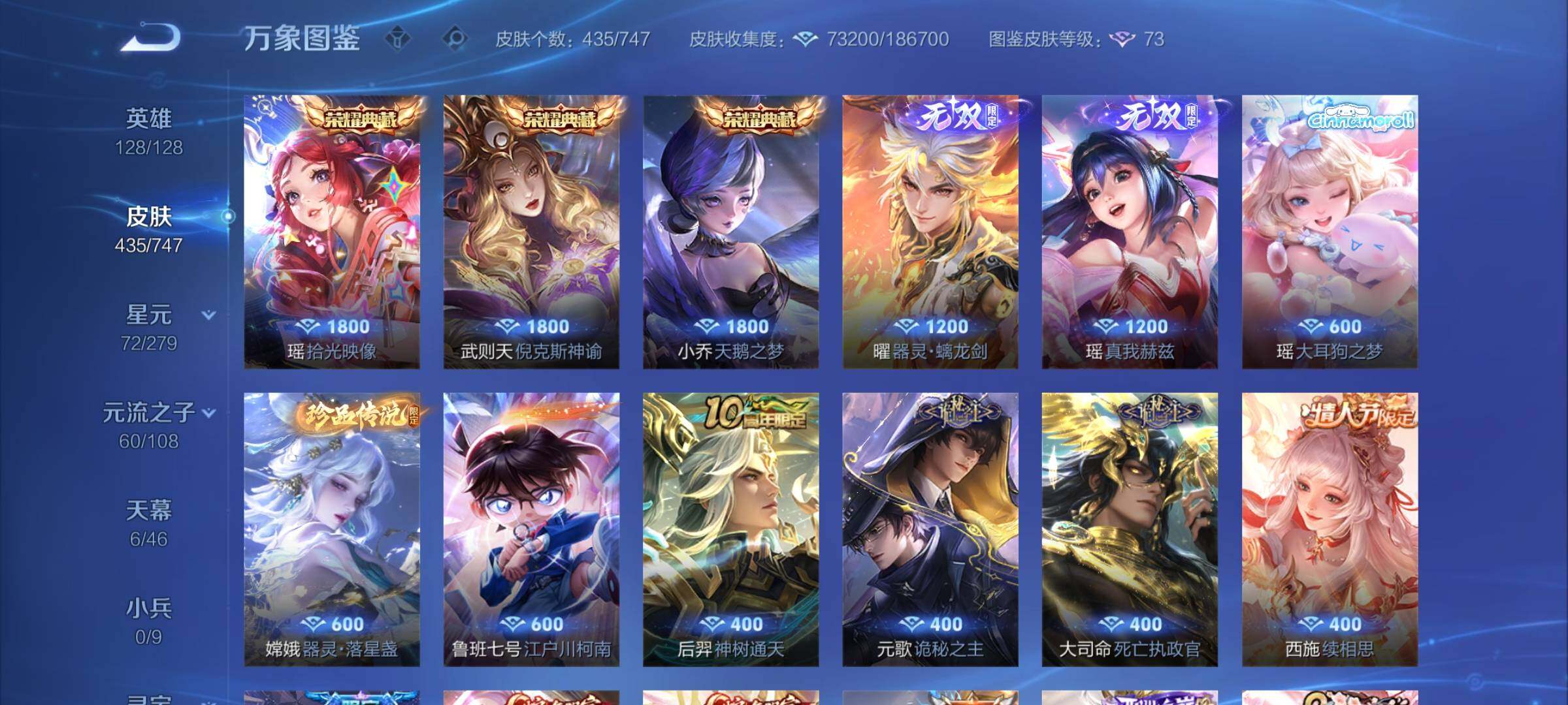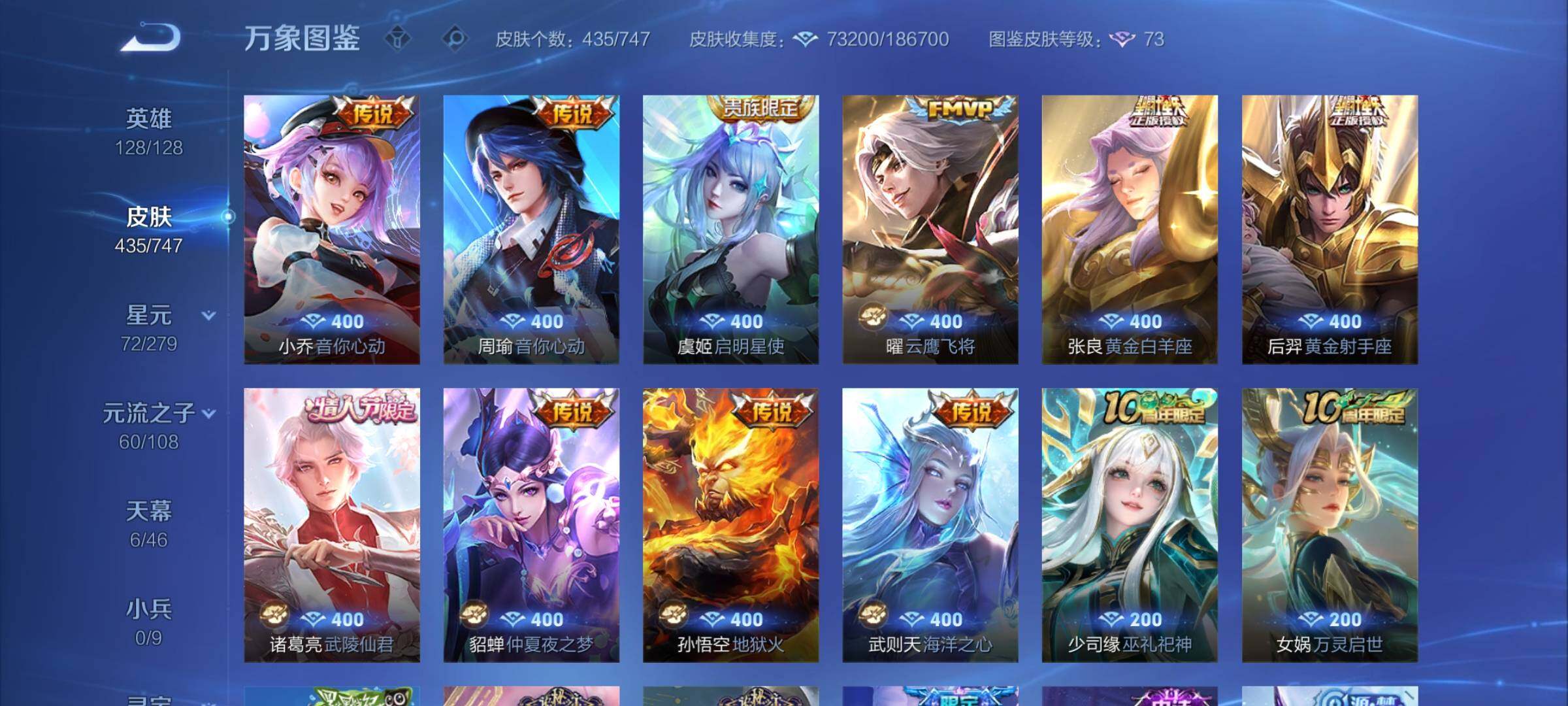 【精品女号v10·瑶全皮 紫瑶·王昭君全皮·大乔全皮·西施全皮·杨玉环全皮·小乔差1满皮·天鹅之梦·器灵落星盏·幻海之心·金色貂蝉·4典藏·2无双·3珍品·5星传说·3精品天幕·挚爱童话天幕·花朝如约天幕·金虎啸春天幕·满虎年限定·至美化雀舞·永恒水手月亮·14款年限·可二次】w7459-安卓q-128英雄-435皮肤-18王者印记-140铭文-贵族积分23w【贵族10】【v10·4典藏·