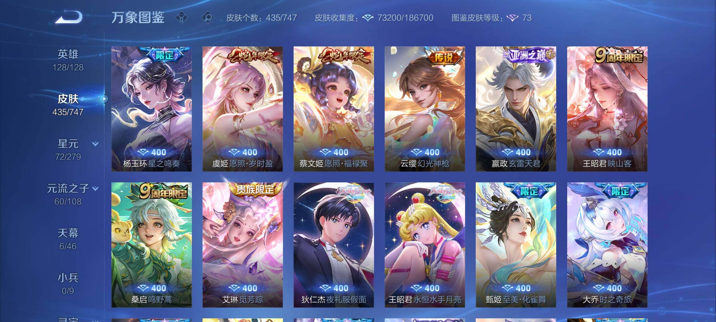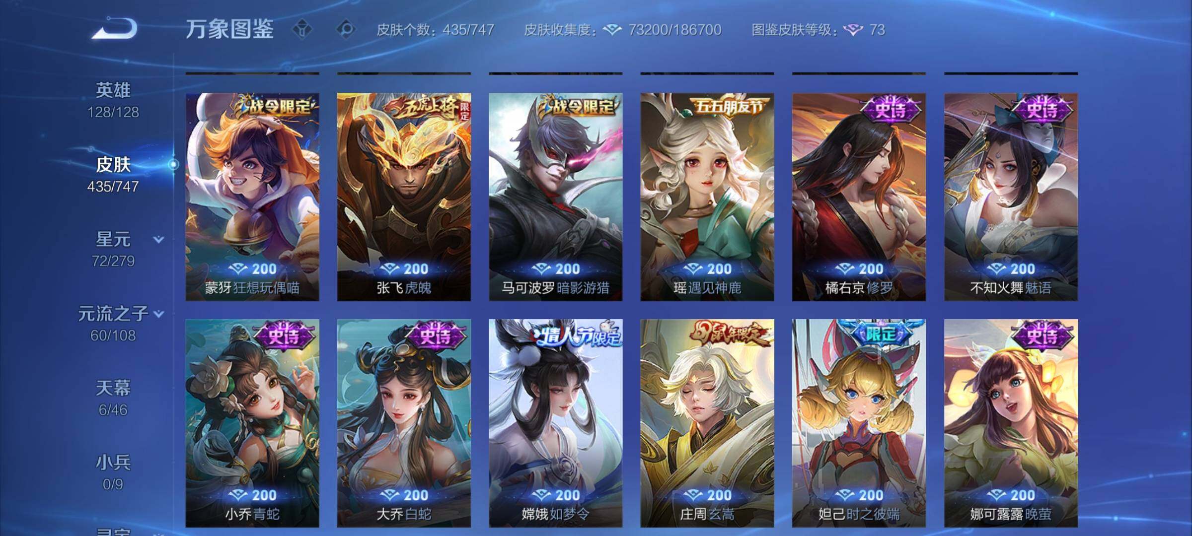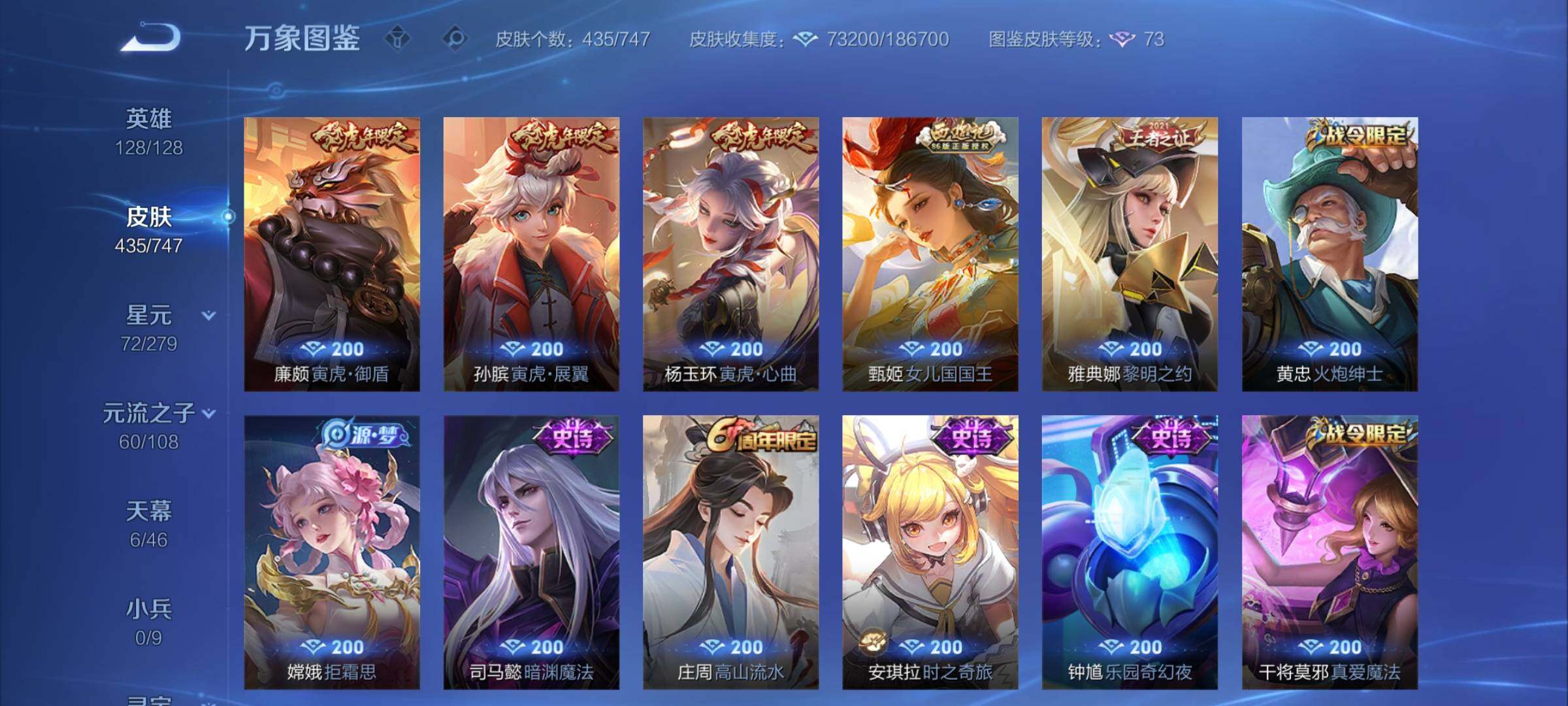 【精品女号v10·瑶全皮 紫瑶·王昭君全皮·大乔全皮·西施全皮·杨玉环全皮·小乔差1满皮·天鹅之梦·器灵落星盏·幻海之心·金色貂蝉·4典藏·2无双·3珍品·5星传说·3精品天幕·挚爱童话天幕·花朝如约天幕·金虎啸春天幕·满虎年限定·至美化雀舞·永恒水手月亮·14款年限·可二次】w7459-安卓q-128英雄-435皮肤-18王者印记-140铭文-贵族积分23w【贵族10】【v10·4典藏·