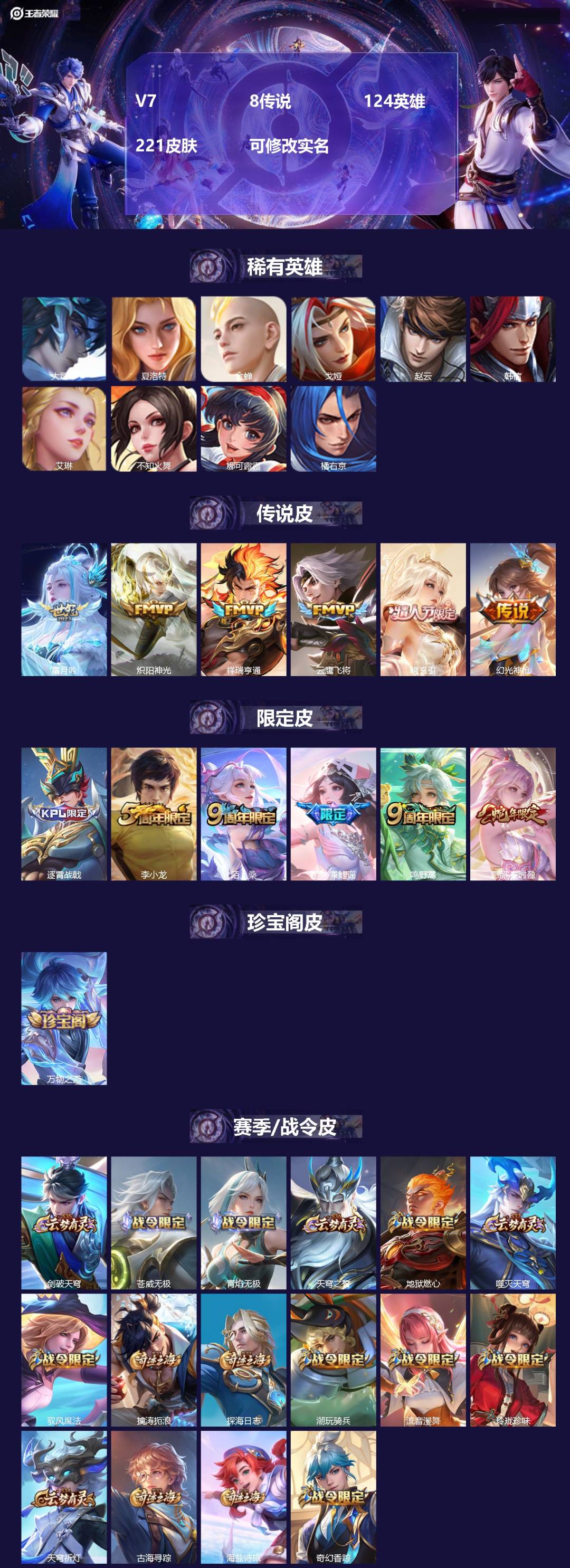[14373647]v7 8传说 124英雄 221皮肤 可修改实名 【英雄全皮】:海诺全皮影全皮 【稀有英雄】:大司命韩信韩跳跳夏洛特夏师傅艾琳橘右京橘子娜可露露鸟人不知火舞赵云金蝉唐僧戈娅 【传说皮】:貂蝉曦玄引幻光神呛祥瑞亨通云鹰飞将小将军