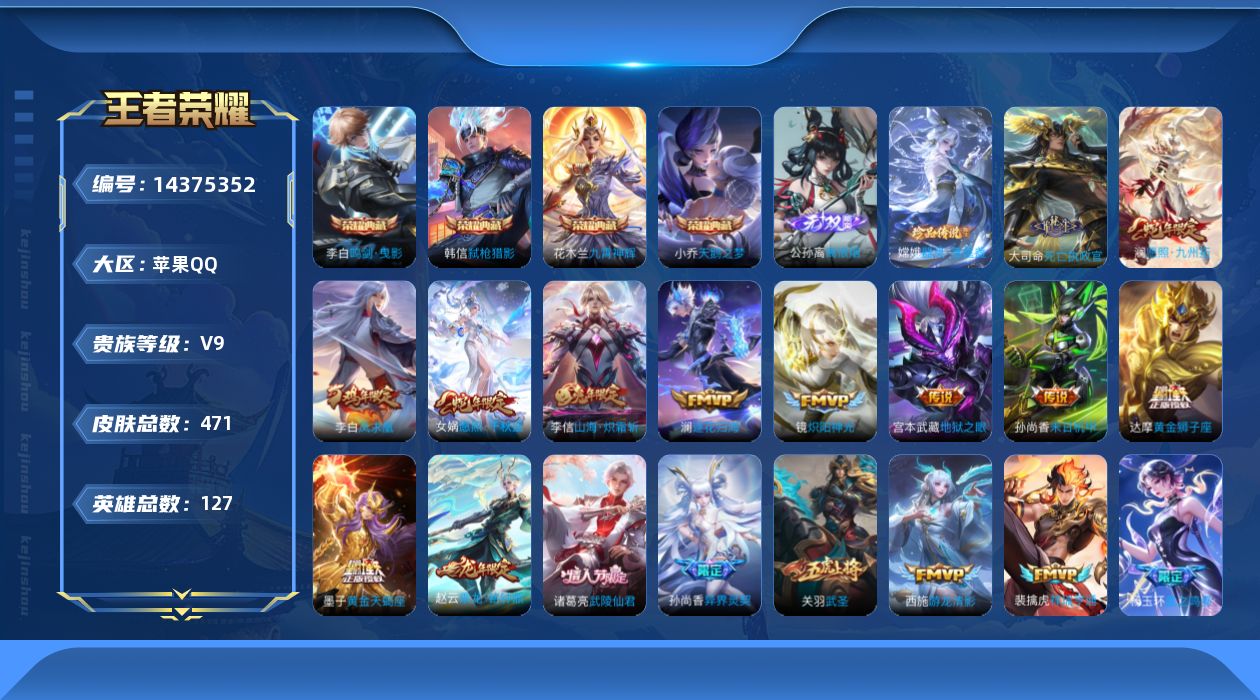 [14375352]皇冠号 贵族9-金标墨子-力鸭全场、花朝如约天幕-471皮-4典藏-34传说-1无双-1珍品传说-0珍品无双-16全皮-7改名卡 苹果手q10区 营地id326327845荣耀王者【珍品传说皮肤】:器灵·落星盏【无双皮肤】:离恨烟【荣耀典藏】:弑呛猎影九霄神辉鸣剑·曳影天鹅之梦【优质限定皮肤】:武圣山海·炽霜斩神威凤求凰至尊宝【传说皮肤】:神树通天黄金狮子座