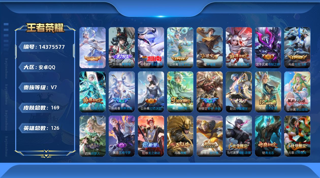 [14375577]贵族7-169皮-1典藏-11传说-1无双-1珍品传说-0珍品无双-1全皮-3改名卡-1灵宝改名卡 安卓手q292区 营地id549246936至尊星耀ii【珍品传说皮肤】:怪盗基德【无双皮肤】:离恨烟【荣耀典藏】:最初的交响【优质限定皮肤】:神威无双飞将祈雪灵祝【传说皮肤】:地狱之眼鸣野蒿记忆之芯异界灵契淬星耀世李 时雨天司零号·赤焰无双飞将云诺千