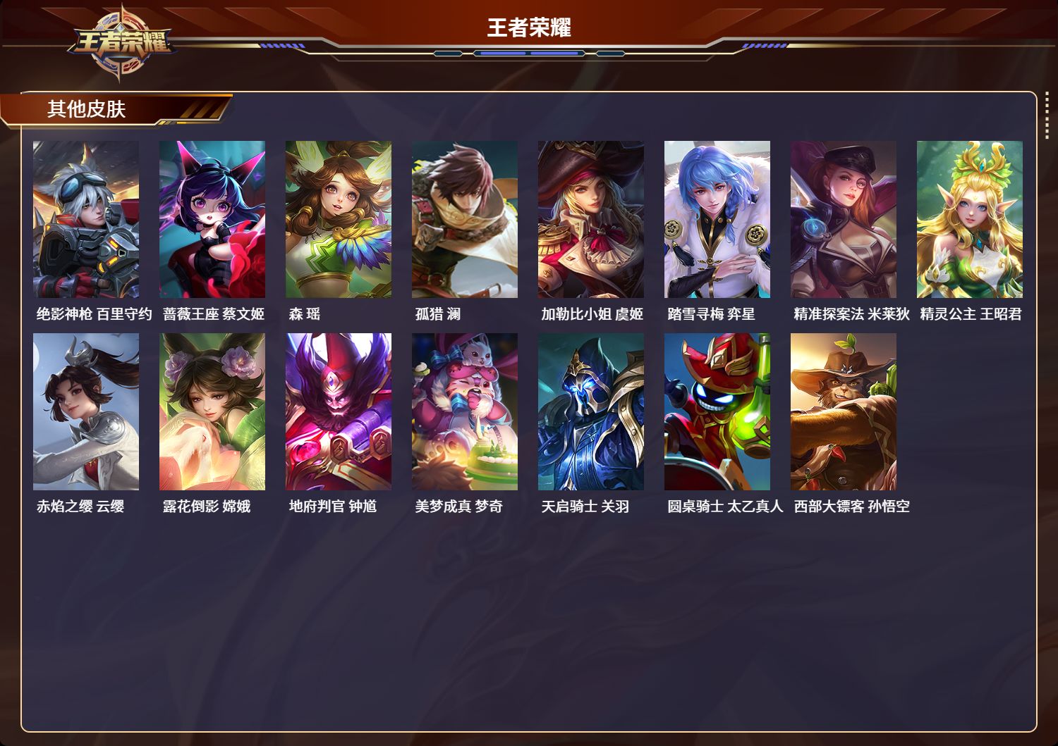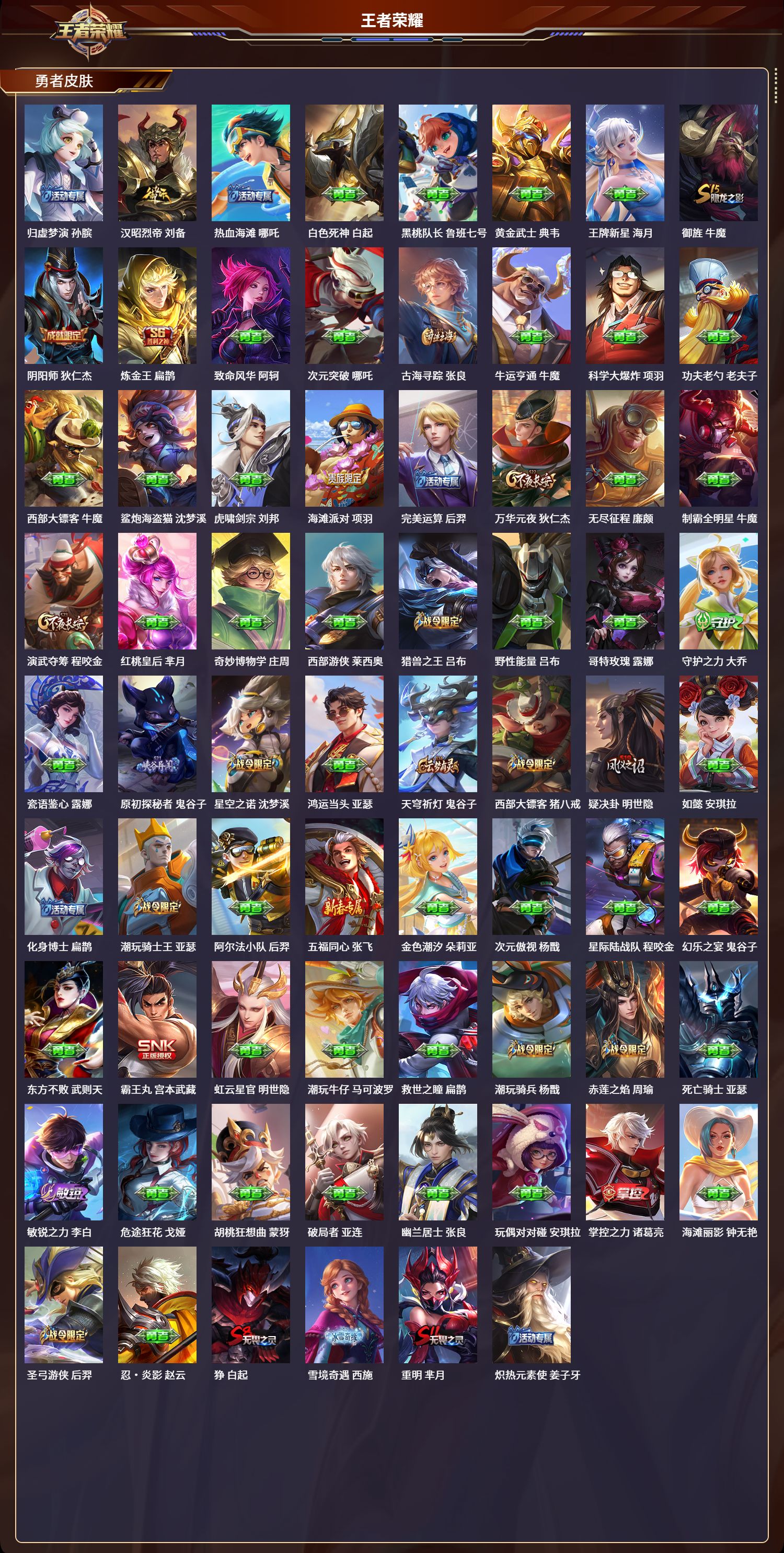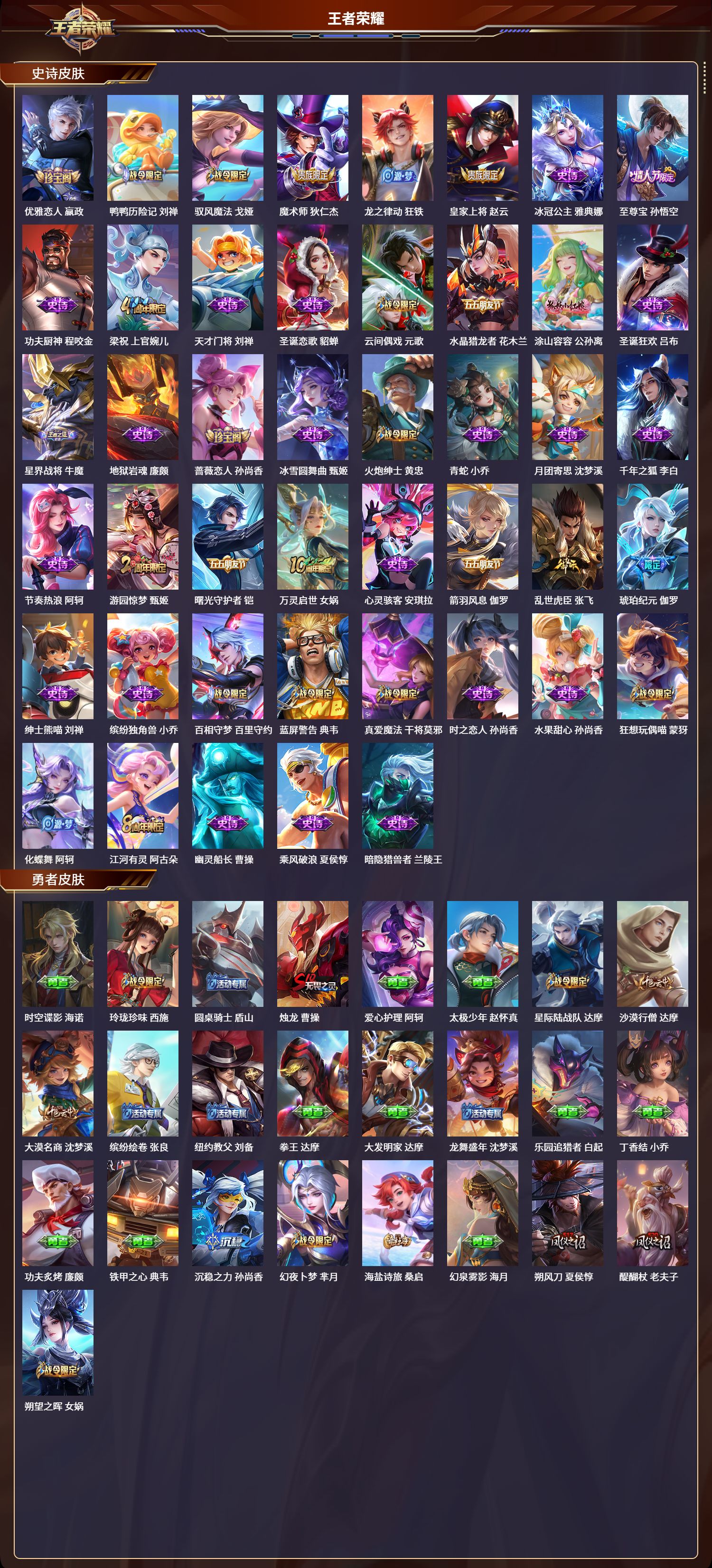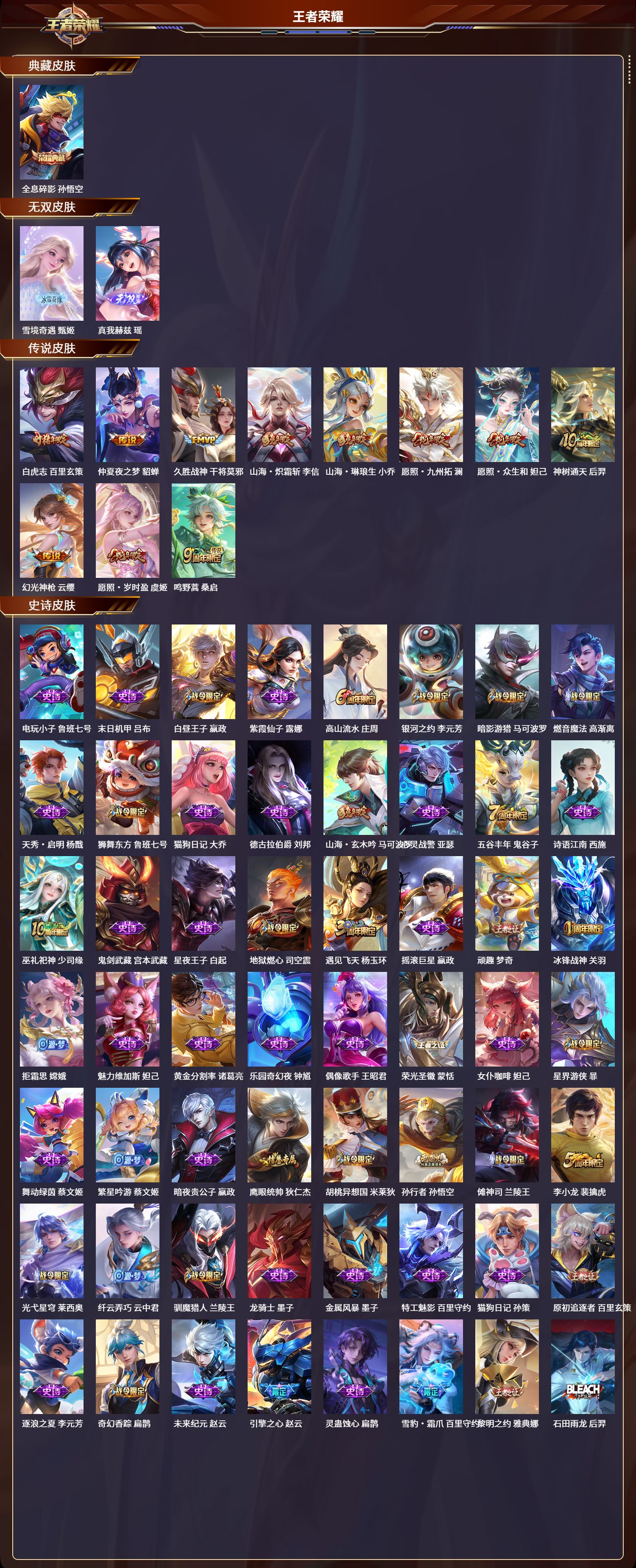 苹果qq/荣耀王者/365皮肤/124英雄/1典藏/0珍品无双/2无双/0珍品传说/11传说/101史诗/8稀有英雄【1 典藏皮肤】全息碎影 孙悟空【2 无双皮肤】雪境奇遇 甄姬真我赫兹 瑶【11 传说皮肤】白虎志 百里玄策仲夏夜之梦 貂蝉久胜战神 干将莫邪山海·炽霜斩 李信山海·琳琅生 小乔愿照·九州拓 澜愿照·众生和 妲己神树通天 后羿幻光神呛 云缨愿照·岁时盈 虞姬