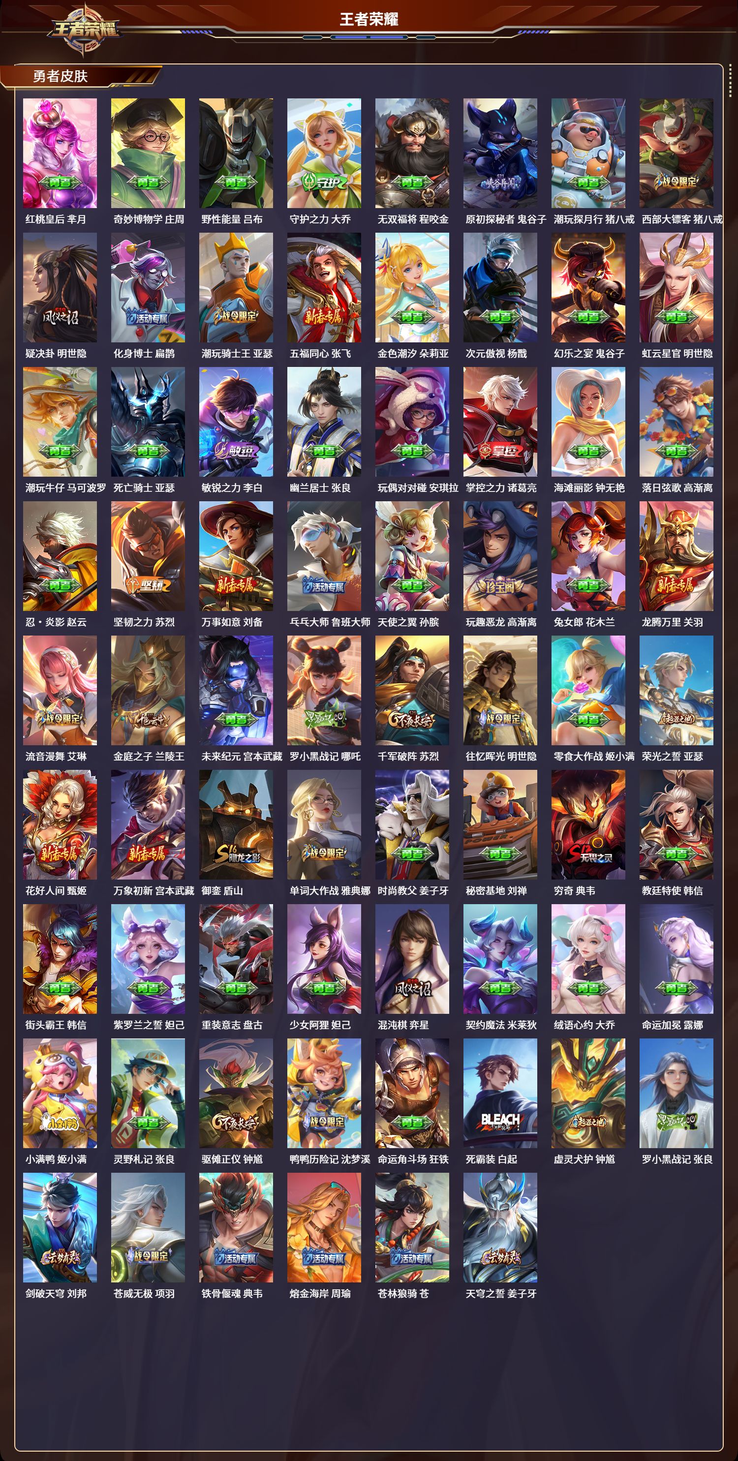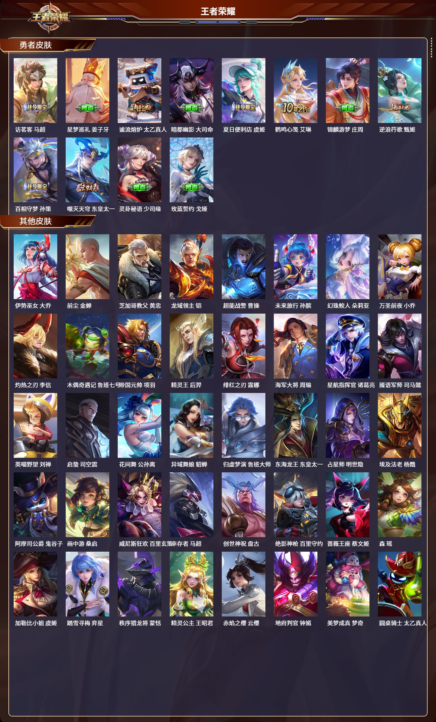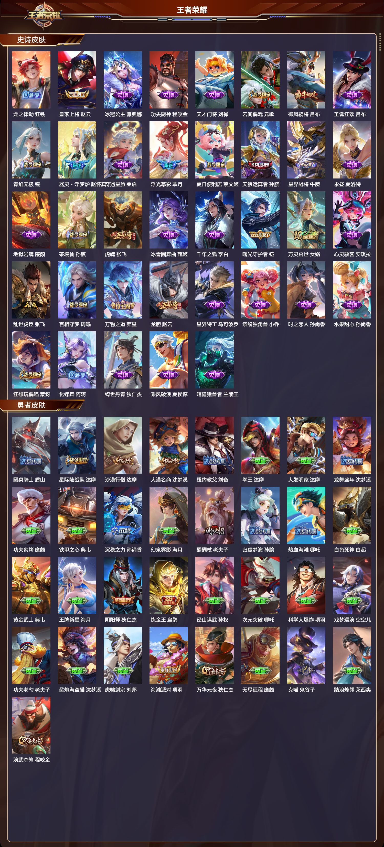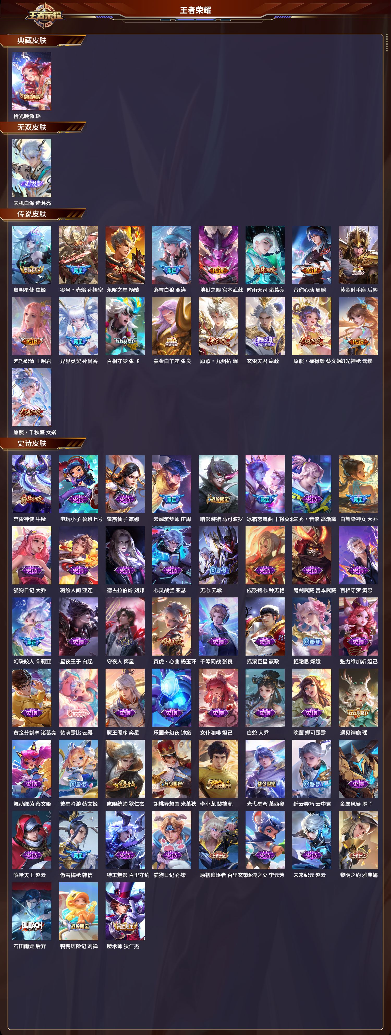 苹果qq/非凡王者/262皮肤/124英雄/1典藏/0珍品无双/1无双/0珍品传说/17传说/88史诗/8稀有英雄【1 典藏皮肤】拾光映像 瑶【1 无双皮肤】天机白泽 诸葛亮【17 传说皮肤】启明星使 虞姬零号·赤焰 孙悟空永曜之星 杨戬落雪白狼 亚连地狱之眼 宫本武藏时雨天司 诸葛亮音你心动 周瑜黄金射手座 后羿乞巧织情 王昭君异界灵契 孙尚香百相守梦 张飞黄金白羊座