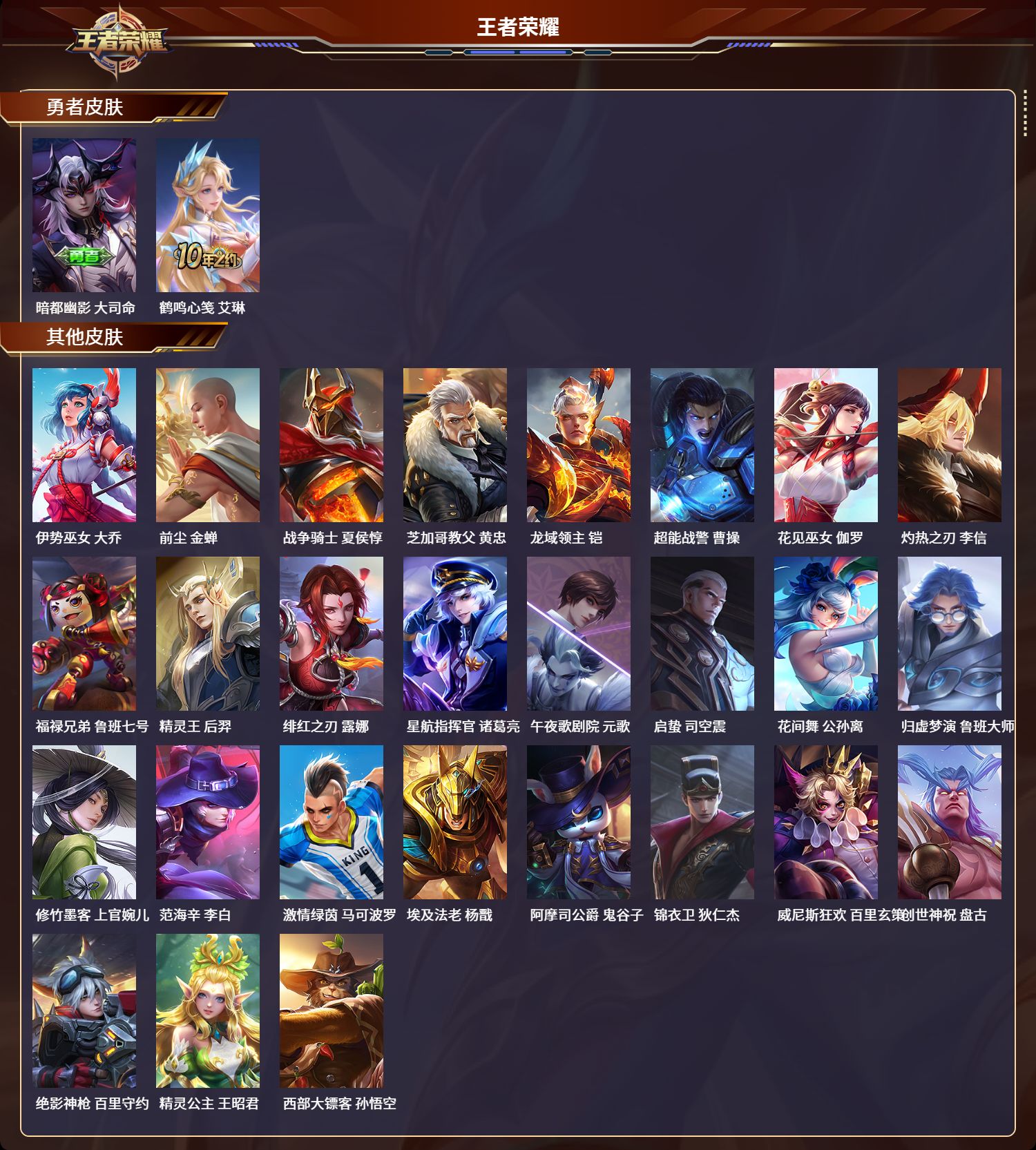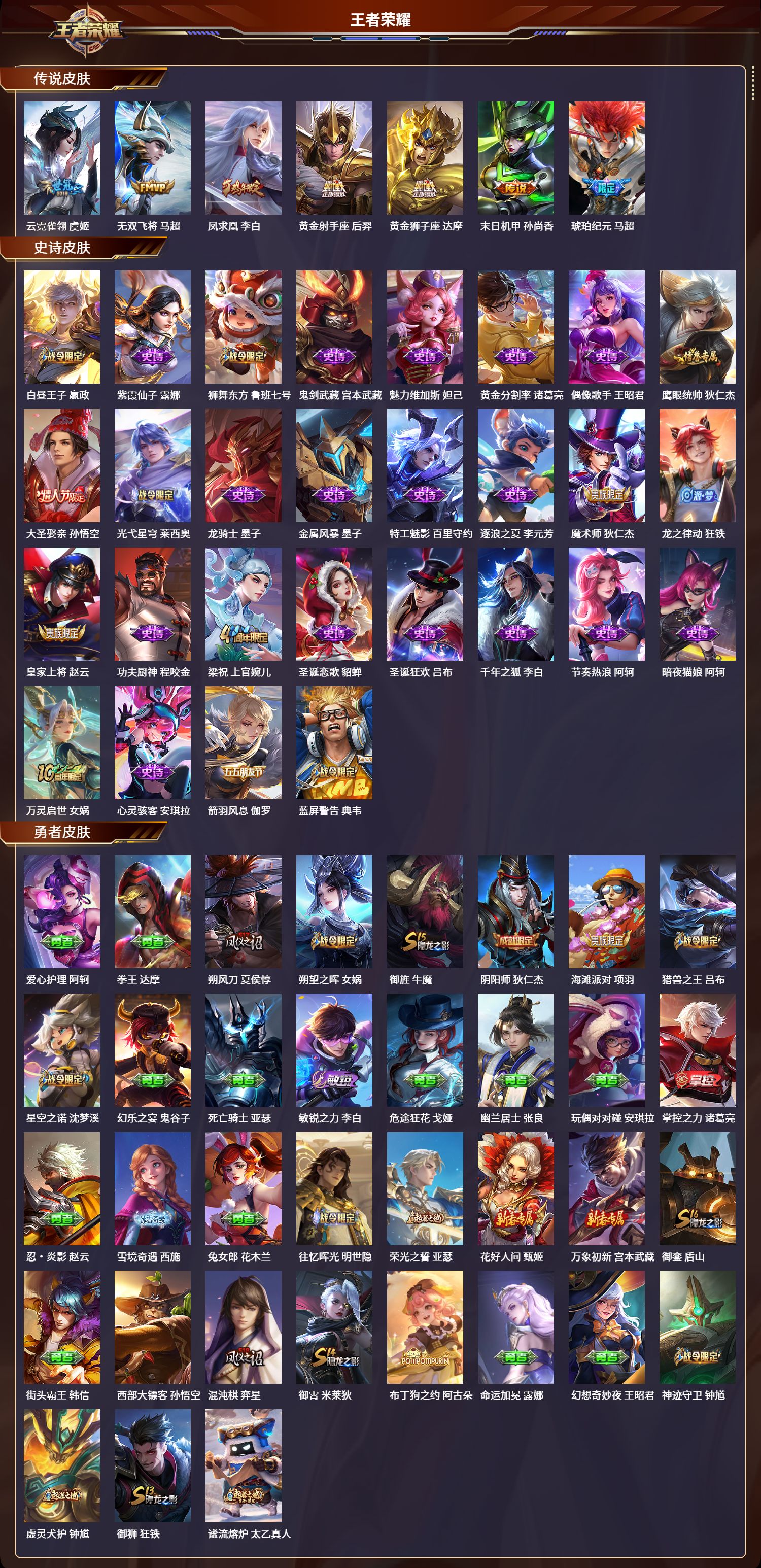安卓qq/至圣王者/99皮肤/111英雄/0典藏/0珍品无双/0无双/0珍品传说/7传说/28史诗/9稀有英雄【7 传说皮肤】云霓雀翎 虞姬无双飞将 马超凤求凰 李白黄金射手座 后羿黄金狮子座 达摩末日机甲 孙尚香琥珀纪元 马超【28 史诗皮肤】白昼王子 嬴政紫霞仙子 露娜狮舞东方 鲁班七号鬼剑武藏 宫本武藏魅力维加斯 妲己黄金分割率 诸葛亮偶像歌手 王昭君鹰眼统帅 狄