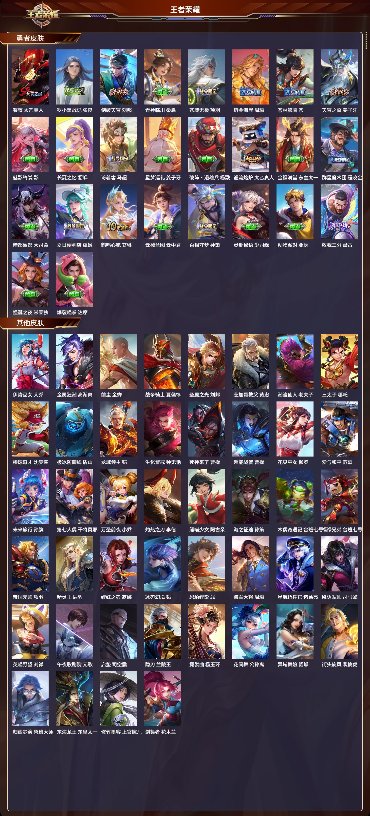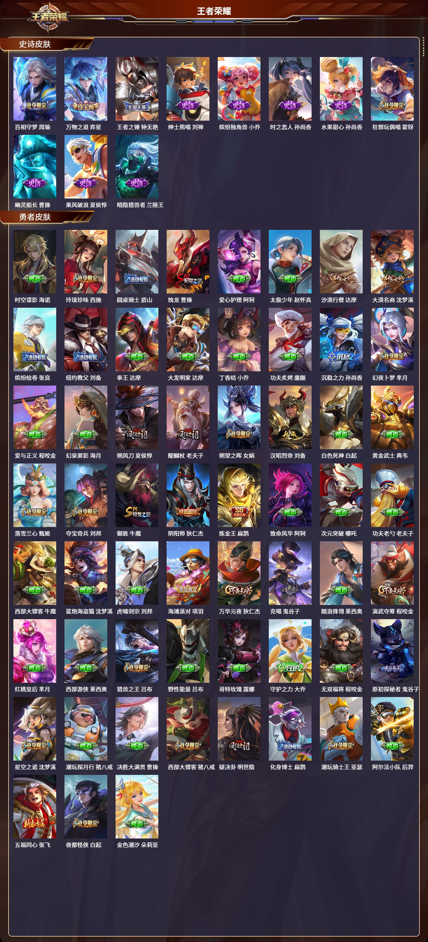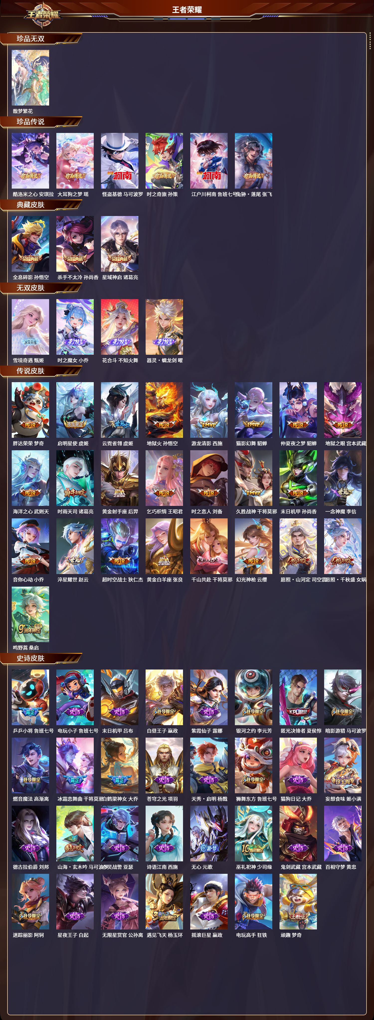 安卓qq/无双王者/385皮肤/126英雄/3典藏/1珍品无双/4无双/6珍品传说/25传说/112史诗/10稀有英雄【1 珍品无双】馥梦繁花【6 珍品传说】酷洛米之心 安琪拉大耳狗之梦 瑶怪盗基德 马可波罗时之奇旅 孙策江户川柯南 鲁班七号兔狲·蓬尾 张飞【3 典藏皮肤】全息碎影 孙悟空杀手不太冷 孙尚香星域神启 诸葛亮【4 无双皮肤】雪境奇遇 甄姬时之魔女 小乔花合斗