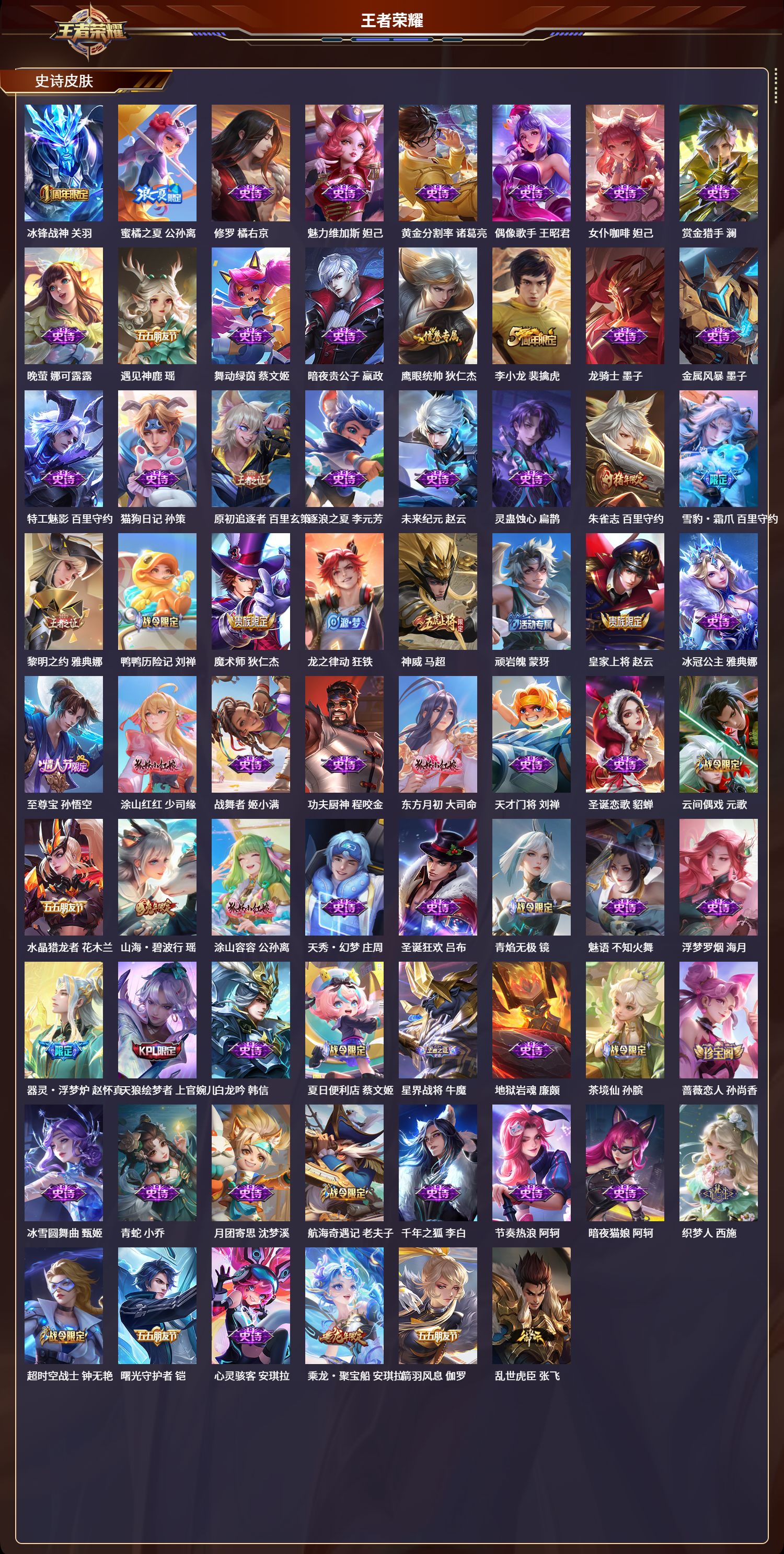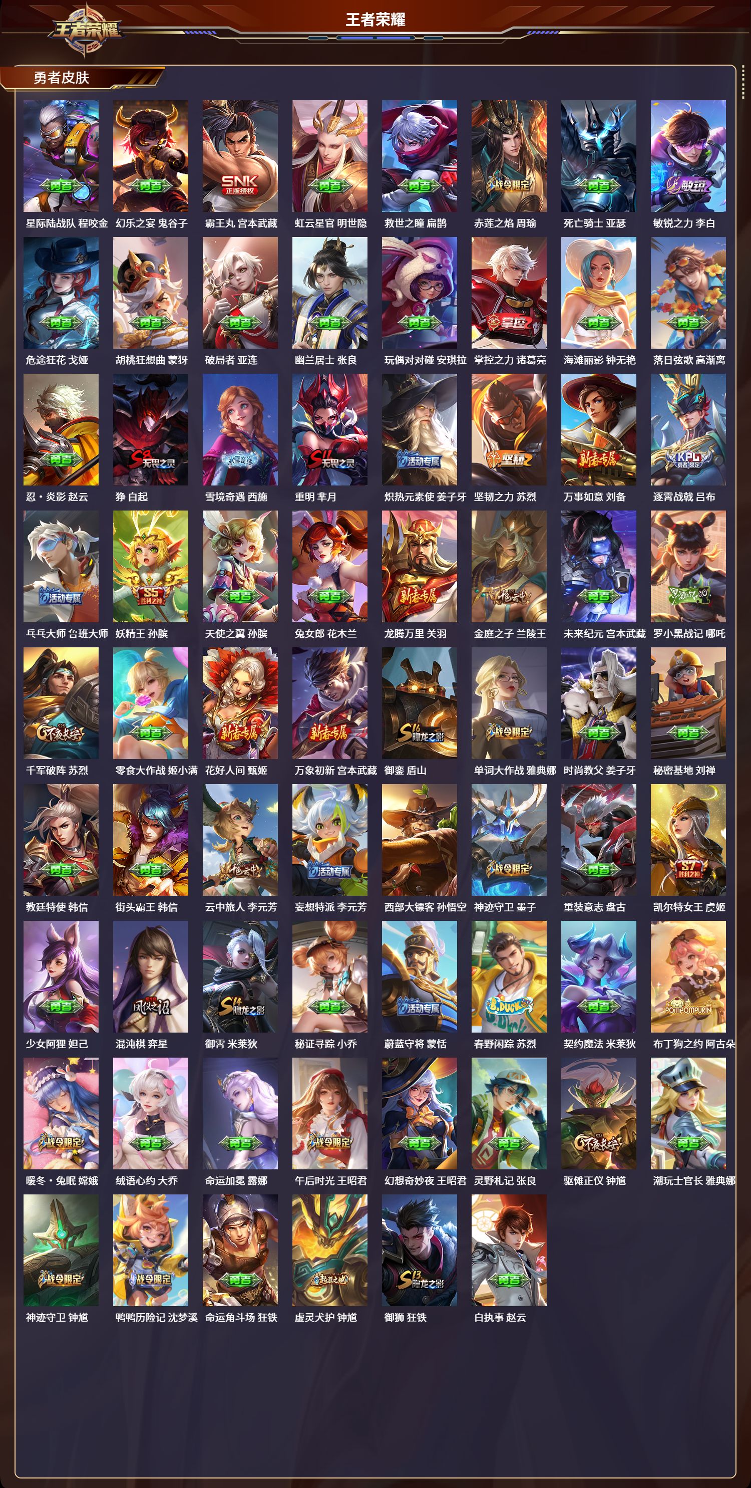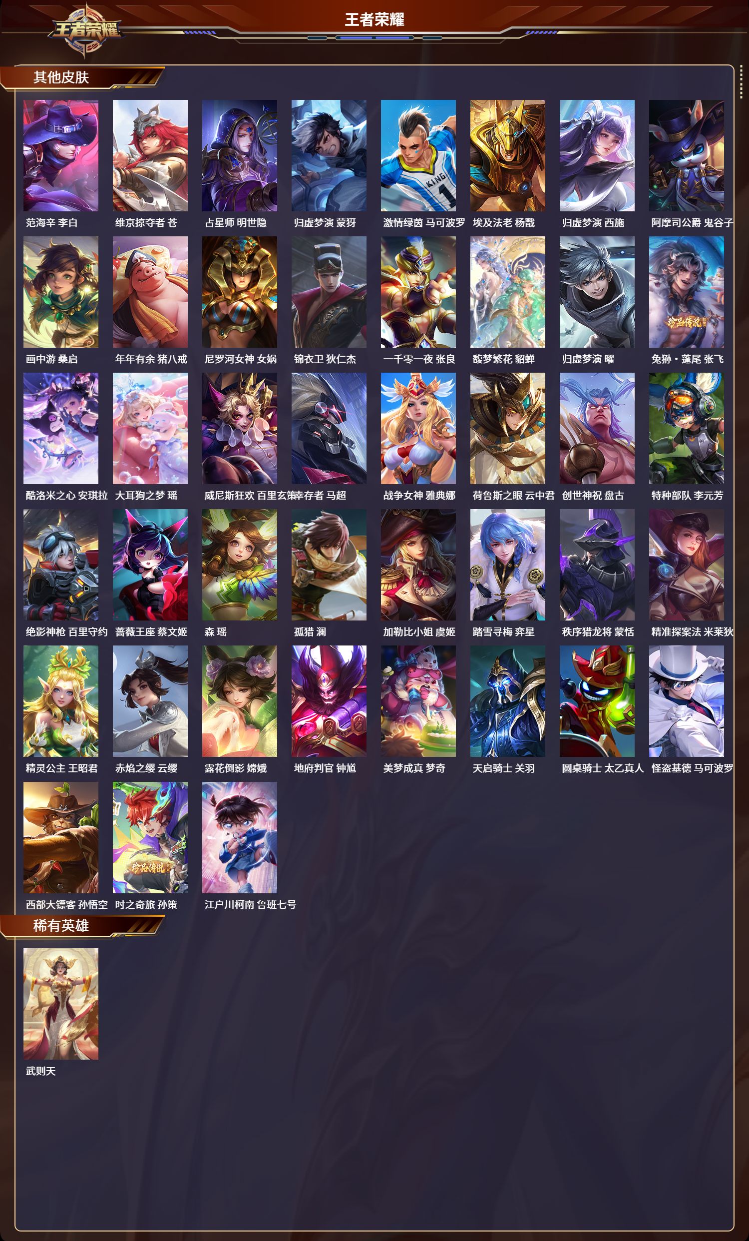 安卓qq/无双王者/385皮肤/126英雄/3典藏/1珍品无双/4无双/6珍品传说/25传说/112史诗/10稀有英雄【1 珍品无双】馥梦繁花【6 珍品传说】酷洛米之心 安琪拉大耳狗之梦 瑶怪盗基德 马可波罗时之奇旅 孙策江户川柯南 鲁班七号兔狲·蓬尾 张飞【3 典藏皮肤】全息碎影 孙悟空杀手不太冷 孙尚香星域神启 诸葛亮【4 无双皮肤】雪境奇遇 甄姬时之魔女 小乔花合斗