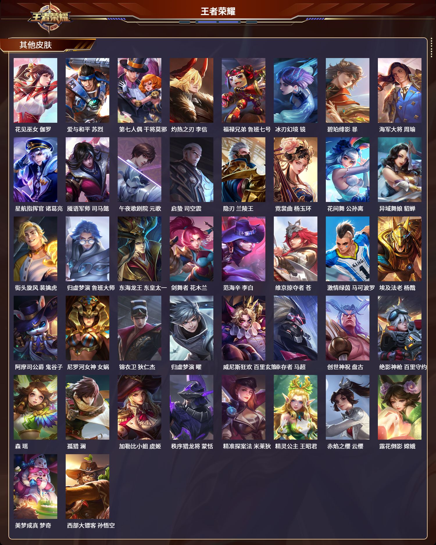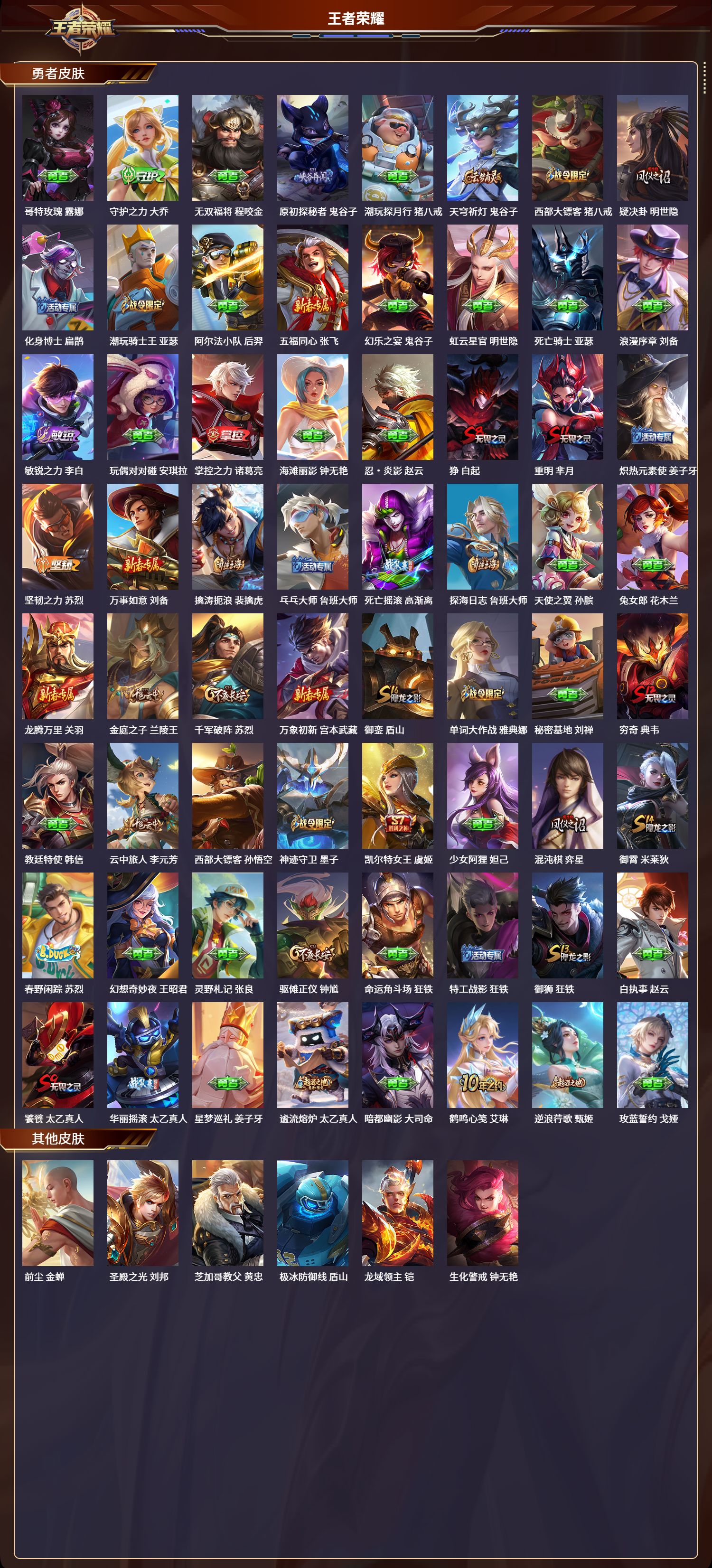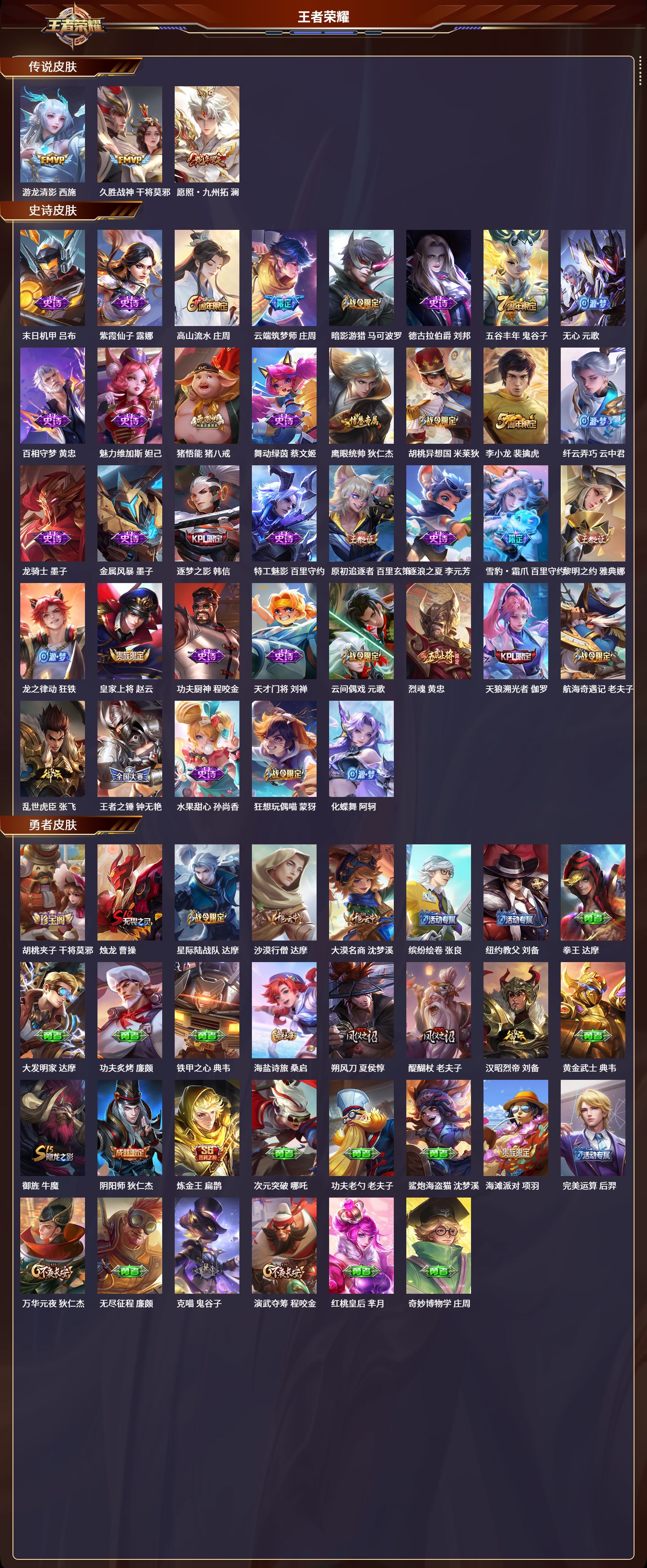安卓qq/永恒钻石/182皮肤/123英雄/0典藏/0珍品无双/0无双/0珍品传说/3传说/37史诗/7稀有英雄【3 传说皮肤】游龙清影 西施久胜战神 干将莫邪愿照·九州拓 澜【37 史诗皮肤】末日机甲 吕布紫霞仙子 露娜高山流水 庄周云端筑梦师 庄周暗影游猎 马可波罗德古拉伯爵 刘邦五谷丰年 鬼谷子无心 元歌百相守梦 黄忠魅力维加斯 妲己猪悟能 猪八戒舞动绿茵 蔡文姬