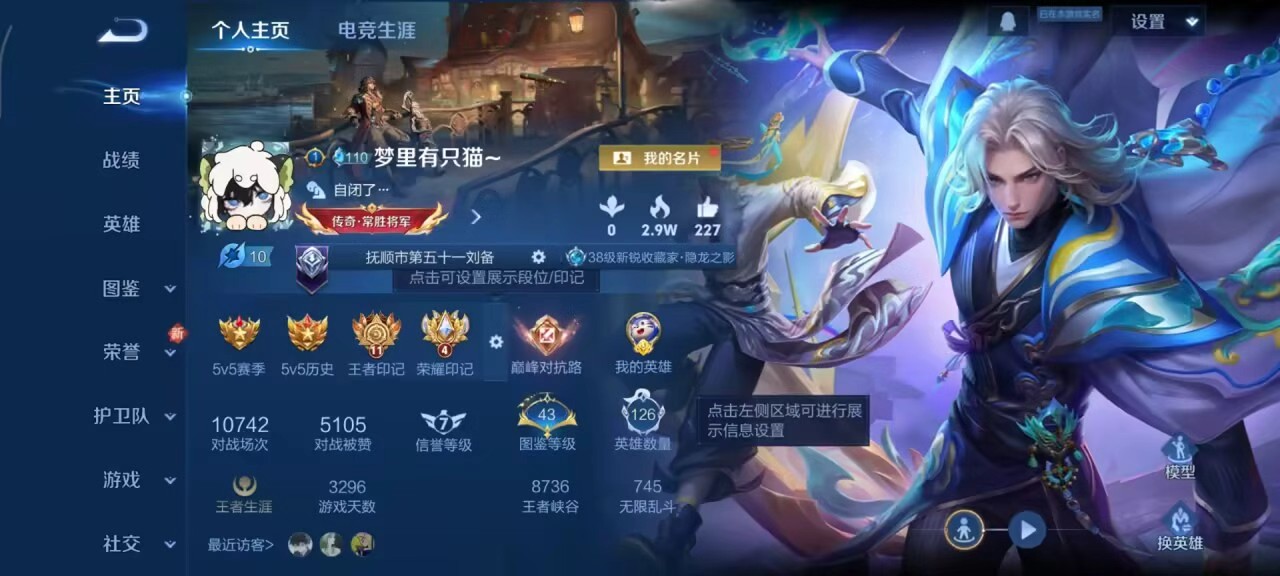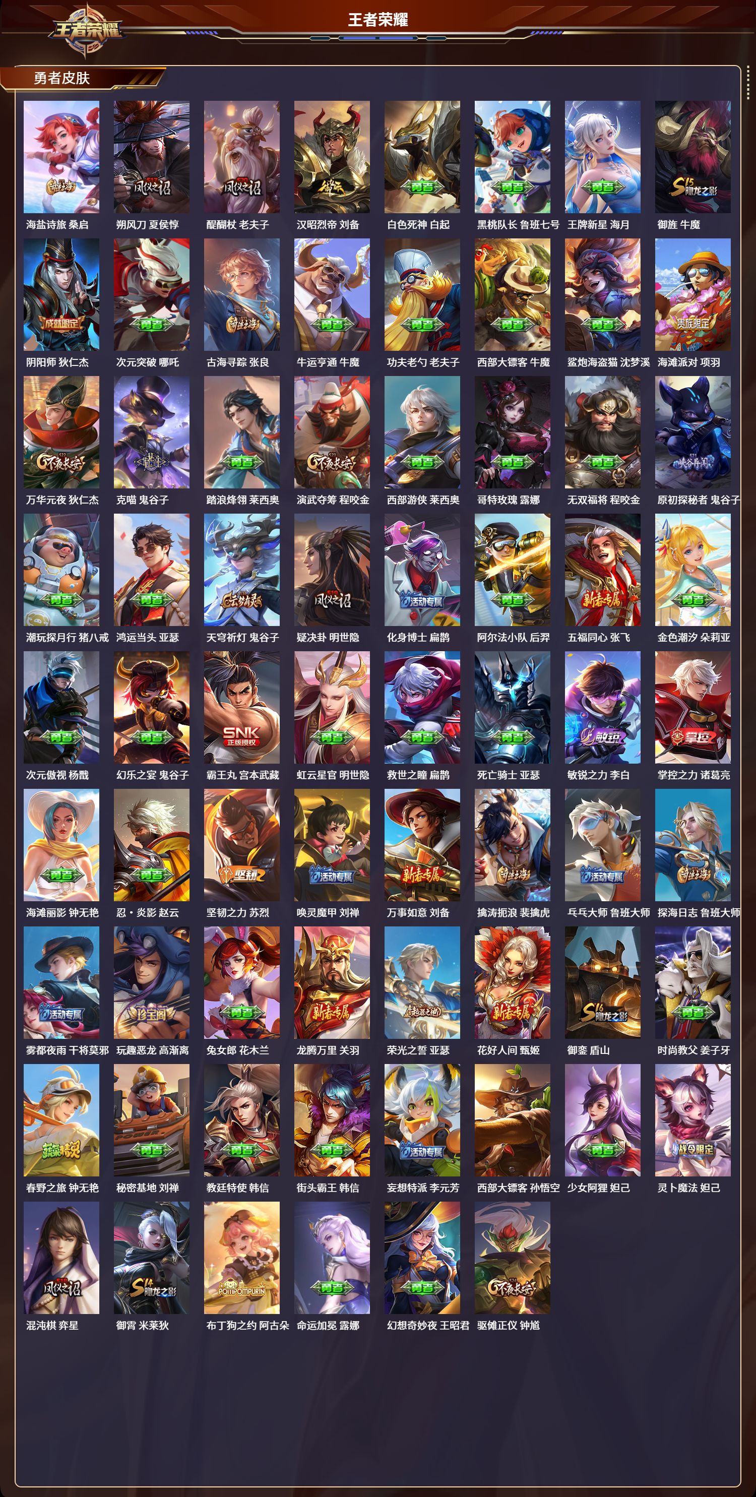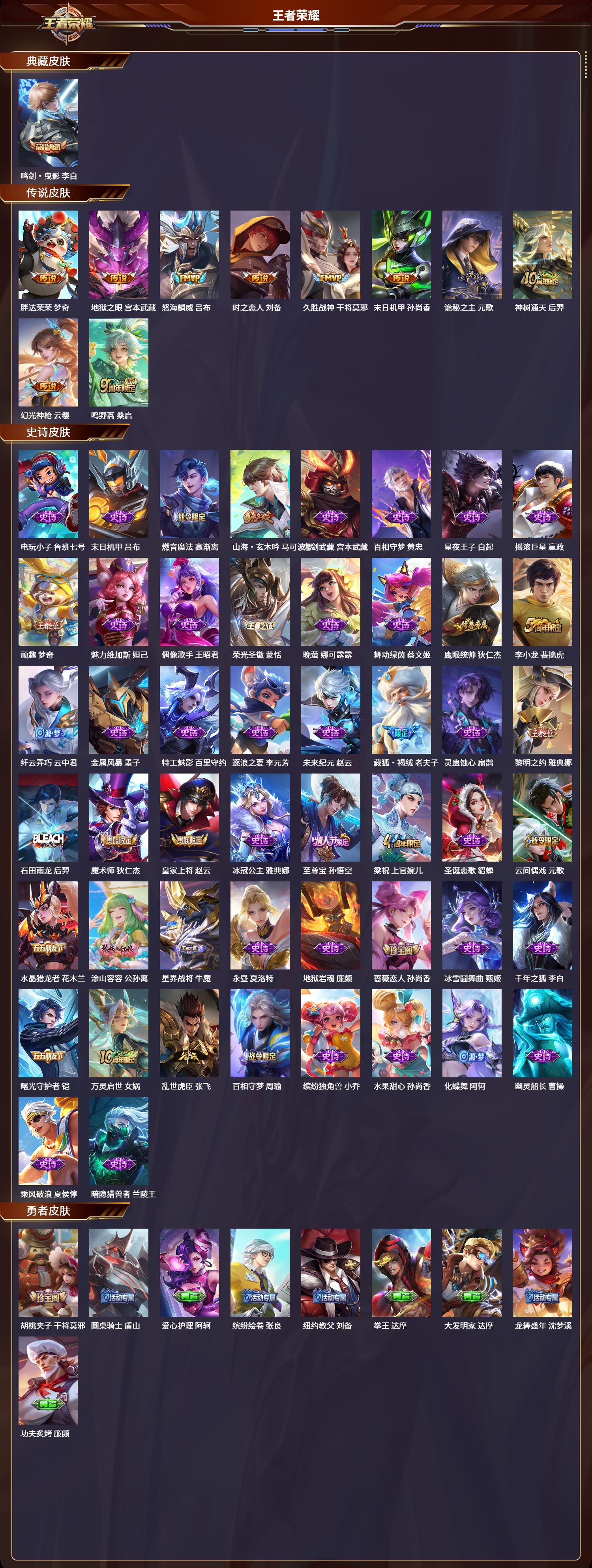安卓qq/至圣王者/194皮肤/124英雄/1典藏/0珍品无双/0无双/0珍品传说/10传说/50史诗/8稀有英雄【1 典藏皮肤】鸣剑·曳影 李白【10 传说皮肤】胖达荣荣 梦奇地狱之眼 宫本武藏怒海麟威 吕布时之恋人 刘备久胜战神 干将莫邪末日机甲 孙尚香诡秘之主 元歌神树通天 后羿幻光神呛 云缨鸣野蒿 桑启【50 史诗皮肤】电玩小子 鲁班七号末日机甲 吕布燃音魔法 高