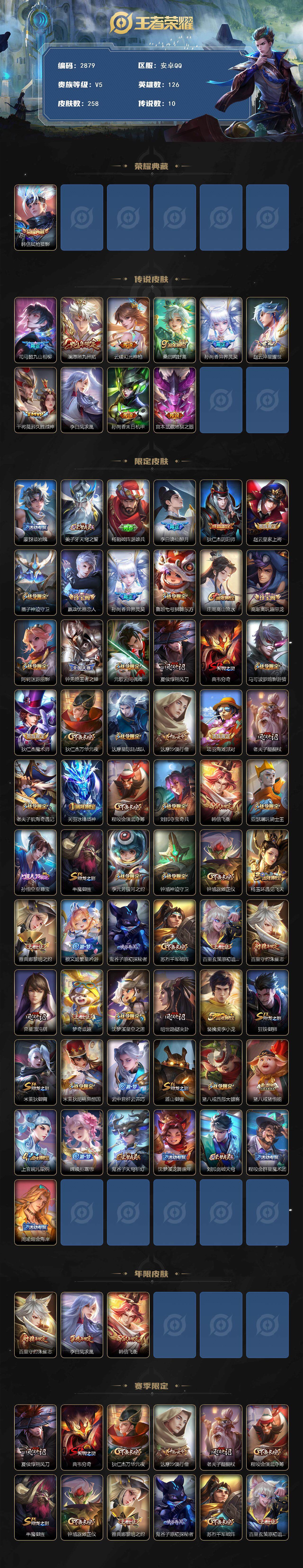 [14378823]安卓q-v5-最强王者段位-126英雄-258皮肤-1典藏-0珍品无双-0无双-0珍品传说-10传说-76史诗 【英雄全皮】:司马懿全皮 【荣耀典藏】:韩信弑呛猎影 【传说皮肤】:司马懿九山相柳,澜愿照九州拓,云缨幻光神呛,桑启鸣野蒿,孙尚香异界灵契,赵云淬星耀世,干将莫邪久胜战神,李白凤求凰,孙尚香末日机甲,宫本武藏地狱之眼 【限定皮肤】:蒙犽顽岩魄,姜子牙天穹之誓,杨戬破阵退雄兵,李白谪仙醉月,狄仁杰阴阳师,赵云皇家上将,墨子神迹守卫,嬴政优雅恋人,孙尚香异界灵契,鲁班七号狮舞东方,庄周高山流水,高渐离玩趣恶龙,阿轲迷踪丽影,钟无艳王者之锤,元歌云间偶戏,夏侯惇朔风刀,典韦穷奇,马可波罗暗影游猎,狄仁杰魔术师,狄仁杰万华元夜,达摩星际陆战队,达摩沙漠行僧,项羽海滩派对,老夫子醍醐杖,老夫子航海奇遇记,关羽冰锋战神,程咬金演武夺筹,刘邦夺宝奇兵,韩信飞衡,亚瑟潮玩骑士王,孙悟空至尊宝,牛魔御旌,李元芳银河之约,钟馗神迹守卫,钟馗驱傩正仪,杨玉环遇见飞天,雅典娜黎明之约,蔡文姬繁星吟游,鬼谷子原初探秘者,苏烈千军破阵,百里玄策原初追逐者,百里守约朱雀志,弈星混沌棋,梦奇顽趣,沈梦溪星空之诺,明世隐疑决卦,裴擒虎李小龙,狂铁御狮,米莱狄御霄,米莱狄胡桃异想国,云中君纤云弄巧,盾山御銮,猪八戒西部大镖客,猪八戒猪悟能,上官婉儿梁祝,嫦娥拒霜思,鬼谷子天穹祈灯,沈梦溪龙舞盛年,刘邦剑破天穹,程咬金群星魔术团,周瑜熔金海岸 【年限皮肤】:百里守约朱雀志,李白凤求凰,韩信飞衡 【赛季限定】:夏侯惇朔风刀,典韦穷奇,狄仁杰万华元夜,达摩沙漠行僧,老夫子醍醐杖,程咬金演武夺筹,牛魔御旌,钟馗驱傩正仪,雅典娜黎明之约,鬼谷子原初探秘者,苏烈千军破阵,百里玄策原初追逐者,弈星混沌棋,梦奇顽趣,明世隐疑决卦,狂铁御狮,米莱狄御霄,盾山御銮,鬼谷子天穹祈灯,刘邦剑破天穹,姜子牙天穹之誓 【战令限定】:墨子神迹守卫,鲁班七号狮舞东方,阿轲迷踪丽影,元歌云间偶戏,马可波罗暗影游猎,达摩星际陆战队,老夫子航海奇遇记,刘邦夺宝奇兵,亚瑟潮玩骑士王,李元芳银河之约,钟馗神迹守卫,沈梦溪星空之诺,米莱狄胡桃异想国,猪八戒西部大镖客 【史诗皮肤】:鲁班七号电玩小子,项羽苍穹之光,露娜紫霞仙子,钟无艳王者之锤,赵云皇家上将,赵云未来纪元,甄姬冰雪圆舞曲,狄仁杰魔术师,宫本武藏鬼剑武藏,孙尚香水果甜心,