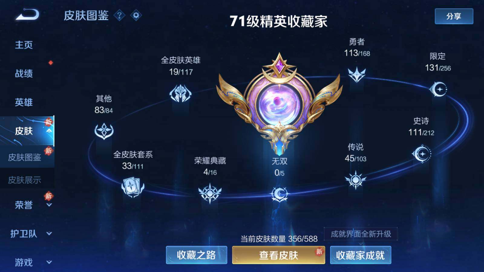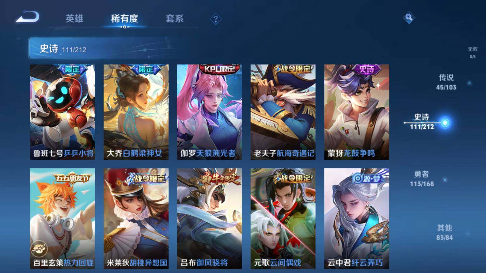 _2294938-wx-v10-永恒钻石ii段位-124英雄-370皮肤-4典藏-0珍品无双-0无双-0珍品传说-46传说-116史诗 【英雄全皮】:娜可露露全皮,橘右京全皮,李信全皮,鲁班大师全皮,蒙恬全皮,金蝉全皮 【荣耀典藏】:武则天英雄,孙悟空全息碎影,小乔天鹅之梦,诸葛亮星域神启,关羽赤影疾锋 【传说皮肤】:桑启鸣野蒿,艾琳觅芳踪,花木兰燃星之曲,虞姬无限倾心,项羽无限倾心,伽罗炽翼辉光,孙悟空齐天大圣,小乔山海琳琅生,曜山海苍雷引,李信山海炽霜斩,李白诗剑行,狄仁杰神器狴犴令,不知火舞绯月行,王昭君星穹之声,橘右京枫霜尽,娜可露露前尘镜,马可波罗深海之息,后羿无尽星芒,孙策挚爱之约,蔡文姬花朝如约,女娲补天,孙策末日机甲,瑶时之祈愿,裴擒虎寅虎赤拳,鲁班七号寅虎瑞焰,孙尚香异界灵契,貂蝉遇见胡旋,王昭君乞巧织情,曜李,周瑜音你心动,诸葛亮时雨天司,虞姬启明星使,孙悟空零号赤焰,关羽武圣,曜云鹰飞将,李信一念神魔,虞姬云霓雀翎,达摩黄金狮子座,梦奇胖达荣荣,李白凤求凰,孙尚香末日机甲,宫本武藏地狱之眼,孙悟空地狱火,吕布天魔缭乱,武则天海洋之心,狄仁杰超时空战士 【限定皮肤】:白起狰,姜子牙天穹之誓,狄仁杰阴阳师,小乔纯白花嫁,虞姬凯尔特女王,廉颇寅虎御盾,小乔山海琳琅生,赵云皇家上将,赵云龙胆,赵云百木心呛,墨子神迹守卫,墨子降魔,妲己热情桑巴,妲己时之奇旅,孙尚香蔷薇恋人,孙尚香异界灵契,鲁班七号乒乒小将,鲁班七号寅虎瑞焰,高渐离死亡摇滚,钟无艳王者之锤,钟无艳超时空战士,孙膑妖精王,孙膑寅虎展翼,扁鹊炼金王,白起夜都怪侠,芈月幻夜卜梦,吕布天魔缭乱,吕布御风骁将,周瑜真爱至上,元歌云间偶戏,甄姬女儿国国王,甄姬游园惊梦,甄姬落雪兰心,曹操烛龙,典韦穷奇,典韦岱宗,马可波罗逐梦之星,马可波罗暗影游猎,马可波罗深海之息,马可波罗山海玄木吟,狄仁杰魔术师,狄仁杰万华元夜,狄仁杰神器狴犴令,达摩星际陆战队,达摩沙漠行僧,项羽海滩派对,项羽无限倾心,老夫子醍醐杖,老夫子航海奇遇记,关羽冰锋战神,关羽武圣,貂蝉遇见胡旋,程咬金演武夺筹,露娜一生所爱,韩信逐梦之影,韩信傲雪梅呛,王昭君午后时光,王昭君星穹之声,兰陵王金庭之子,花木兰燃星之曲,不知火舞绯月行,娜可露露前尘镜,橘右京枫霜尽,亚瑟潮玩骑士王,孙悟空美猴王,孙悟空零号赤焰,孙悟空孙行者,孙悟空齐天大圣,后羿如梦