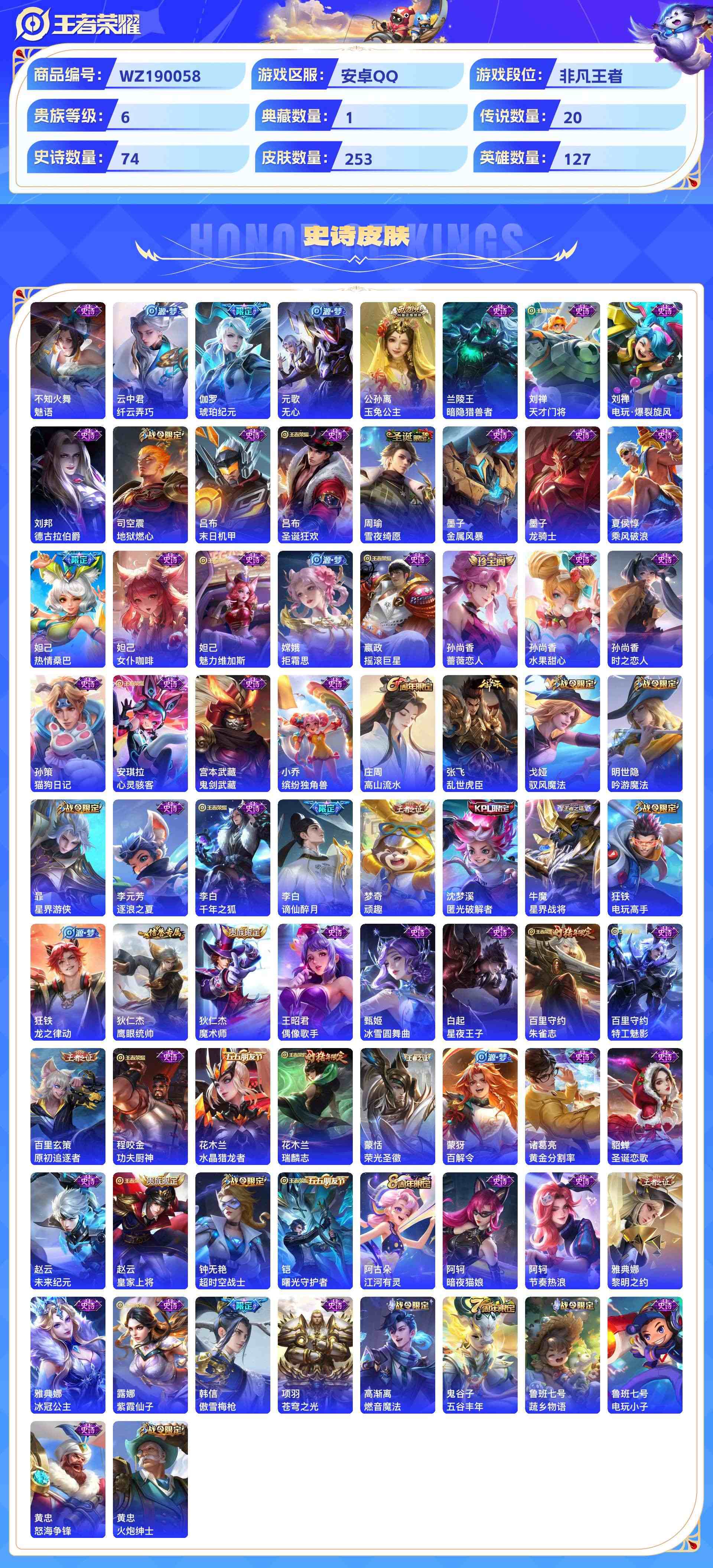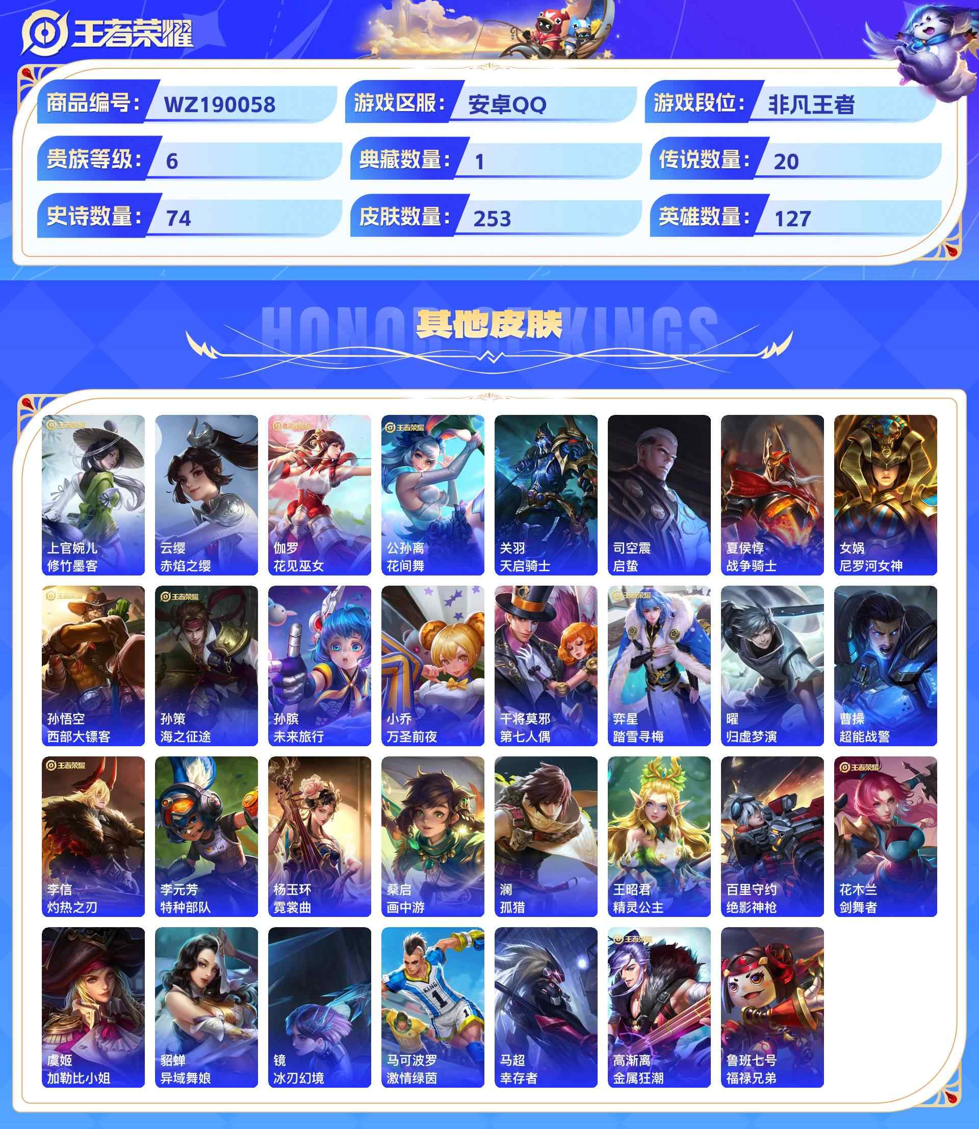 wz190058|精品号可二次【荣耀典藏】天鹅之梦【传说皮肤】绯月行浮生妄挚爱花嫁乘龙·问璇玑异界灵契末日机甲齐天大圣末日机甲挚爱之约地狱之眼山海·琳琅生久胜战神画中仙鸣野蒿启明星使愿照·岁时盈武陵仙君乘龙·铭钟鼎炽阳神光深海之息安卓qq 贵族8级 253皮 1典藏 20传说 74史诗2星传说9个性按键