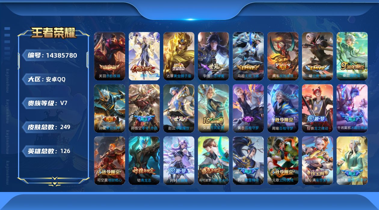 [14385780]安卓q-v7-最强王者段位-126英雄-249皮肤-1典藏皮肤-10传说-66史诗 【英雄全皮】:蒙恬全皮,司空震全皮,空空儿全皮,影全皮 【荣耀典藏】:关羽赤影疾锋 【传说皮肤】:司空震愿照山河定,桑启鸣野蒿,典韦战鼓燎原,马超无双飞将,孙策末日机甲,赵云淬星耀世,孙悟空零号赤焰,曜云鹰飞将,李信一念神魔,达摩黄金狮子座 【限定皮肤】:狄仁杰阴阳师,赵云皇家上将,孙尚香蔷薇恋人,庄周高山流水,高渐离玩趣恶龙,元歌云间偶戏,元歌无心,马可波罗山海玄木吟,狄仁杰魔术师,狄仁杰万华元夜,达摩沙漠行僧,项羽海滩派对,程咬金演武夺筹,韩信傲雪梅呛,王昭君午后时光,兰陵王金庭之子,孙悟空零号赤焰,李元芳匿光侦查者,李元芳云中旅人,钟馗驱傩正仪,干将莫邪冰霜恋舞曲,鬼谷子五谷丰年,铠青龙志,苏烈千军破阵,百里玄策原初追逐者,沈梦溪大漠名商,裴擒虎李小龙,裴擒虎擒涛扼浪,狂铁电玩高手,上官婉儿梁祝,嫦娥暖冬兔眠,西施玲珑珍味,鲁班大师探海日志,桑启海盐诗旅,暃星界游侠,戈娅驭风魔法,艾琳流音漫舞,司空震地狱燃心,阿古朵江河有灵,张良古海寻踪,蒙犽百解令,蒙恬荣光圣徽,高渐离燃音魔法,妲己灵卜魔法,鬼谷子天穹祈灯,姬小满妄想食味,沈梦溪龙舞盛年,刘邦剑破天穹 【年限皮肤】:铠青龙志,马可波罗山海玄木吟 【赛季限定】:狄仁杰万华元夜,达摩沙漠行僧,程咬金演武夺筹,兰陵王金庭之子,张良古海寻踪,李元芳云中旅人,钟馗驱傩正仪,苏烈千军破阵,百里玄策原初追逐者,沈梦溪大漠名商,裴擒虎擒涛扼浪,鲁班大师探海日志,桑启海盐诗旅,鬼谷子天穹祈灯,蒙恬荣光圣徽,刘邦剑破天穹 【战令限定】:元歌云间偶戏,王昭君午后时光,艾琳流音漫舞,狂铁电玩高手,嫦娥暖冬兔眠,西施玲珑珍味,司空震地狱燃心,暃星界游侠,戈娅驭风魔法,高渐离燃音魔法,妲己灵卜魔法 【史诗皮肤】:露娜紫霞仙子,赵云皇家上将,赵云未来纪元,甄姬冰雪圆舞曲,王昭君偶像歌手,狄仁杰魔术师,宫本武藏鬼剑武藏,孙尚香蔷薇恋人,孙尚香水果甜心,嬴政摇滚巨星,妲己魅力维加斯,妲己女仆咖啡,墨子龙骑士,墨子金属风暴,吕布圣诞狂欢,曹操幽灵船长,李白千年之狐,吕布末日机甲,张飞乱世虎臣,花木兰水晶猎龙者,刘邦德古拉伯爵,夏侯惇乘风破浪,兰陵王暗隐猎兽者,雅典娜冰冠公主,百里守约特工魅影,铠曙光守护者,程咬金功夫厨神,白起星夜王子,阿轲节奏热浪,铠青龙志
