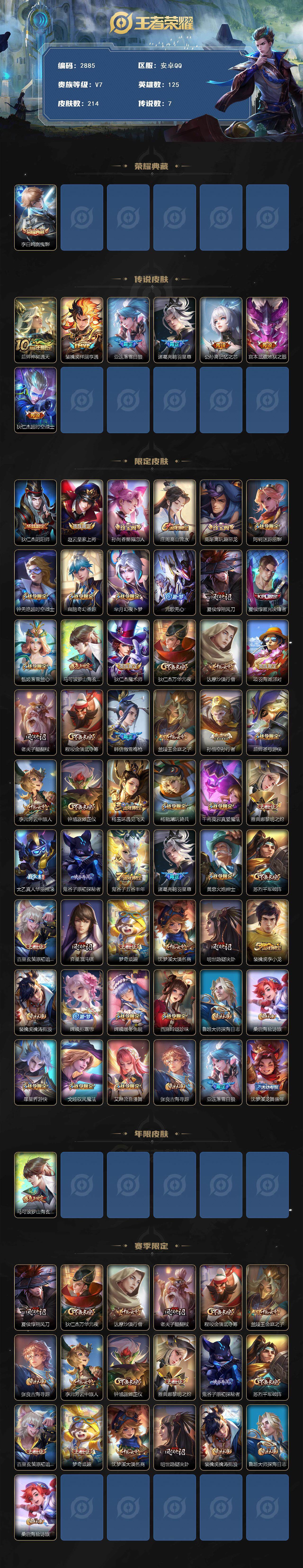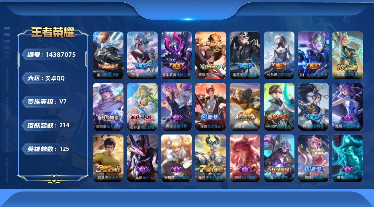 [14387075]安卓q-v7-最强王者段位-125英雄-214皮肤-1典藏-0珍品无双-0无双-0珍品传说-7传说-50史诗 【荣耀典藏】:李白鸣剑曳影 【传说皮肤】:后羿神树通天,裴擒虎祥瑞亨通,亚连落雪白狼,诸葛亮鹤羽星尊,公孙离记忆之芯,宫本武藏地狱之眼,狄仁杰超时空战士 【限定皮肤】:狄仁杰阴阳师,赵云皇家上将,孙尚香蔷薇恋人,庄周高山流水,高渐离玩趣恶龙,阿轲迷踪丽影,钟无艳超时空战士,扁鹊奇幻香踪,芈月幻夜卜梦,元歌无心,夏侯惇朔风刀,夏侯惇匿光决锋者,甄姬落雪兰心,马可波罗山海玄木吟,狄仁杰魔术师,狄仁杰万华元夜,达摩沙漠行僧,项羽海滩派对,老夫子醍醐杖,程咬金演武夺筹,韩信傲雪梅呛,兰陵王金庭之子,孙悟空孙行者,后羿圣弓游侠,李元芳云中旅人,钟馗驱傩正仪,杨玉环遇见飞天,杨戬潮玩骑兵,干将莫邪真爱魔法,雅典娜黎明之约,太乙真人华丽摇滚,鬼谷子原初探秘者,鬼谷子五谷丰年,诸葛亮鹤羽星尊,黄忠火炮绅士,苏烈千军破阵,百里玄策原初追逐者,弈星混沌棋,梦奇顽趣,沈梦溪大漠名商,明世隐疑决卦,裴擒虎李小龙,裴擒虎擒涛扼浪,嫦娥拒霜思,嫦娥暖冬兔眠,西施玲珑珍味,鲁班大师探海日志,桑启海盐诗旅,暃星界游侠,戈娅驭风魔法,艾琳流音漫舞,张良古海寻踪,亚连落雪白狼,沈梦溪龙舞盛年 【年限皮肤】:马可波罗山海玄木吟 【赛季限定】:夏侯惇朔风刀,狄仁杰万华元夜,达摩沙漠行僧,老夫子醍醐杖,程咬金演武夺筹,兰陵王金庭之子,张良古海寻踪,李元芳云中旅人,钟馗驱傩正仪,雅典娜黎明之约,鬼谷子原初探秘者,苏烈千军破阵,百里玄策原初追逐者,弈星混沌棋,梦奇顽趣,沈梦溪大漠名商,明世隐疑决卦,裴擒虎擒涛扼浪,鲁班大师探海日志,桑启海盐诗旅 【战令限定】:阿轲迷踪丽影,钟无艳超时空战士,扁鹊奇幻香踪,芈月幻夜卜梦,甄姬落雪兰心,艾琳流音漫舞,后羿圣弓游侠,杨戬潮玩骑兵,干将莫邪真爱魔法,黄忠火炮绅士,嫦娥暖冬兔眠,西施玲珑珍味,暃星界游侠,戈娅驭风魔法 【史诗皮肤】:赵云皇家上将,赵云未来纪元,貂蝉圣诞恋歌,甄姬冰雪圆舞曲,狄仁杰魔术师,宫本武藏鬼剑武藏,孙尚香蔷薇恋人,孙尚香水果甜心,妲己魅力维加斯,妲己女仆咖啡,墨子金属风暴,吕布圣诞狂欢,曹操幽灵船长,李白千年之狐,刘邦德古拉伯爵,夏侯惇乘风破浪,兰陵王暗隐猎兽者,诸葛亮黄金分割率,刘禅天才门将,李元芳逐浪之夏,阿轲节奏热浪,杨玉环遇见飞天,