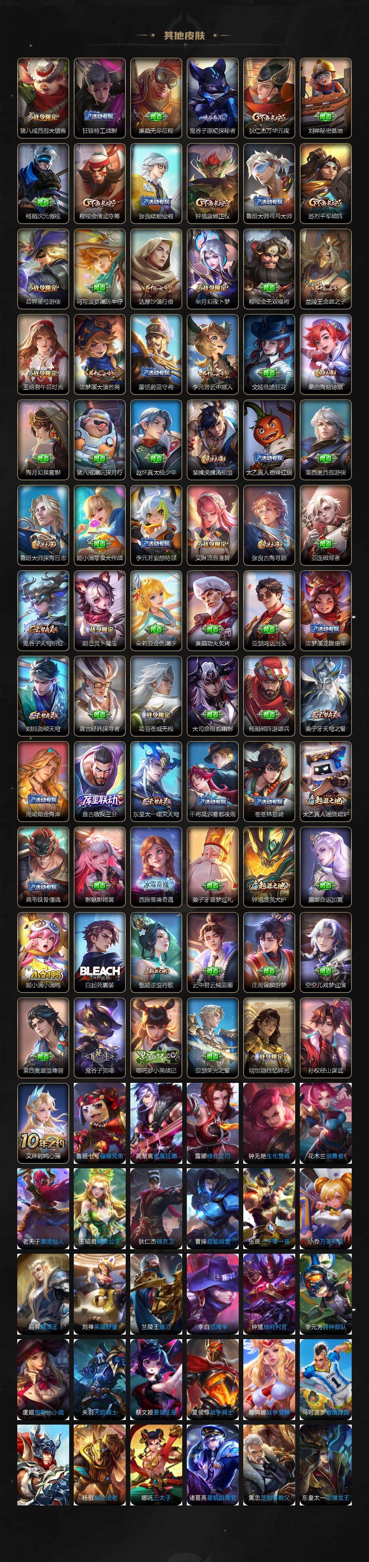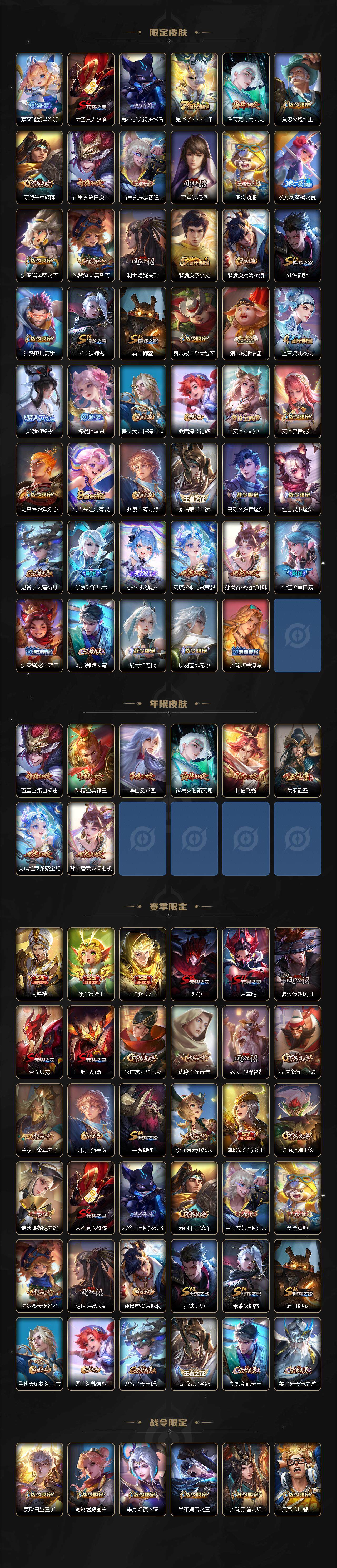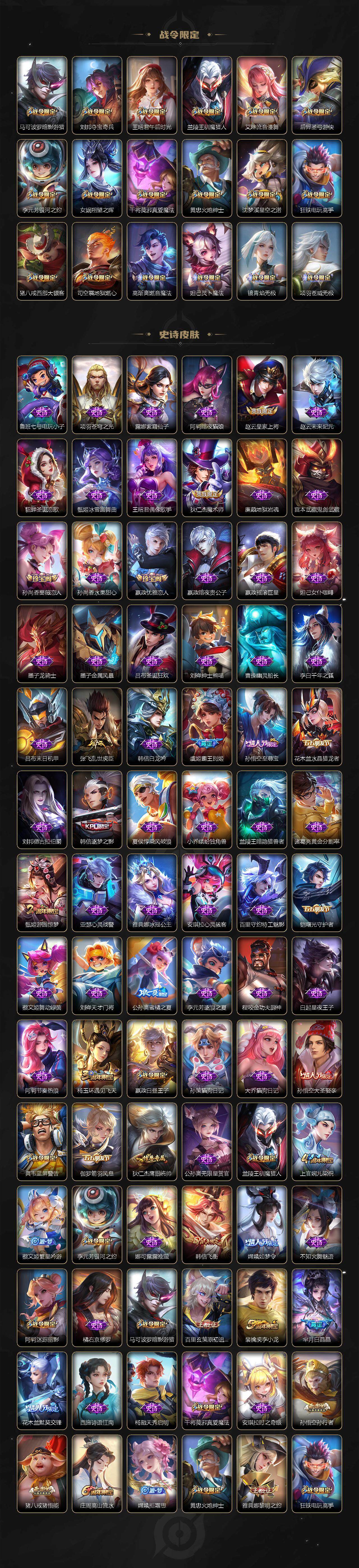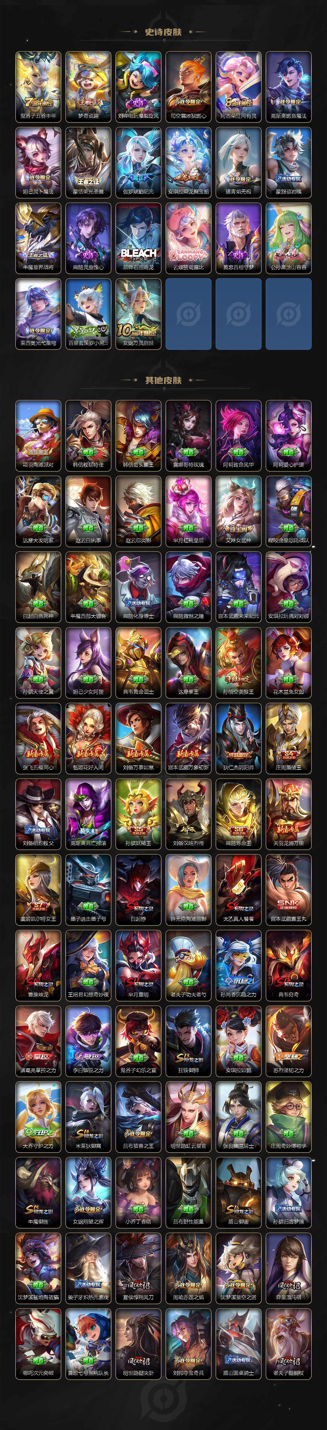 贵族7/皮肤347/典藏1/传说24/史诗104/英雄127/孙权全皮/鬼谷子全皮/猪八戒全皮/蒙恬全皮/空空儿全皮/影全皮/李白鸣剑曳影/小乔时之魔女/宫本武藏幽冥之眼/狄仁杰星际治安官/貂蝉金色仲夏夜/孙尚香未来机甲/后羿神树通天/桑启鸣野蒿/亚连落雪白狼/典韦战鼓燎原/孙尚香乘龙问璇玑/澜逐花归海/公孙离记忆之芯/孙悟空齐天大圣/李白诗剑行/狄仁杰神器狴犴令/马可波罗深海之息/赵云淬星耀世/诸葛亮时雨天司/虞姬启明星使/孙悟空零号赤焰/关羽武圣/达摩黄金狮子座/百里玄策白虎志/后羿黄金射手座/貂蝉仲夏夜之梦/李白凤求凰/孙尚香末日机甲/宫本武藏地狱之眼/狄仁杰超时空战士/白起狰/蒙犽顽岩魄/姜子牙天穹之誓/杨戬破阵退雄兵/狄仁杰阴阳师/虞姬凯尔特女王/赵云皇家上将/嬴政优雅恋人/嬴政白昼王子/孙尚香蔷薇恋人/庄周蜃楼王/庄周高山流水/高渐离死亡摇滚/阿轲迷踪丽影/孙膑妖精王/扁鹊炼金王/芈月重明/芈月白晶晶/芈月幻夜卜梦/吕布猎兽之王/周瑜赤莲之焰/夏侯惇朔风刀/甄姬游园惊梦/曹操烛龙/典韦穷奇/典韦蓝屏警告/马可波罗暗影游猎/狄仁杰魔术师/狄仁杰万华元夜/达摩沙漠行僧/项羽海滩派对/老夫子醍醐杖/程咬金演武夺筹/刘邦夺宝奇兵/韩信逐梦之影/韩信飞衡/王昭君午后时光/兰陵王驯魔猎人/兰陵王金庭之子/花木兰默契交锋/孙悟空美猴王/孙悟空至尊宝/孙悟空大圣娶亲/孙悟空孙行者/牛魔御旌/后羿圣弓游侠/李元芳银河之约/李元芳云中旅人/虞姬霸王别姬/钟馗驱傩正仪/杨玉环遇见飞天/女娲朔望之晖/干将莫邪真爱魔法/雅典娜黎明之约/蔡文姬繁星吟游/太乙真人饕餮/鬼谷子原初探秘者/鬼谷子五谷丰年/黄忠火炮绅士/苏烈千军破阵/百里玄策原初追逐者/弈星混沌棋/梦奇顽趣/公孙离蜜橘之夏/沈梦溪星空之诺/沈梦溪大漠名商/明世隐疑决卦/裴擒虎李小龙/裴擒虎擒涛扼浪/狂铁御狮/狂铁电玩高手/米莱狄御霄/盾山御銮/猪八戒西部大镖客/猪八戒猪悟能/上官婉儿梁祝/嫦娥如梦令/嫦娥拒霜思/鲁班大师探海日志/桑启海盐诗旅/艾琳女武神/艾琳流音漫舞/司空震地狱燃心/阿古朵江河有灵/张良古海寻踪/蒙恬荣光圣徽/高渐离燃音魔法/妲己灵卜魔法/鬼谷子天穹祈灯/伽罗琥珀纪元/安琪拉乘龙聚宝船/沈梦溪龙舞盛年/刘邦剑破天穹/镜青焰无极/项羽苍威无极/周瑜熔金海岸/鲁班七号电玩小子/项羽苍穹之光/露娜紫霞仙子/阿轲暗夜猫娘/赵云未来纪元/貂蝉圣诞恋歌/甄姬冰雪圆舞曲/王昭君偶像歌手/廉颇地狱岩魂/宫本武藏鬼剑武藏/孙尚香水果甜心/嬴政暗夜贵公子/嬴政摇滚巨星/妲己女仆咖啡/墨子龙骑士/墨子金属风暴/吕布圣诞狂欢/刘禅绅士熊喵/曹操幽灵船长/李白千年之狐/吕布末日机甲/张飞乱世虎臣/韩信白龙吟/花木兰水晶猎龙者/刘邦德古拉伯爵/夏侯惇乘风破浪/小乔缤纷独角兽/兰陵王暗隐猎兽者/诸葛亮黄金分割率/亚瑟心灵战警/雅典娜冰冠公主/安琪拉心灵骇客/百里守约特工魅影/铠曙光守护者/蔡文姬舞动绿茵/刘禅天才门将/李元芳逐浪之夏/程咬金功夫厨神/白起星夜王子/阿轲节奏热浪/孙策猫狗日记/大乔猫狗日记/伽罗箭羽风息/狄仁杰鹰眼统帅/公孙离无限星赏官/娜可露露晚萤/不知火舞魅语/橘右京修罗/西施诗语江南/杨戬天秀启明/安琪拉时之奇旅/刘禅电玩爆裂旋风/牛魔星界战将/扁鹊灵蛊蚀心/后羿石田雨龙/云缨赞萌露比/黄忠百相守梦/公孙离涂山容容/莱西奥光弋星穹/百里玄策罗小黑战记/女娲万灵启世/韩信教廷特使/韩信街头霸王/露娜哥特玫瑰/阿轲致命风华/阿轲爱心护理/达摩大发明家/赵云白执事/赵云忍炎影/芈月红桃皇后/程咬金星际陆战队/白起白色死神/牛魔西部大镖客/扁鹊化身博士/扁鹊救世之瞳/宫本武藏未来纪元/安琪拉玩偶对对碰/孙膑天使之翼/妲己少女阿狸/典韦黄金武士/达摩拳王/花木兰兔女郎/张飞五福同心/甄姬花好人间/刘备万事如意/宫本武藏万象初新/刘备纽约教父/刘备汉昭烈帝/关羽龙腾万里/墨子进击墨子号/钟无艳海滩丽影/宫本武藏霸王丸/王昭君幻想奇妙夜/老夫子功夫老勺/孙尚香沉稳之力/诸葛亮掌控之力/李白敏锐之力/鬼谷子幻乐之宴/安琪拉如懿/苏烈坚韧之力/大乔守护之力/明世隐虹云星官/张良幽兰居士/庄周奇妙博物学/小乔丁香结/吕布野性能量/孙膑归虚梦演/沈梦溪鲨炮海盗猫/姜子牙炽热元素使/哪吒次元突破/鲁班七号黑桃队长/盾山圆桌骑士/狂铁特工战影/廉颇无尽征程/刘禅秘密基地/杨戬次元傲视/张良缤纷绘卷/鲁班大师乓乓大师/马可波罗潮玩牛仔/程咬金无双福将/蒙恬蔚蓝守将/戈娅危途狂花/海月幻泉雾影/猪八戒潮玩探月行/赵怀真太极少年/太乙真人劲辣红锅/莱西奥西部游侠/姬小满零食大作战/李元芳妄想特派/亚连破局者/朵莉亚金色潮汐/廉颇功夫炙烤/亚瑟鸿运当头/盘古经纬探寻者/大司命暗都幽影/盘古敬我三分/东皇太一噬灭天穹/干将莫邪雾都夜雨/苍苍林狼骑/太乙真人谧流熔炉/典韦铁骨偃魂/影魅影绮裳/西施雪境奇遇/姜子牙星梦巡礼/钟馗虚灵犬护/露娜命运加冕/姬小满小满鸭/白起死霸装/甄姬逆浪荇歌/云中君云械蓝图/庄周锦麟游梦/空空儿戏梦巡演/莱西奥踏浪烽翎/鬼谷子克喵/哪吒罗小黑战记/亚瑟荣光之誓/明世隐往忆晖光/孙权径山谋武/艾琳鹤鸣心笺/鲁班七号福禄兄弟/高渐离金属狂潮/露娜绯红之刃/钟无艳生化警戒/花木兰剑舞者/老夫子潮流仙