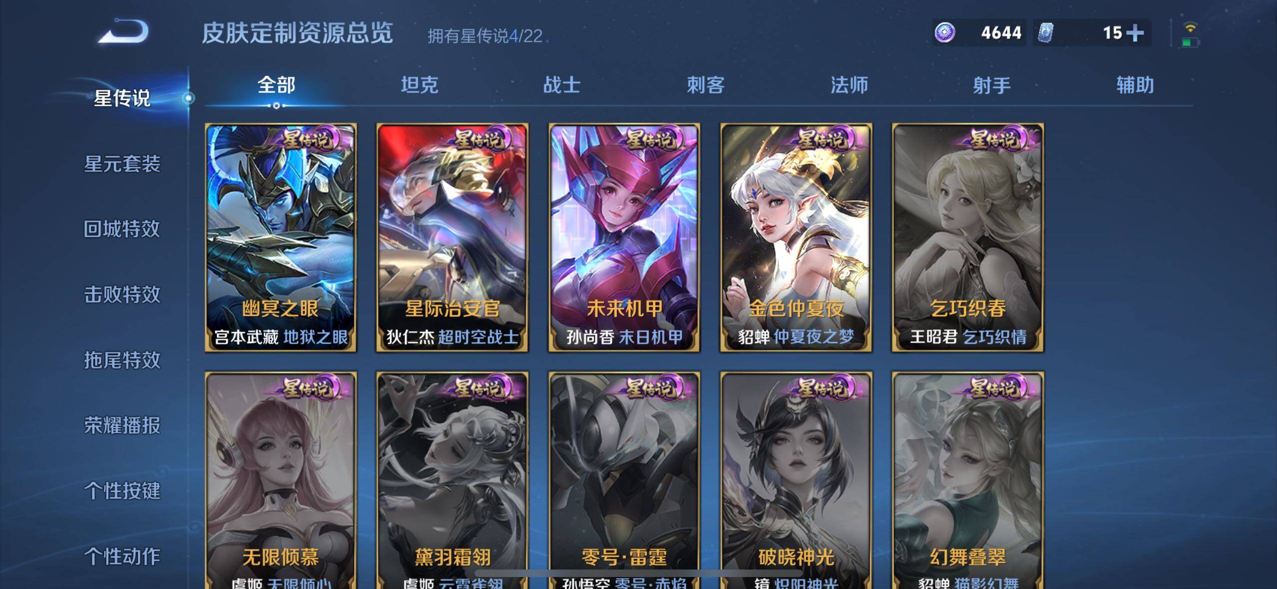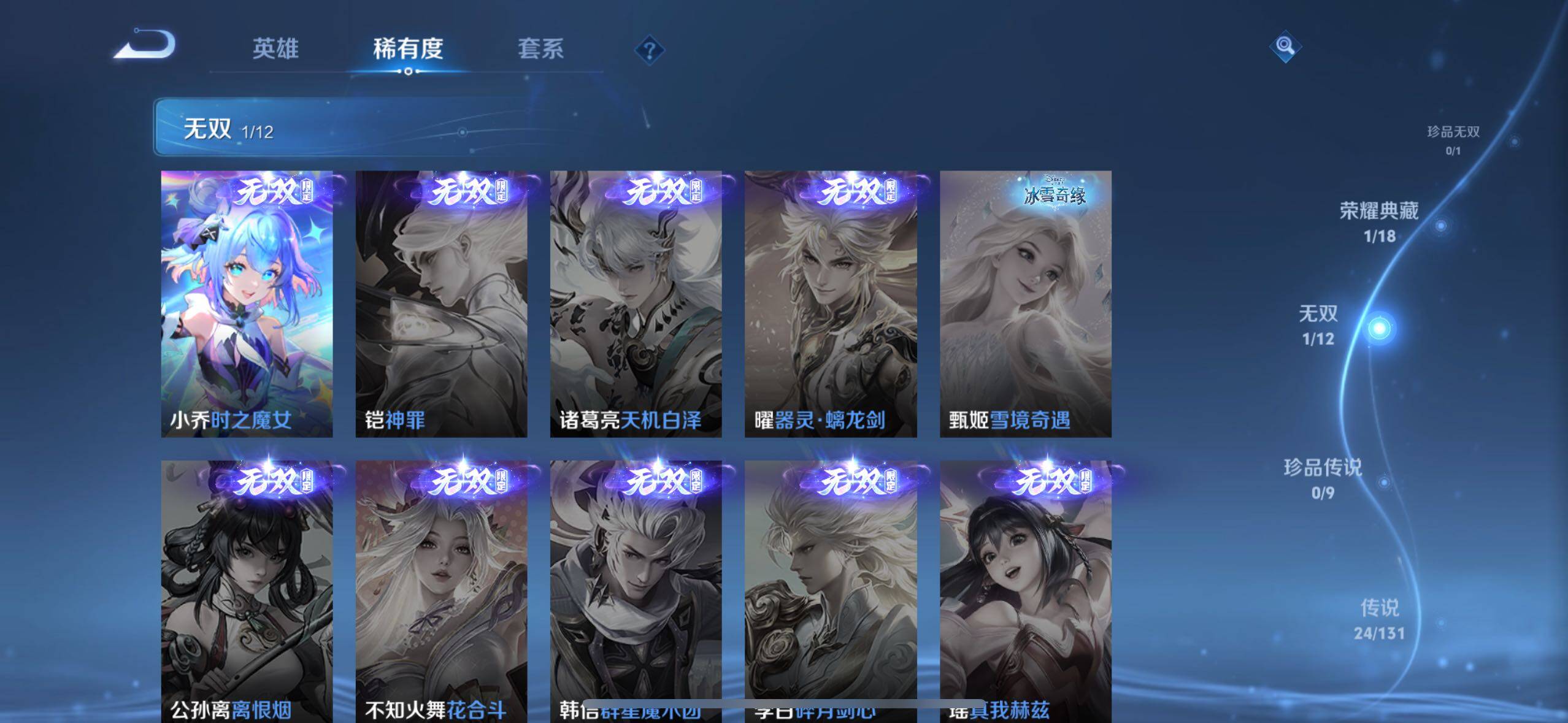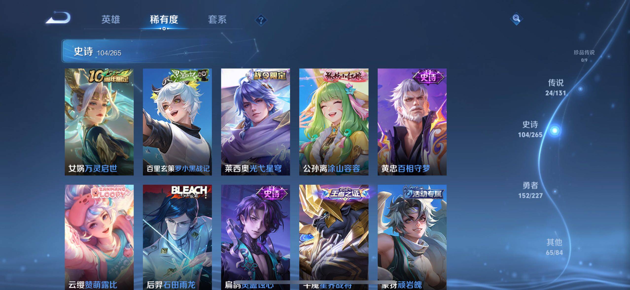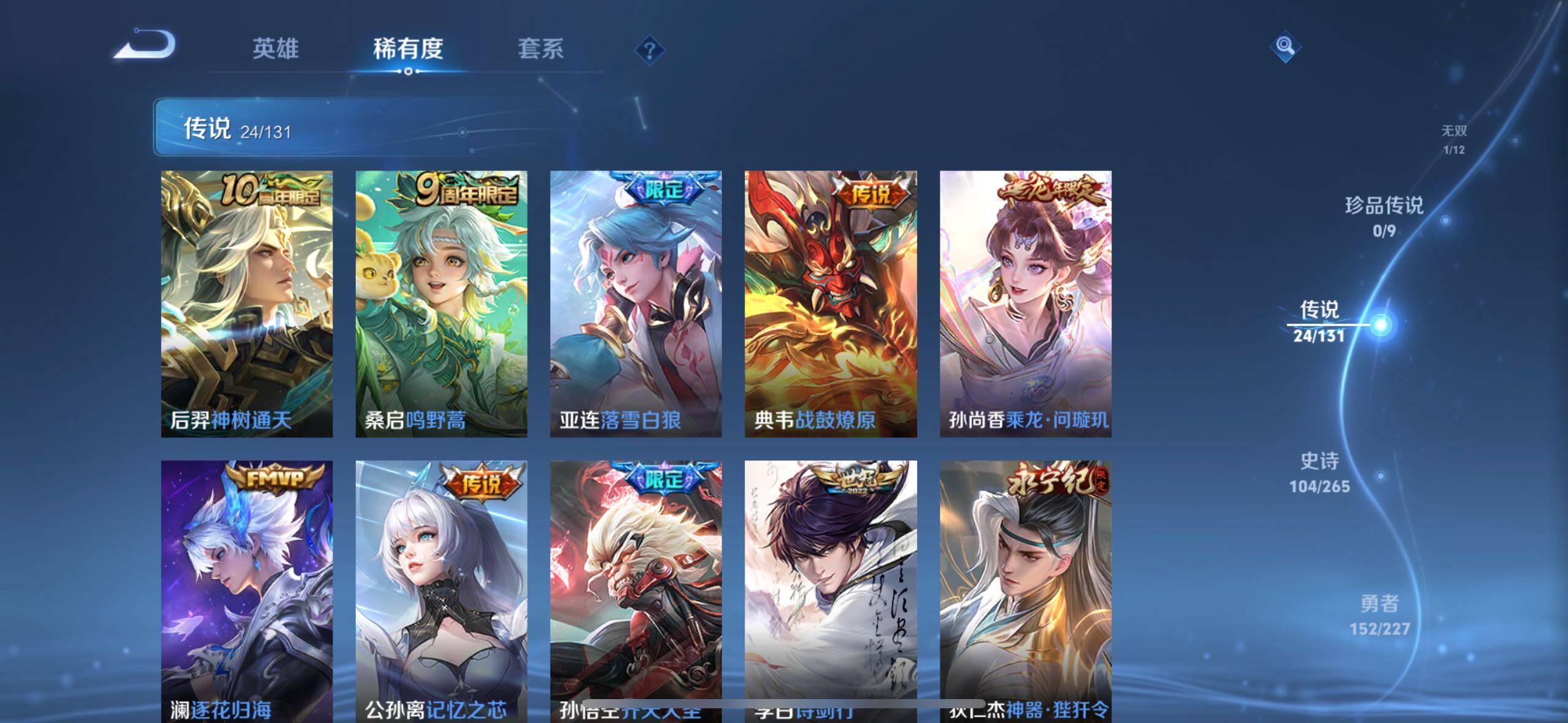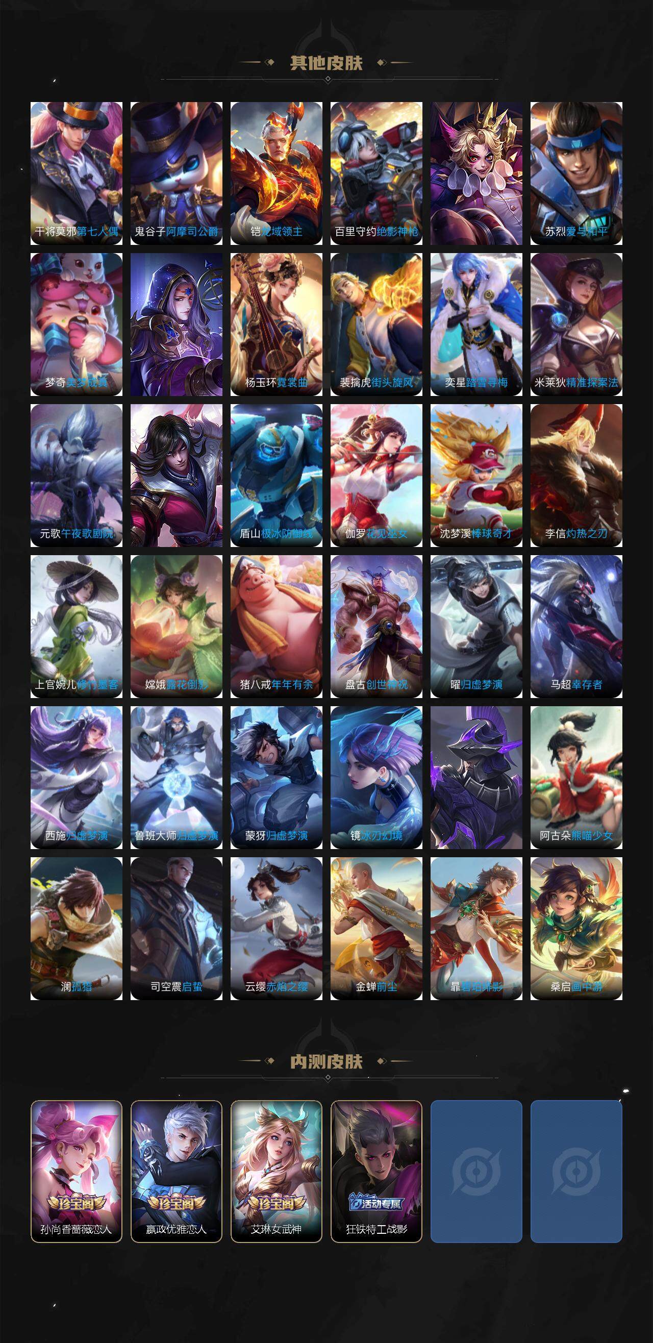贵族7/皮肤347/典藏1/传说24/史诗104/英雄127/孙权全皮/鬼谷子全皮/猪八戒全皮/蒙恬全皮/空空儿全皮/影全皮/李白鸣剑曳影/小乔时之魔女/宫本武藏幽冥之眼/狄仁杰星际治安官/貂蝉金色仲夏夜/孙尚香未来机甲/后羿神树通天/桑启鸣野蒿/亚连落雪白狼/典韦战鼓燎原/孙尚香乘龙问璇玑/澜逐花归海/公孙离记忆之芯/孙悟空齐天大圣/李白诗剑行/狄仁杰神器狴犴令/马可波罗深海之息/赵云淬星耀世/诸葛亮时雨天司/虞姬启明星使/孙悟空零号赤焰/关羽武圣/达摩黄金狮子座/百里玄策白虎志/后羿黄金射手座/貂蝉仲夏夜之梦/李白凤求凰/孙尚香末日机甲/宫本武藏地狱之眼/狄仁杰超时空战士/白起狰/蒙犽顽岩魄/姜子牙天穹之誓/杨戬破阵退雄兵/狄仁杰阴阳师/虞姬凯尔特女王/赵云皇家上将/嬴政优雅恋人/嬴政白昼王子/孙尚香蔷薇恋人/庄周蜃楼王/庄周高山流水/高渐离死亡摇滚/阿轲迷踪丽影/孙膑妖精王/扁鹊炼金王/芈月重明/芈月白晶晶/芈月幻夜卜梦/吕布猎兽之王/周瑜赤莲之焰/夏侯惇朔风刀/甄姬游园惊梦/曹操烛龙/典韦穷奇/典韦蓝屏警告/马可波罗暗影游猎/狄仁杰魔术师/狄仁杰万华元夜/达摩沙漠行僧/项羽海滩派对/老夫子醍醐杖/程咬金演武夺筹/刘邦夺宝奇兵/韩信逐梦之影/韩信飞衡/王昭君午后时光/兰陵王驯魔猎人/兰陵王金庭之子/花木兰默契交锋/孙悟空美猴王/孙悟空至尊宝/孙悟空大圣娶亲/孙悟空孙行者/牛魔御旌/后羿圣弓游侠/李元芳银河之约/李元芳云中旅人/虞姬霸王别姬/钟馗驱傩正仪/杨玉环遇见飞天/女娲朔望之晖/干将莫邪真爱魔法/雅典娜黎明之约/蔡文姬繁星吟游/太乙真人饕餮/鬼谷子原初探秘者/鬼谷子五谷丰年/黄忠火炮绅士/苏烈千军破阵/百里玄策原初追逐者/弈星混沌棋/梦奇顽趣/公孙离蜜橘之夏/沈梦溪星空之诺/沈梦溪大漠名商/明世隐疑决卦/裴擒虎李小龙/裴擒虎擒涛扼浪/狂铁御狮/狂铁电玩高手/米莱狄御霄/盾山御銮/猪八戒西部大镖客/猪八戒猪悟能/上官婉儿梁祝/嫦娥如梦令/嫦娥拒霜思/鲁班大师探海日志/桑启海盐诗旅/艾琳女武神/艾琳流音漫舞/司空震地狱燃心/阿古朵江河有灵/张良古海寻踪/蒙恬荣光圣徽/高渐离燃音魔法/妲己灵卜魔法/鬼谷子天穹祈灯/伽罗琥珀纪元/安琪拉乘龙聚宝船/沈梦溪龙舞盛年/刘邦剑破天穹/镜青焰无极/项羽苍威无极/周瑜熔金海岸/鲁班七号电玩小子/项羽苍穹之光/露娜紫霞仙子/阿轲暗夜猫娘/赵云未来纪元/貂蝉圣诞恋歌/甄姬冰雪圆舞曲/王昭君偶像歌手/廉颇地狱岩魂/宫本武藏鬼剑武藏/孙尚香水果甜心/嬴政暗夜贵公子/嬴政摇滚巨星/妲己女仆咖啡/墨子龙骑士/墨子金属风暴/吕布圣诞狂欢/刘禅绅士熊喵/曹操幽灵船长/李白千年之狐/吕布末日机甲/张飞乱世虎臣/韩信白龙吟/花木兰水晶猎龙者/刘邦德古拉伯爵/夏侯惇乘风破浪/小乔缤纷独角兽/兰陵王暗隐猎兽者/诸葛亮黄金分割率/亚瑟心灵战警/雅典娜冰冠公主/安琪拉心灵骇客/百里守约特工魅影/铠曙光守护者/蔡文姬舞动绿茵/刘禅天才门将/李元芳逐浪之夏/程咬金功夫厨神/白起星夜王子/阿轲节奏热浪/孙策猫狗日记/大乔猫狗日记/伽罗箭羽风息/狄仁杰鹰眼统帅/公孙离无限星赏官/娜可露露晚萤/不知火舞魅语/橘右京修罗/西施诗语江南/杨戬天秀启明/安琪拉时之奇旅/刘禅电玩爆裂旋风/牛魔星界战将/扁鹊灵蛊蚀心/后羿石田雨龙/云缨赞萌露比/黄忠百相守梦/公孙离涂山容容/莱西奥光弋星穹/百里玄策罗小黑战记/女娲万灵启世/韩信教廷特使/韩信街头霸王/露娜哥特玫瑰/阿轲致命风华/阿轲爱心护理/达摩大发明家/赵云白执事/赵云忍炎影/芈月红桃皇后/程咬金星际陆战队/白起白色死神/牛魔西部大镖客/扁鹊化身博士/扁鹊救世之瞳/宫本武藏未来纪元/安琪拉玩偶对对碰/孙膑天使之翼/妲己少女阿狸/典韦黄金武士/达摩拳王/花木兰兔女郎/张飞五福同心/甄姬花好人间/刘备万事如意/宫本武藏万象初新/刘备纽约教父/刘备汉昭烈帝/关羽龙腾万里/墨子进击墨子号/钟无艳海滩丽影/宫本武藏霸王丸/王昭君幻想奇妙夜/老夫子功夫老勺/孙尚香沉稳之力/诸葛亮掌控之力/李白敏锐之力/鬼谷子幻乐之宴/安琪拉如懿/苏烈坚韧之力/大乔守护之力/明世隐虹云星官/张良幽兰居士/庄周奇妙博物学/小乔丁香结/吕布野性能量/孙膑归虚梦演/沈梦溪鲨炮海盗猫/姜子牙炽热元素使/哪吒次元突破/鲁班七号黑桃队长/盾山圆桌骑士/狂铁特工战影/廉颇无尽征程/刘禅秘密基地/杨戬次元傲视/张良缤纷绘卷/鲁班大师乓乓大师/马可波罗潮玩牛仔/程咬金无双福将/蒙恬蔚蓝守将/戈娅危途狂花/海月幻泉雾影/猪八戒潮玩探月行/赵怀真太极少年/太乙真人劲辣红锅/莱西奥西部游侠/姬小满零食大作战/李元芳妄想特派/亚连破局者/朵莉亚金色潮汐/廉颇功夫炙烤/亚瑟鸿运当头/盘古经纬探寻者/大司命暗都幽影/盘古敬我三分/东皇太一噬灭天穹/干将莫邪雾都夜雨/苍苍林狼骑/太乙真人谧流熔炉/典韦铁骨偃魂/影魅影绮裳/西施雪境奇遇/姜子牙星梦巡礼/钟馗虚灵犬护/露娜命运加冕/姬小满小满鸭/白起死霸装/甄姬逆浪荇歌/云中君云械蓝图/庄周锦麟游梦/空空儿戏梦巡演/莱西奥踏浪烽翎/鬼谷子克喵/哪吒罗小黑战记/亚瑟荣光之誓/明世隐往忆晖光/孙权径山谋武/艾琳鹤鸣心笺/鲁班七号福禄兄弟/高渐离金属狂潮/露娜绯红之刃/钟无艳生化警戒/花木兰剑舞者/老夫子潮流仙