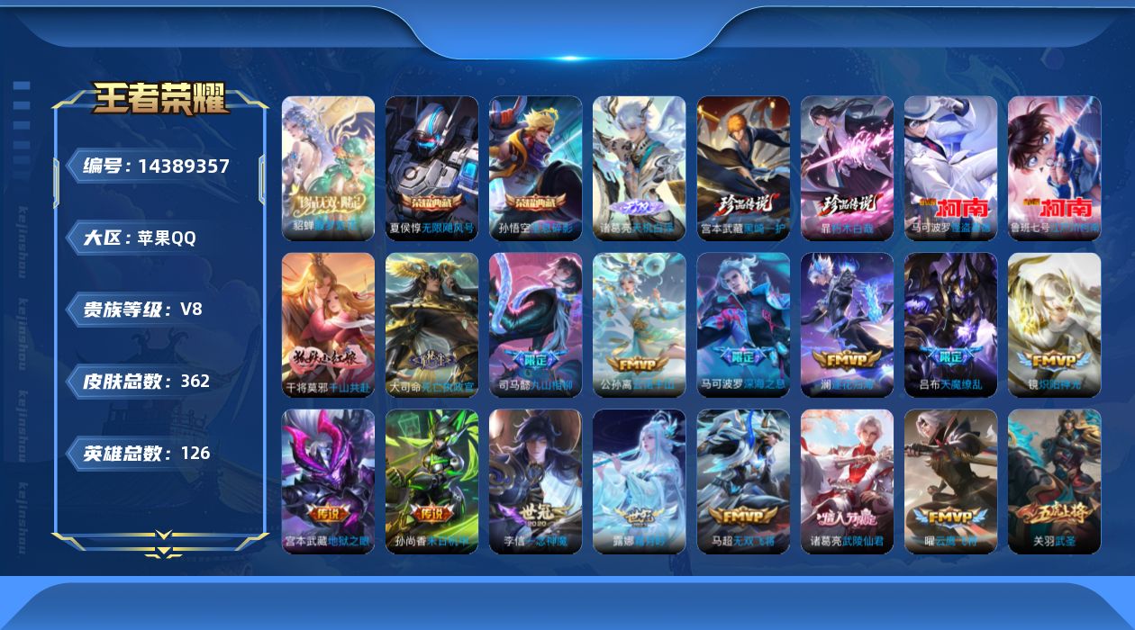 [14389357]v8 2典藏 1珍品无双 1无双 4珍品传说 27传说 126英雄 362皮肤 可修改实名 【英雄全皮】:蒙恬全皮刘邦全皮 【稀有英雄】:大司命嬴政始皇帝韩信韩跳跳夏洛特夏师傅艾琳橘右京橘子娜可露露鸟人不知火舞赵云金蝉唐僧戈娅 【珍品无双】:馥梦繁花 【荣耀水晶】:全息碎影猴子典藏无限飓风号高达 【无双皮】:天机白泽 【珍品传说】:江户川柯南怪盗基德朽木白哉黑崎一护 【传说皮】:云诺千山神树通天千山共赴死亡执政官幻光神呛九山相柳地狱火地狱之眼末日机甲-孙尚香绿蚂蚱一念神魔冠军飞将云鹰飞将小将军炽阳神光无双飞将乞巧织情时之恋人-刘备电焊工遇见神鼓霜月吟澜逐花归海 【珍宝阁皮】:妄想食味优雅恋人女武神 【赛季/战令皮】:噬灭天穹s37古海寻踪s33海盐诗旅s30擒涛扼浪s31探海日志s32流音漫舞顽趣-梦奇地狱燃心剑破天穹s35天穹祈灯s34青焰无极苍威无极天穹之誓s36凯尔特女王s7狰s8饕餮s9烛龙s10重明s11穷奇s12御狮s13御霄s14御旌s15御銮s16朔风刀s17混沌棋s18疑决卦s19醍醐杖s20原初探秘者s21万华元夜s22演武夺筹s23驱傩正仪s24千军破阵s25猎兽之王白昼王子朔望之晖蓝屏警告神迹守卫-钟馗狮舞东方赤莲之焰驯魔猎人星空之诺银河之约夺宝奇兵迷踪丽影西部大镖客-猪八戒暗影游猎游乐娃子单词大作战狂想玩偶喵潮玩骑士王云间偶戏星际陆战队-达摩胡桃异想国神迹守卫-墨子航海奇遇记圣弓游侠真爱魔法沙漠行僧s26金庭之子s27大漠名商s28云中旅人s29 【史诗皮】:赞萌露比巫礼祀神化蝶舞鸭鸭历险记-刘禅龙之律动石田雨龙幻珠鲛人涂山红红星界战将百相守梦-百里守约怒海争锋决胜骁骑蔬乡物语鲁班七号守夜人小牛鸭涂山容容遇见神鹿紫霞仙子苍穹之光电玩小子小书包白龙吟黄金分割率特工魅影千年之狐永昼江河有灵高渐离燃音魔法百解令蒙犽蒙恬荣光圣