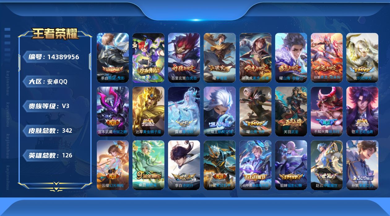 [14389956]可二次【店主推荐捡漏号!可直接换绑/省50孙策/市100裴擒虎】:安卓q-v8-最强王者段位-126英雄-342皮肤-1典藏皮肤-1珍品传说-24传说-117史诗 【英雄全皮】:猪八戒全皮,蒙恬全皮,影全皮 【荣耀典藏】:李白鸣剑曳影 【珍品传说】:孙策时之奇旅 【传说皮肤】:后羿神树通天,云缨幻光神呛,桑启鸣野蒿,铠冥王哈迪斯,云中君群星魔术团,孙策乘龙淬吴钩,露娜霜月吟,曜山海苍雷引,李白诗剑行,不知火舞绯月行,孙策挚爱之约,孙策末日机甲,裴擒虎寅虎赤拳,赵云淬星耀世,曜李 ,兰陵王默契交锋,镜炽阳神光,虞姬启明星使,关羽武圣,曜云鹰飞将,貂蝉猫影幻舞,达摩黄金狮子座,百里玄策白虎志,宫本武藏地狱之眼 【限定皮肤】:铠冥王哈迪斯,姜子牙天穹之誓,狄仁杰阴阳师,赵云皇家上将,赵云龙胆,墨子神迹守卫,嬴政优雅恋人,鲁班七号狮舞东方,庄周高山流水,阿轲迷踪丽影,钟无艳超时空战士,扁鹊奇幻香踪,白起夜都怪侠,芈月幻夜卜梦,周瑜赤莲之焰,元歌云间偶戏,元歌无心,夏侯惇朔风刀,甄姬落雪兰心,典韦蓝屏警告,马可波罗暗影游猎,狄仁杰魔术师,狄仁杰万华元夜,达摩星际陆战队,达摩沙漠行僧,项羽海滩派对,项羽霸王别姬,老夫子醍醐杖,老夫子航海奇遇记,关羽武圣,安琪拉魔法小厨娘,程咬金演武夺筹,露娜一生所爱,刘邦夺宝奇兵,韩信飞衡,韩信傲雪梅呛,兰陵王默契交锋,兰陵王驯魔猎人,兰陵王金庭之子,花木兰默契交锋,不知火舞绯月行,亚瑟潮玩骑士王,孙悟空美猴王,孙悟空大圣娶亲,孙悟空孙行者,牛魔御旌,后羿如梦令,后羿圣弓游侠,刘备百相守梦,李元芳银河之约,李元芳云中旅人,虞姬启明星使,钟馗神迹守卫,钟馗驱傩正仪,杨玉环遇见飞天,杨戬潮玩骑兵,女娲朔望之晖,干将莫邪真爱魔法,雅典娜单词大作战,雅典娜黎明之约,蔡文姬繁星吟游,鬼谷子原初探秘者,鬼谷子五谷丰年,黄忠火炮绅士,苏烈千军破阵,百里玄策白虎志,百里守约朱雀志,弈星混沌棋,梦奇顽趣,沈梦溪星空之诺,沈梦溪大漠名商,明世隐疑决卦,明世隐吟游魔法,裴擒虎天狼狩猎者,裴擒虎李小龙,裴擒虎寅虎赤拳,裴擒虎擒涛扼浪,狂铁电玩高手,米莱狄御霄,米莱狄胡桃异想国,云中君纤云弄巧,伽罗天狼溯光者,盾山御銮,盾山梦圆繁星,孙策挚爱之约,猪八戒西部大镖客,猪八戒猪悟能,上官婉儿梁祝,上官婉儿天狼绘梦者,嫦娥如梦令,嫦娥拒霜思,嫦娥暖冬兔眠,曜李 ,曜