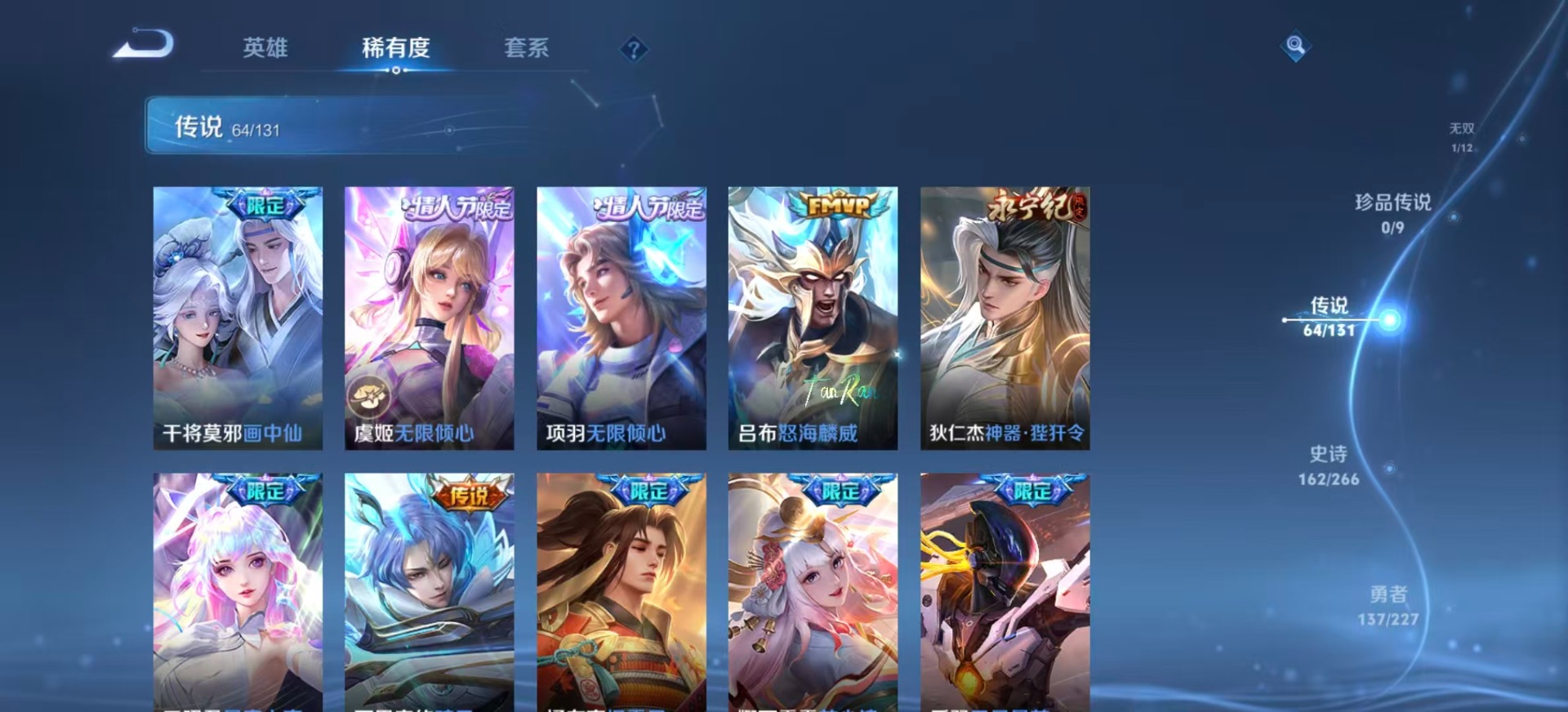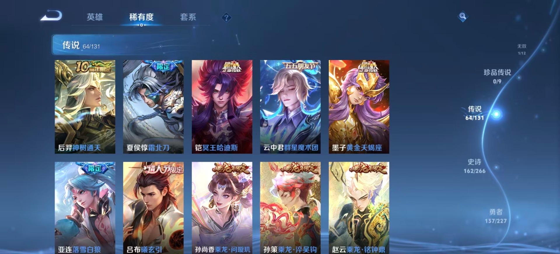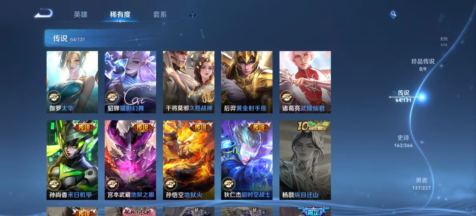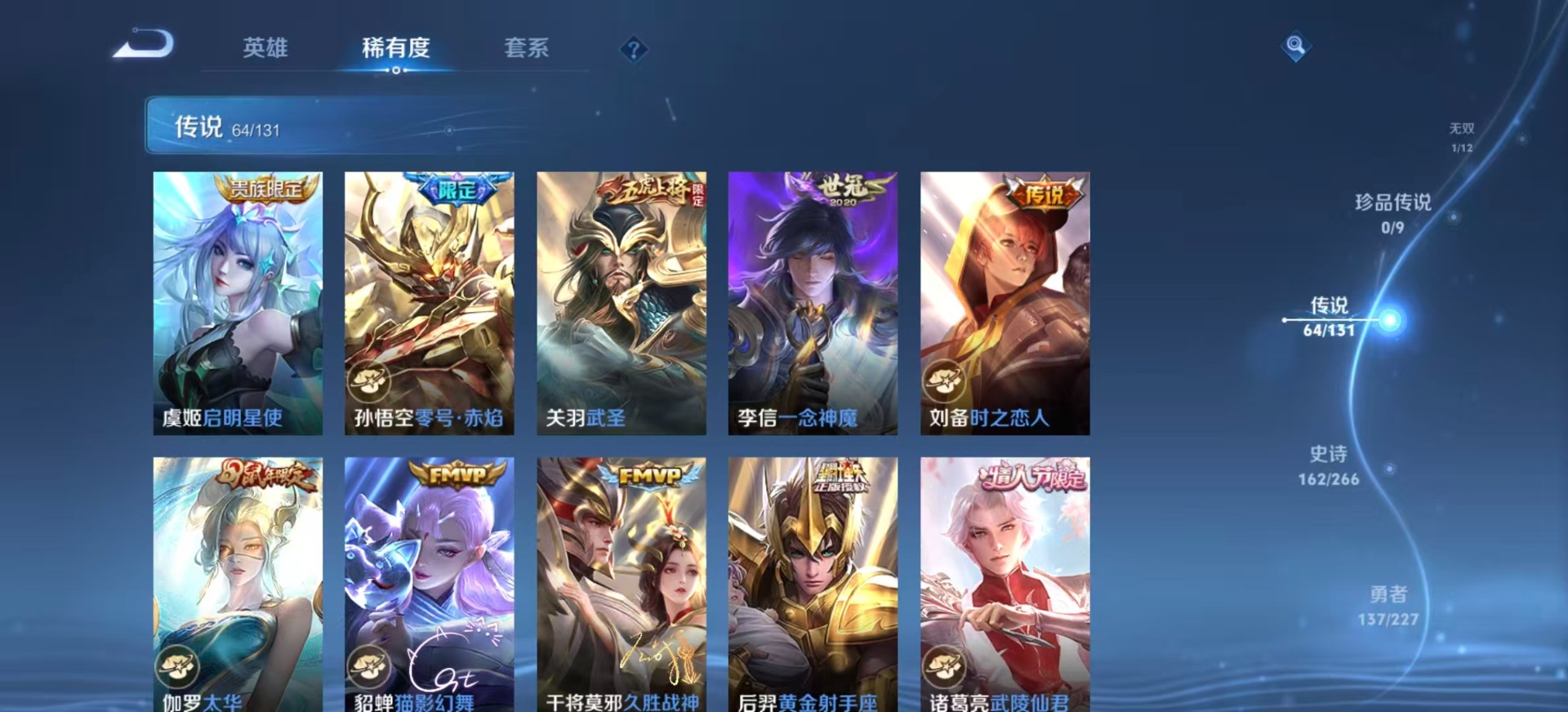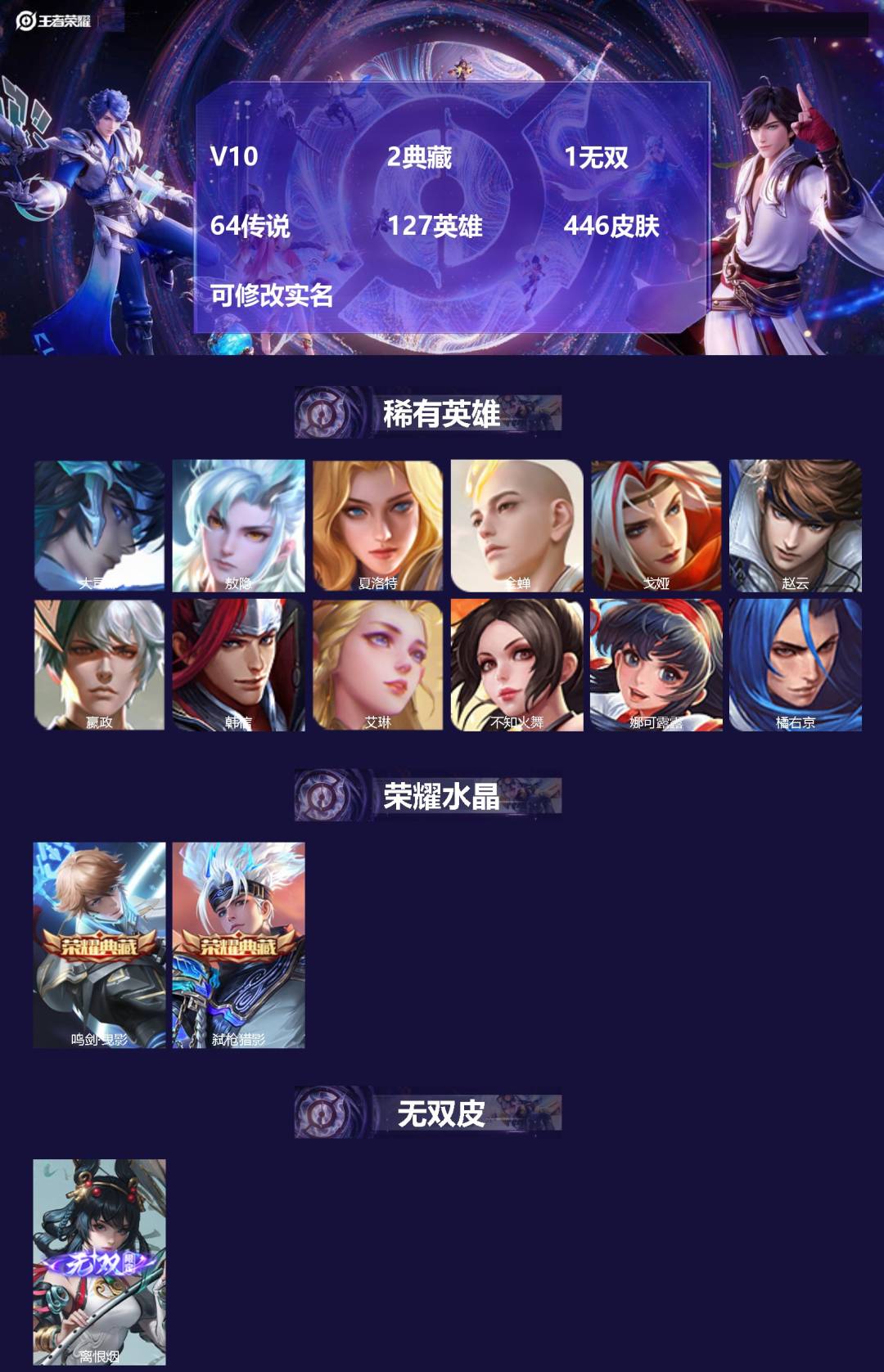 v10 2典藏 1无双 64传说 127英雄 446皮肤 可修改实名 【英雄全皮】:蒙恬全皮橘右京全皮敖隐全皮鬼谷子全皮刘邦全皮鲁班大师全皮金蝉全皮墨子全皮 【稀有英雄】:敖隐小龙人大司命嬴政始皇帝韩信韩跳跳夏洛特夏师傅艾琳橘右京橘子娜可露露鸟人