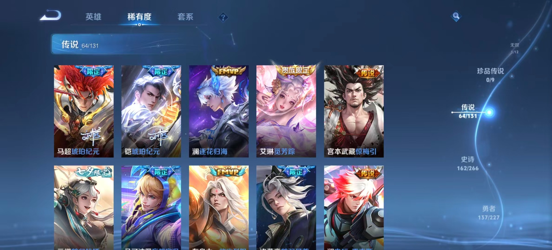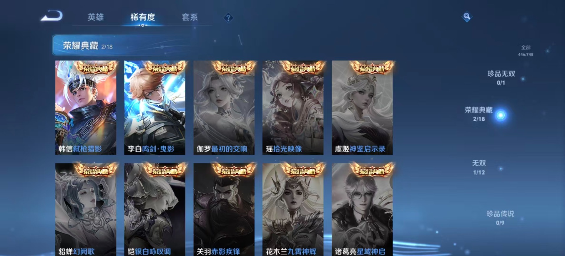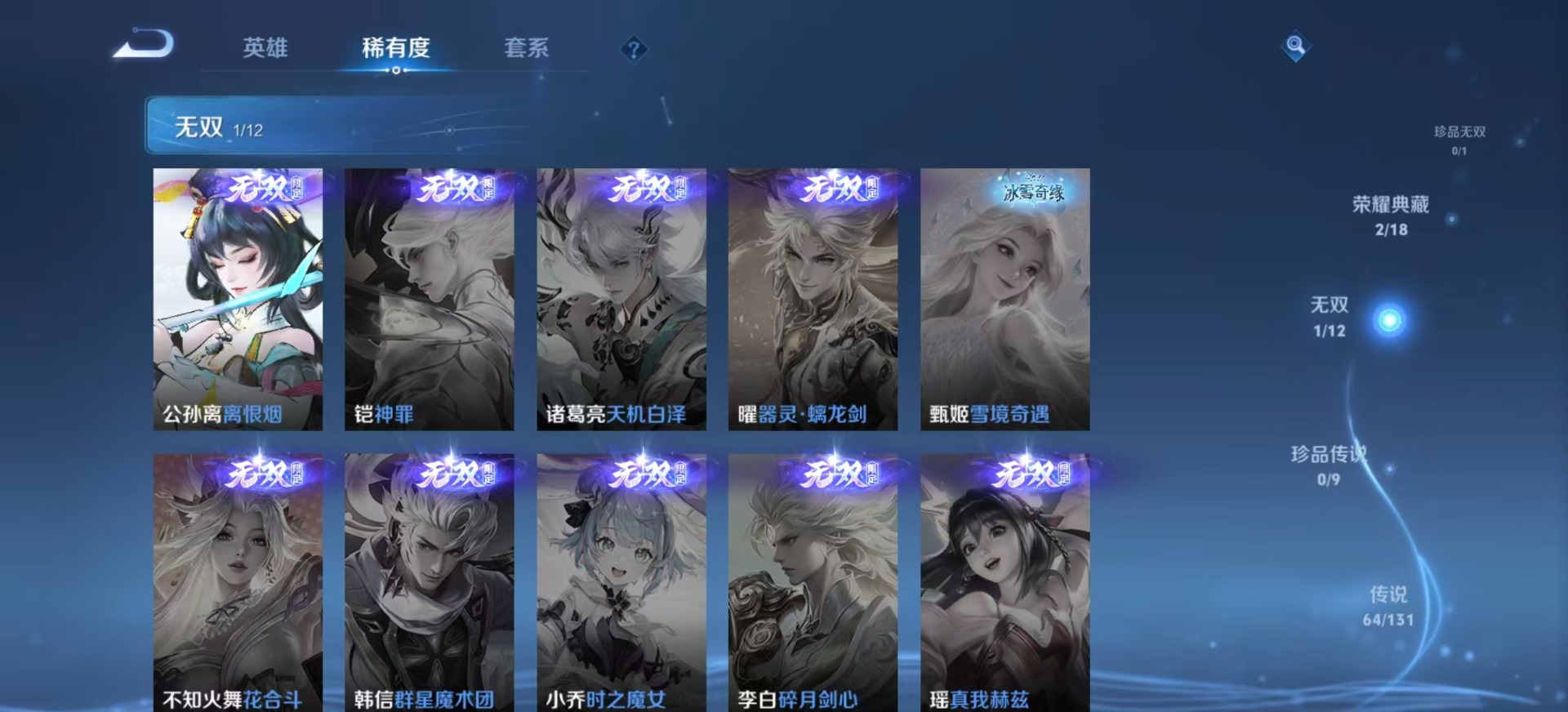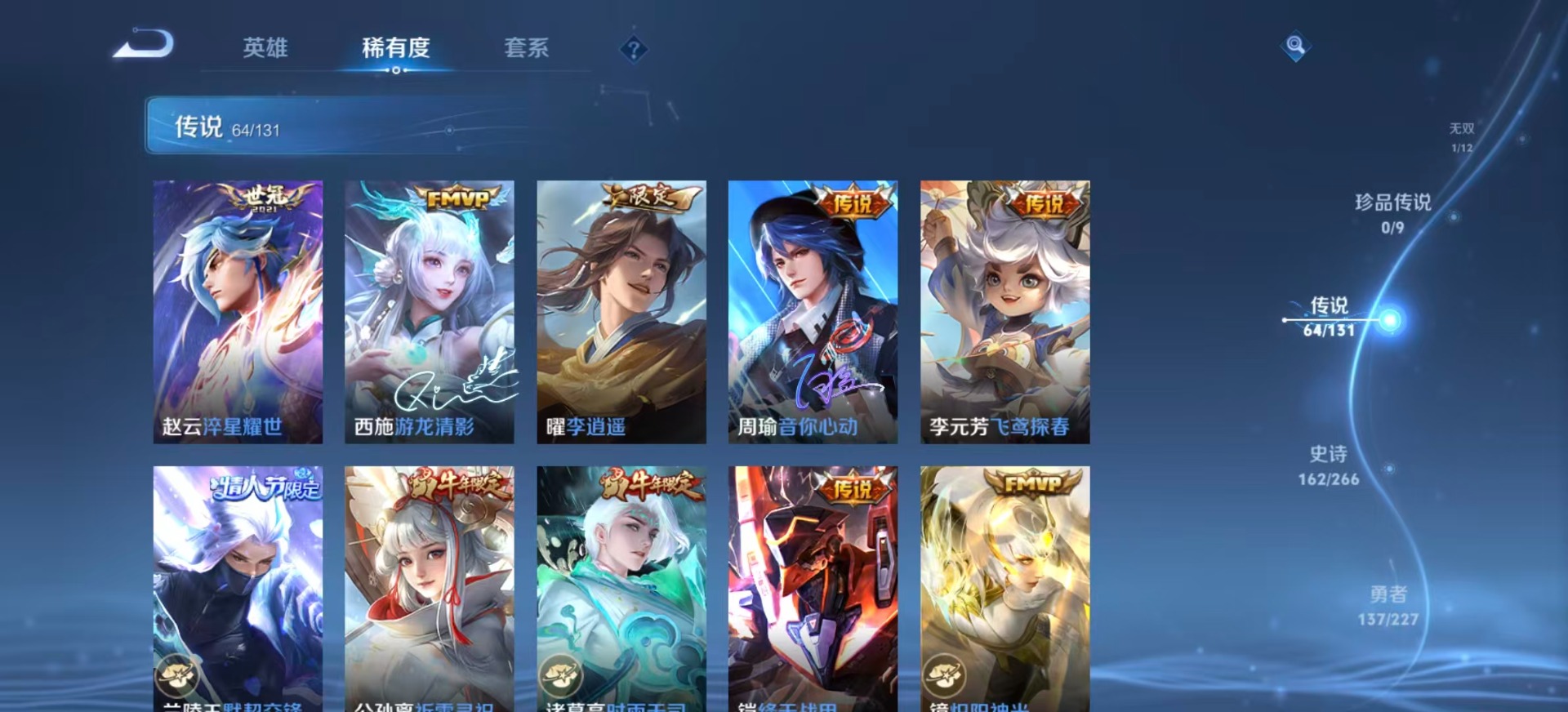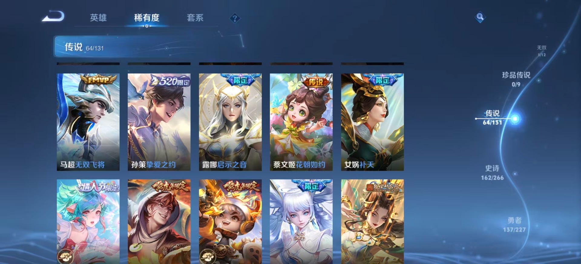 v10 2典藏 1无双 64传说 127英雄 446皮肤 可修改实名 【英雄全皮】:蒙恬全皮橘右京全皮敖隐全皮鬼谷子全皮刘邦全皮鲁班大师全皮金蝉全皮墨子全皮 【稀有英雄】:敖隐小龙人大司命嬴政始皇帝韩信韩跳跳夏洛特夏师傅艾琳橘右京橘子娜可露露鸟人