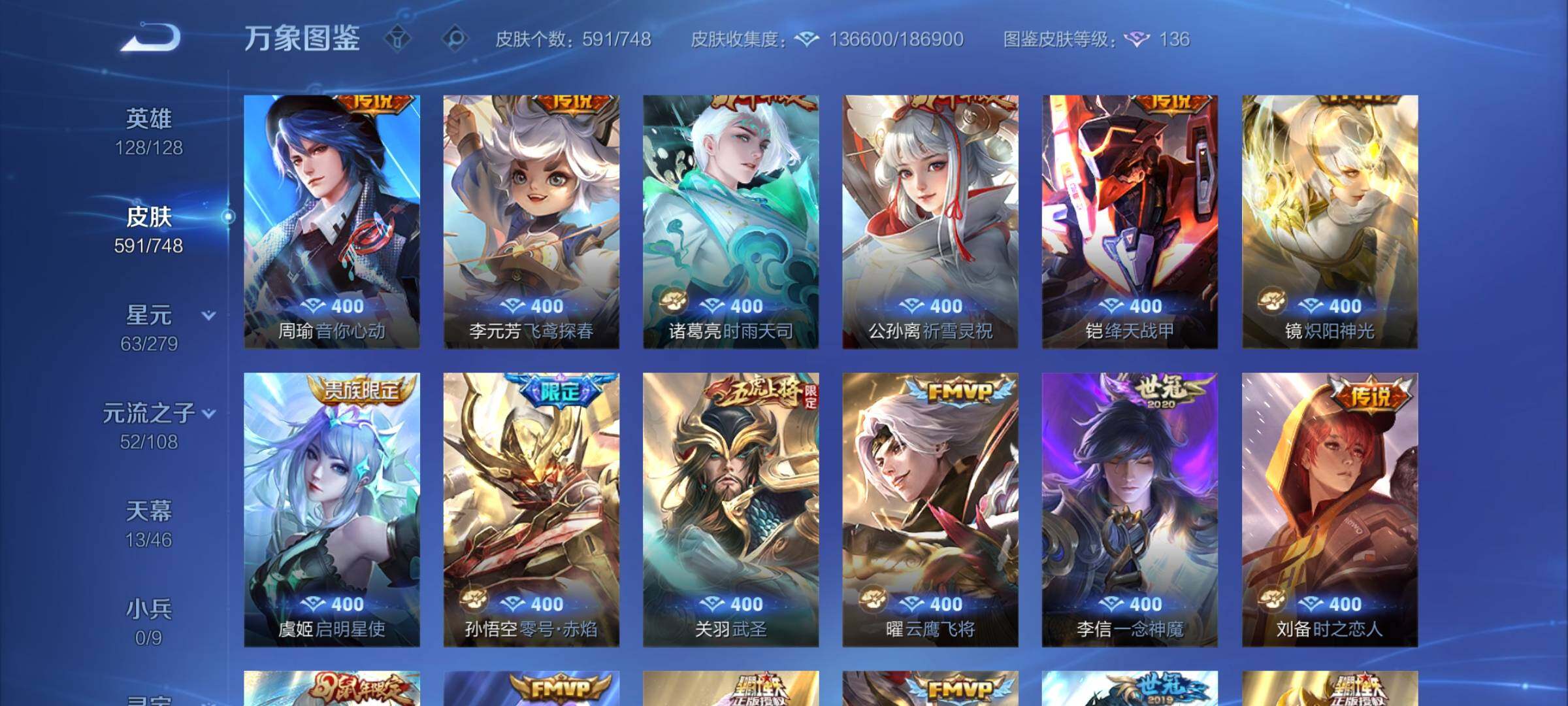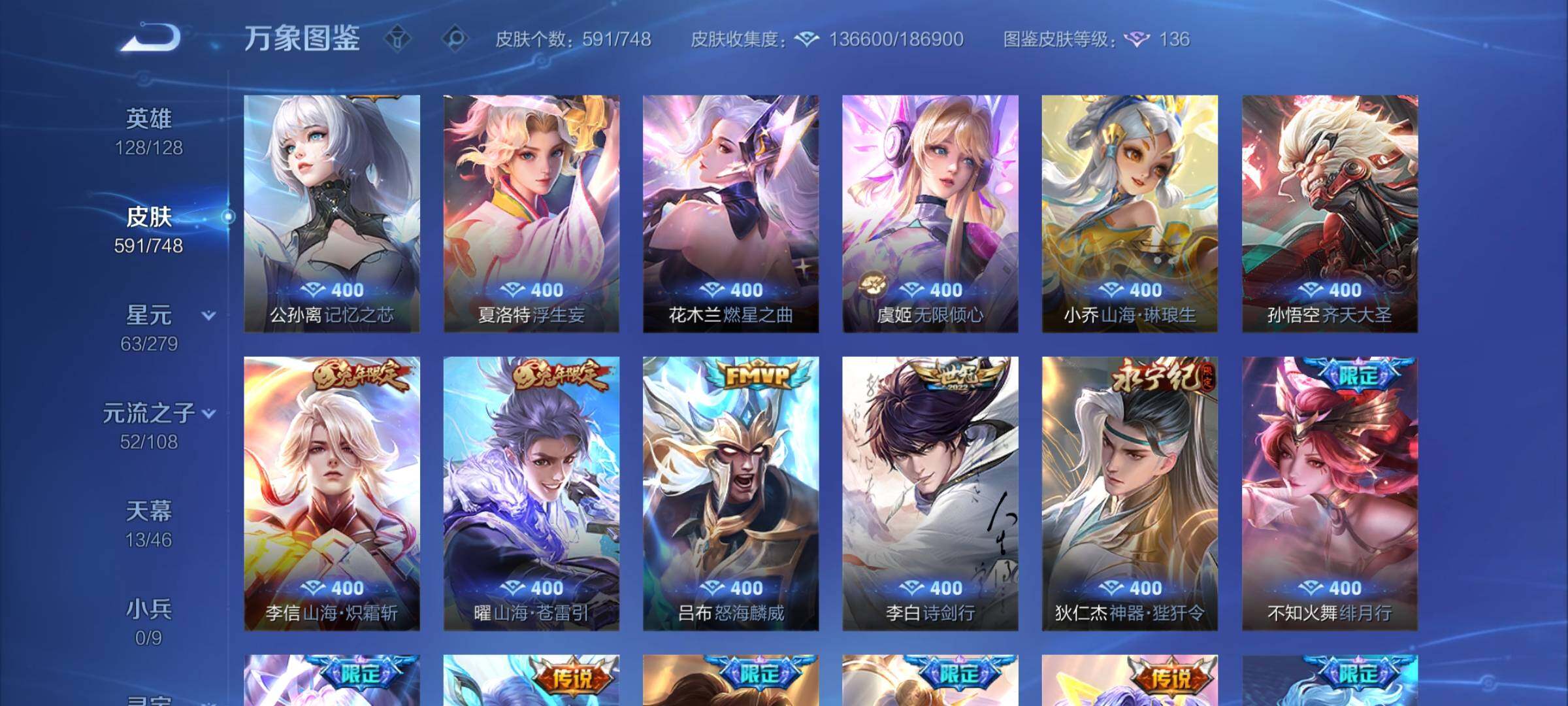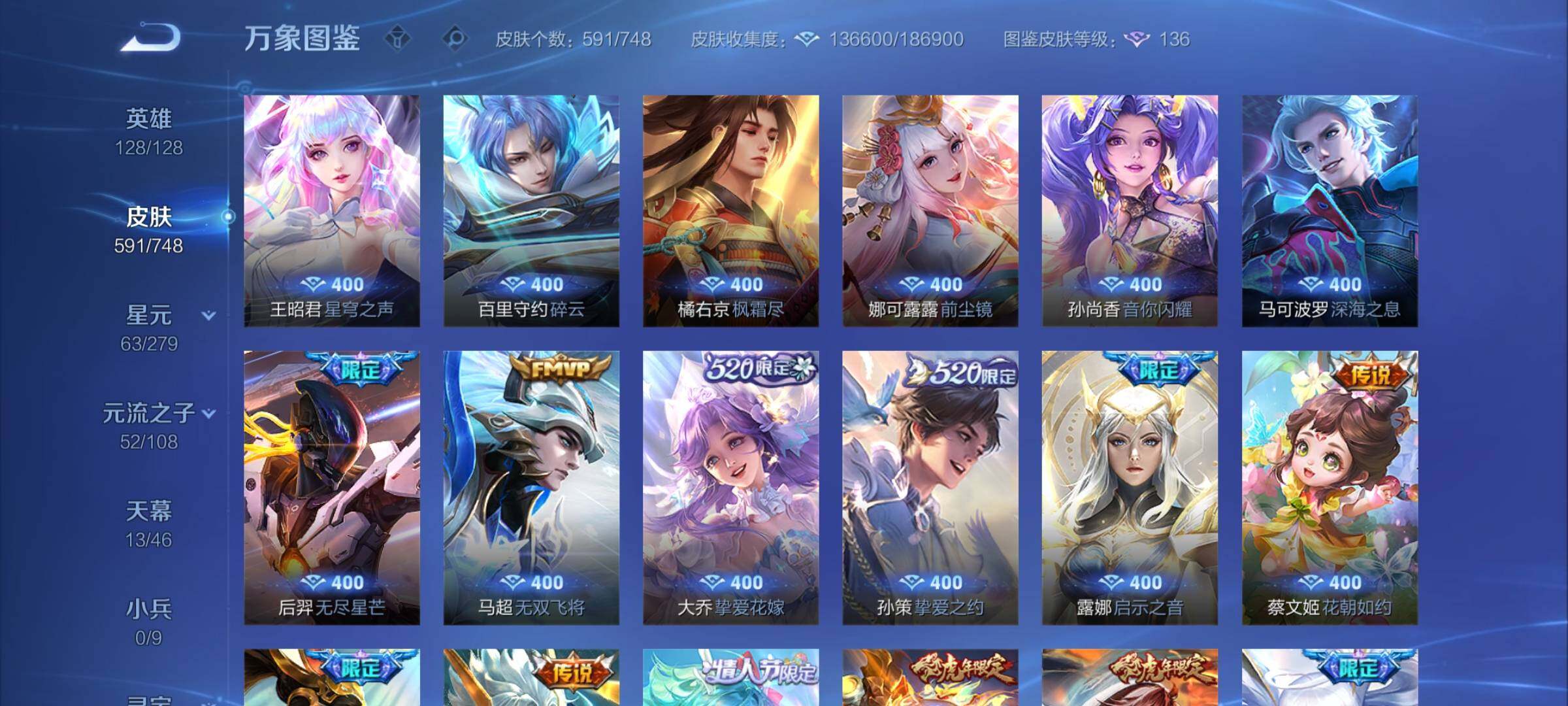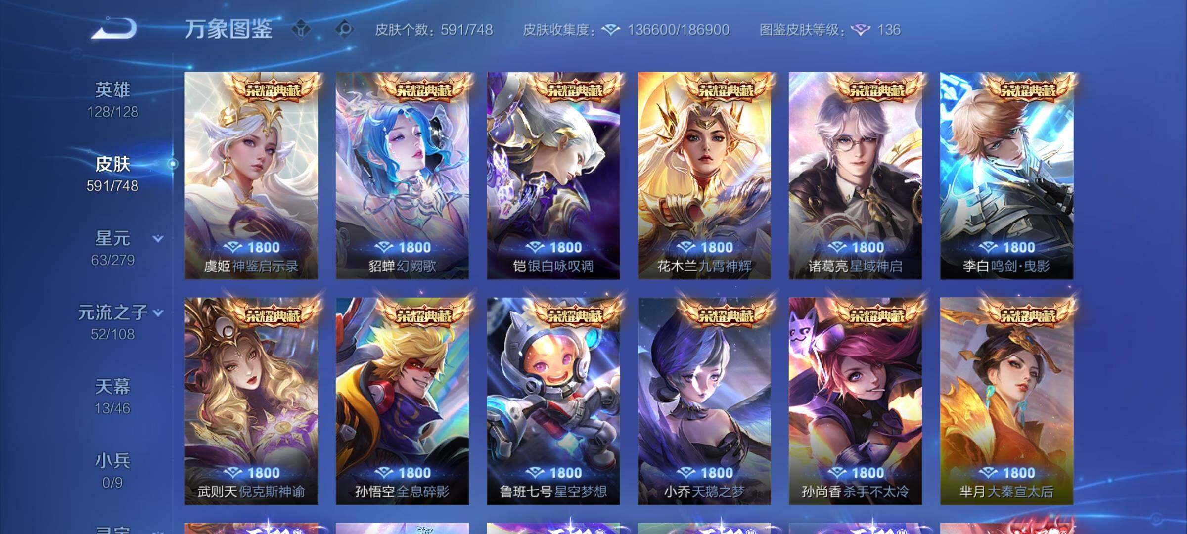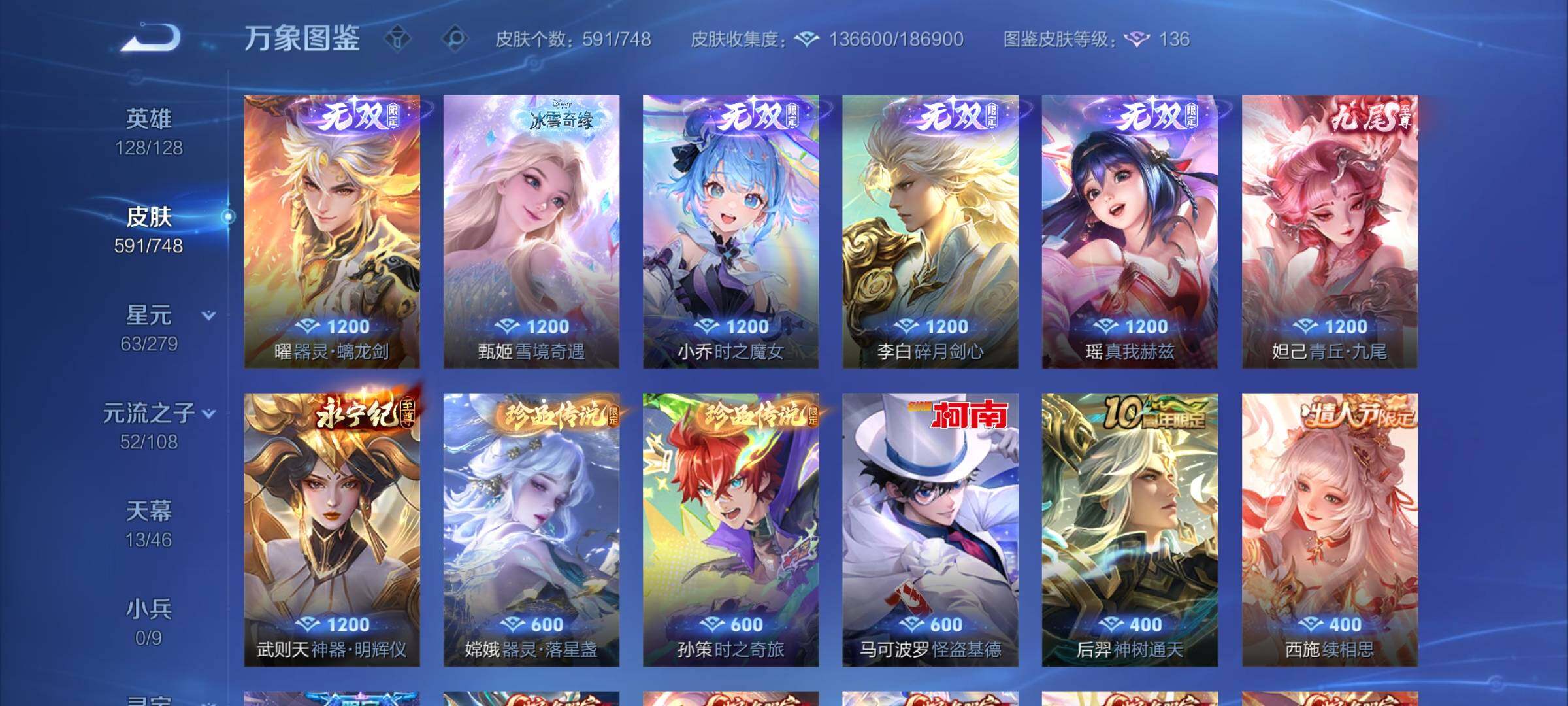 【精品v10·13典藏·7无双·3珍品·13天幕·紫瑶·45段打野·小国标李白·金标万战澜·金标万战镜·63按键·80个性戳戳·全皮木兰·全皮露娜·全皮橘子·全皮露露·全皮玄策·全皮曜·全皮镜·全皮马超·全皮西施·全皮嫦娥·全皮杨玉环·可二次】w7323-安卓q-128英雄-591皮肤-17王者印记-300铭文-贵族积分53w【贵族10】【13典藏·7无双·3珍品·6星传说·105传说·1