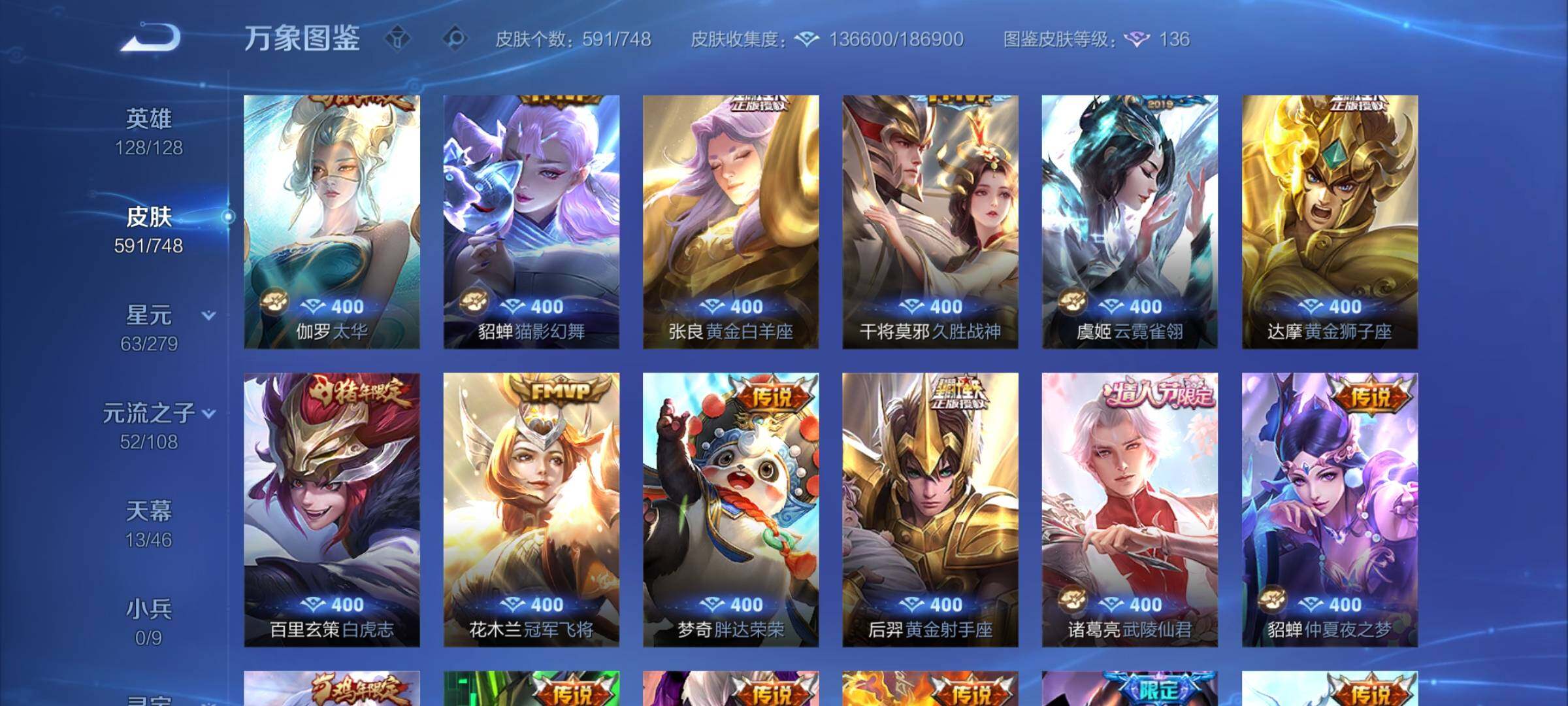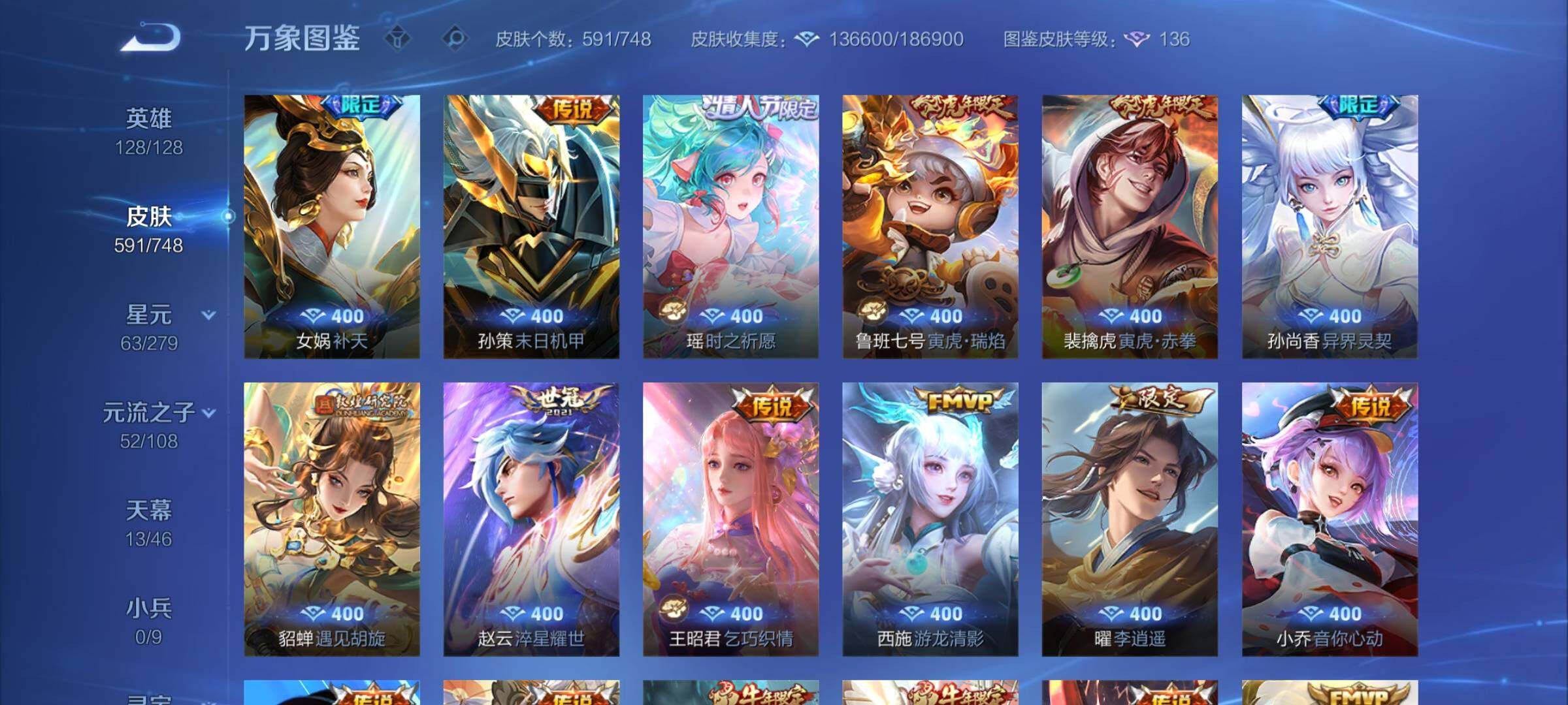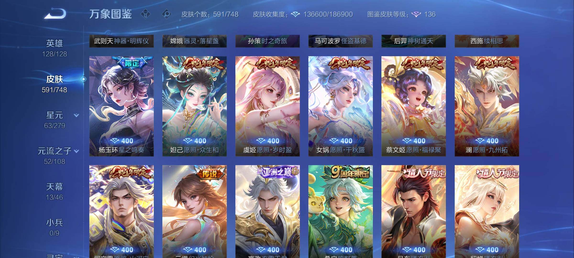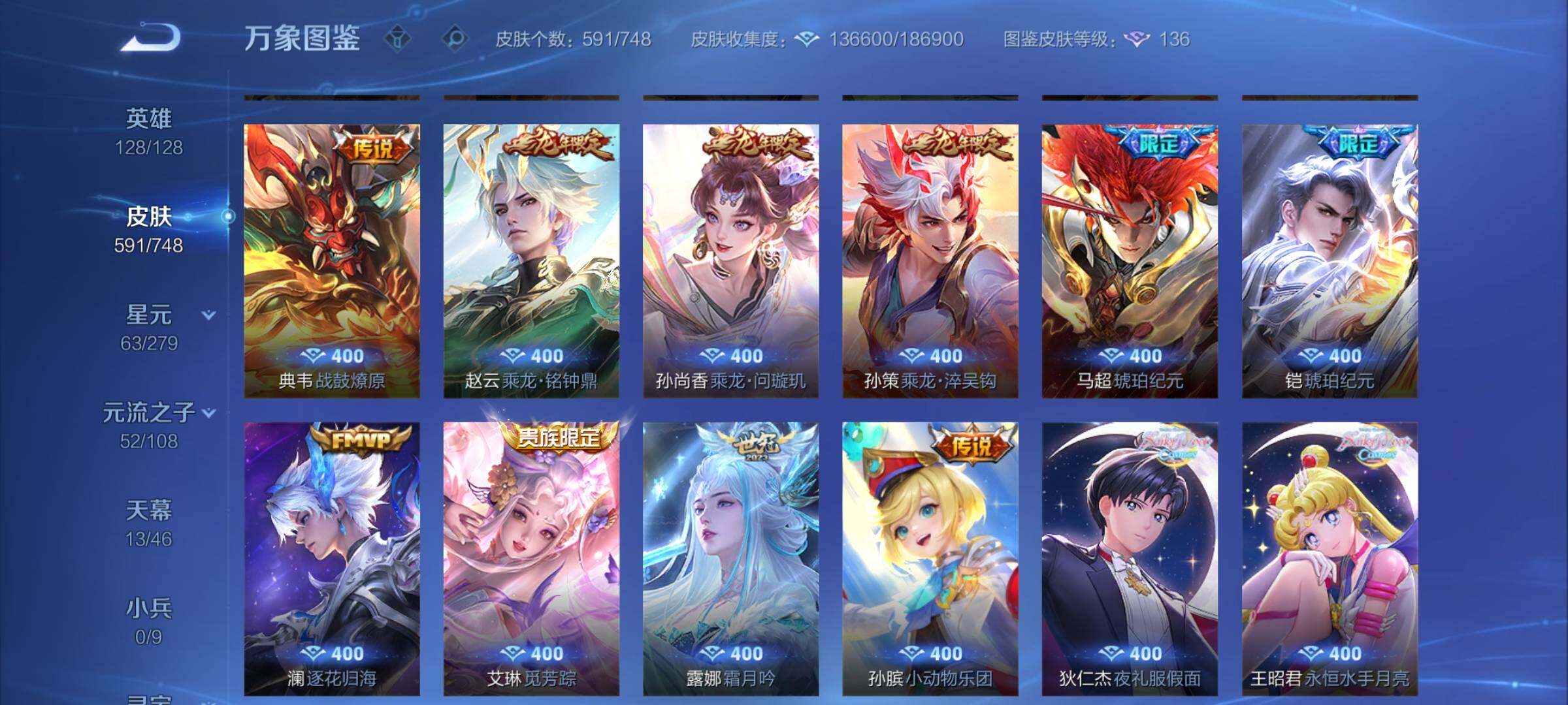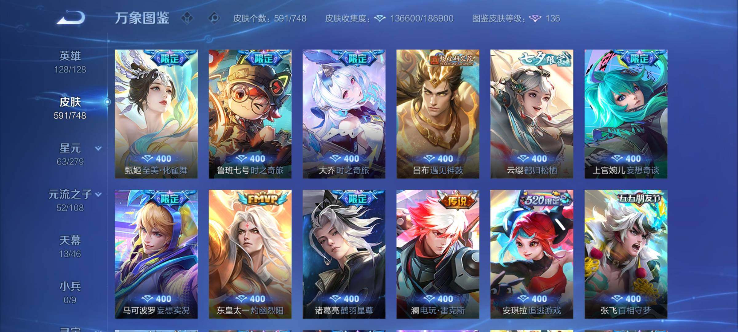 【精品v10·13典藏·7无双·3珍品·13天幕·紫瑶·45段打野·小国标李白·金标万战澜·金标万战镜·63按键·80个性戳戳·全皮木兰·全皮露娜·全皮橘子·全皮露露·全皮玄策·全皮曜·全皮镜·全皮马超·全皮西施·全皮嫦娥·全皮杨玉环·可二次】w7323-安卓q-128英雄-591皮肤-17王者印记-300铭文-贵族积分53w【贵族10】【13典藏·7无双·3珍品·6星传说·105传说·1