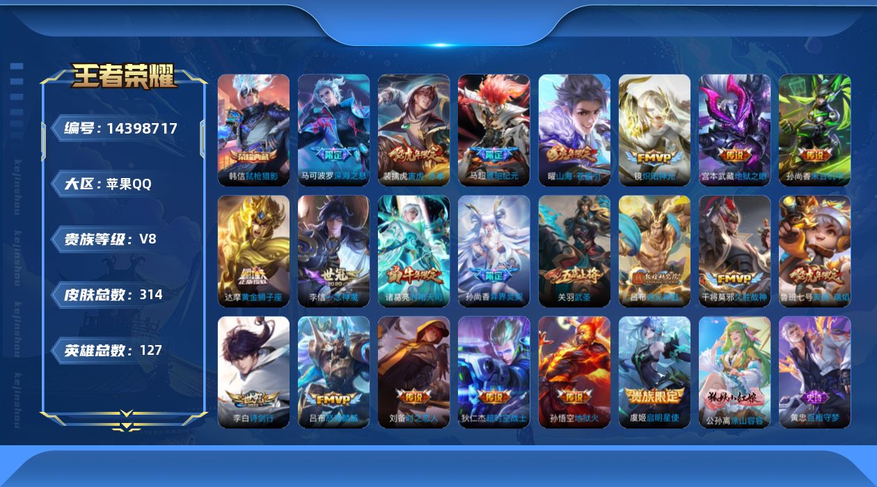 v8 1典藏 21传说 127英雄 314皮肤 可修改实名 【稀有英雄】:敖隐小龙人大司命嬴政始皇帝韩信韩跳跳夏洛特夏师傅艾琳橘右京橘子娜可露露鸟人不知火舞赵云金蝉唐僧戈娅 【荣耀水晶】:弑呛猎影韩信典藏 【传说皮】:琥珀纪元马超黄金狮子座