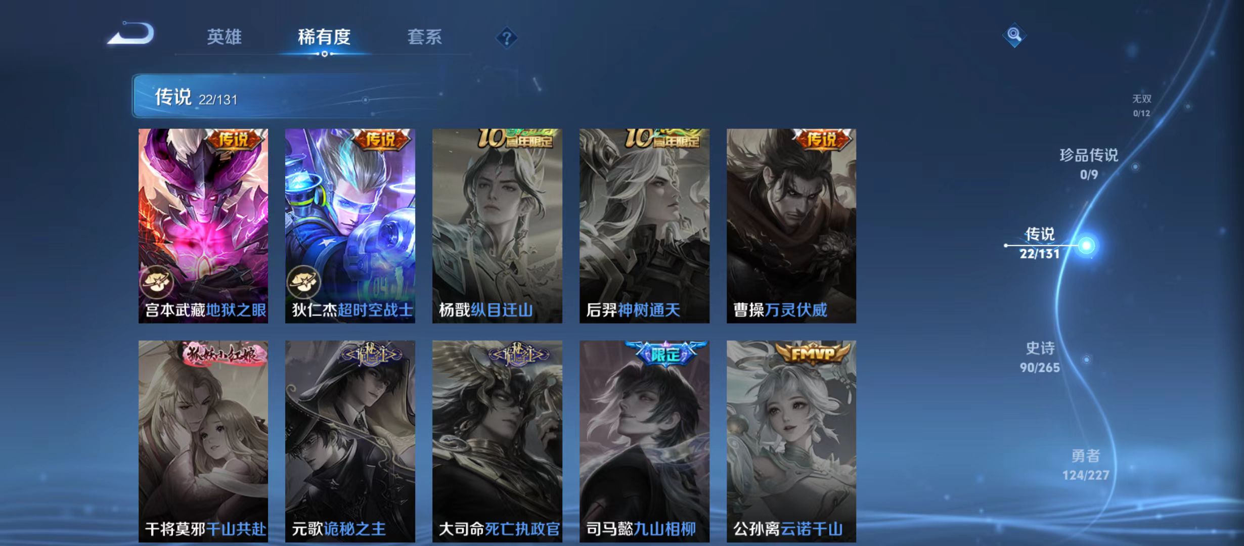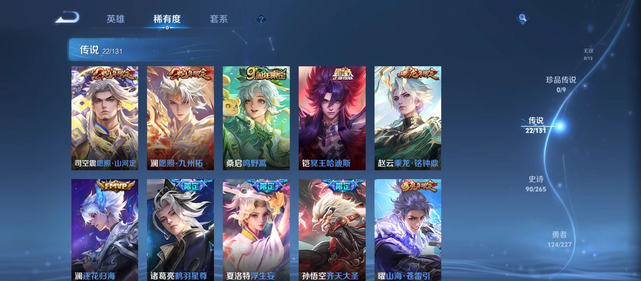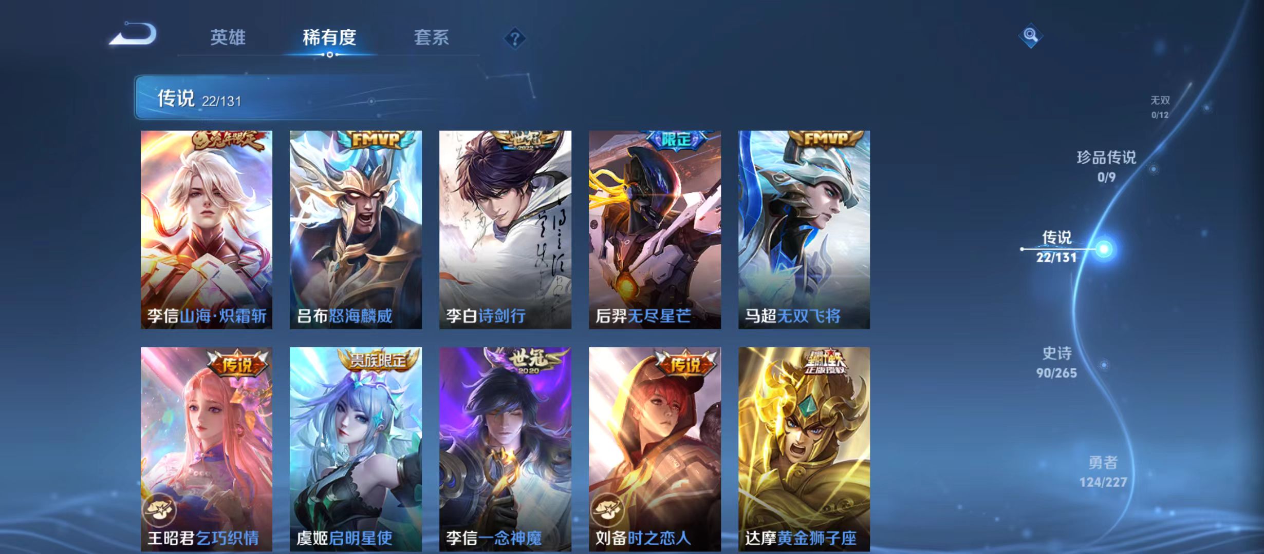 v8-286皮肤 1典藏鸣剑·曳影 22传说黄金狮子座,愿照·九州拓,愿照·山河定,鸣野蒿,乞巧织情,启明星使,冥王哈迪斯,乘龙·铭钟鼎,逐花归海,鹤羽星尊,无双飞将,浮生妄,超时空战士,地狱之眼,山海·苍雷引,齐天大圣,山海·炽霜斩,时之恋人,怒海麟威,诗剑行,一念神魔,无尽星芒 90史诗