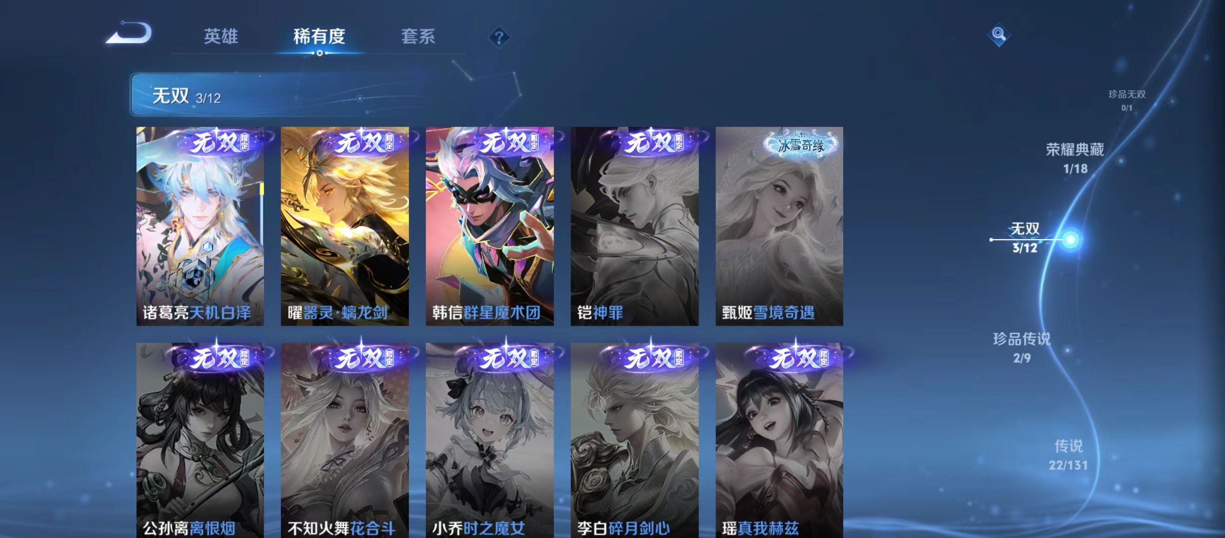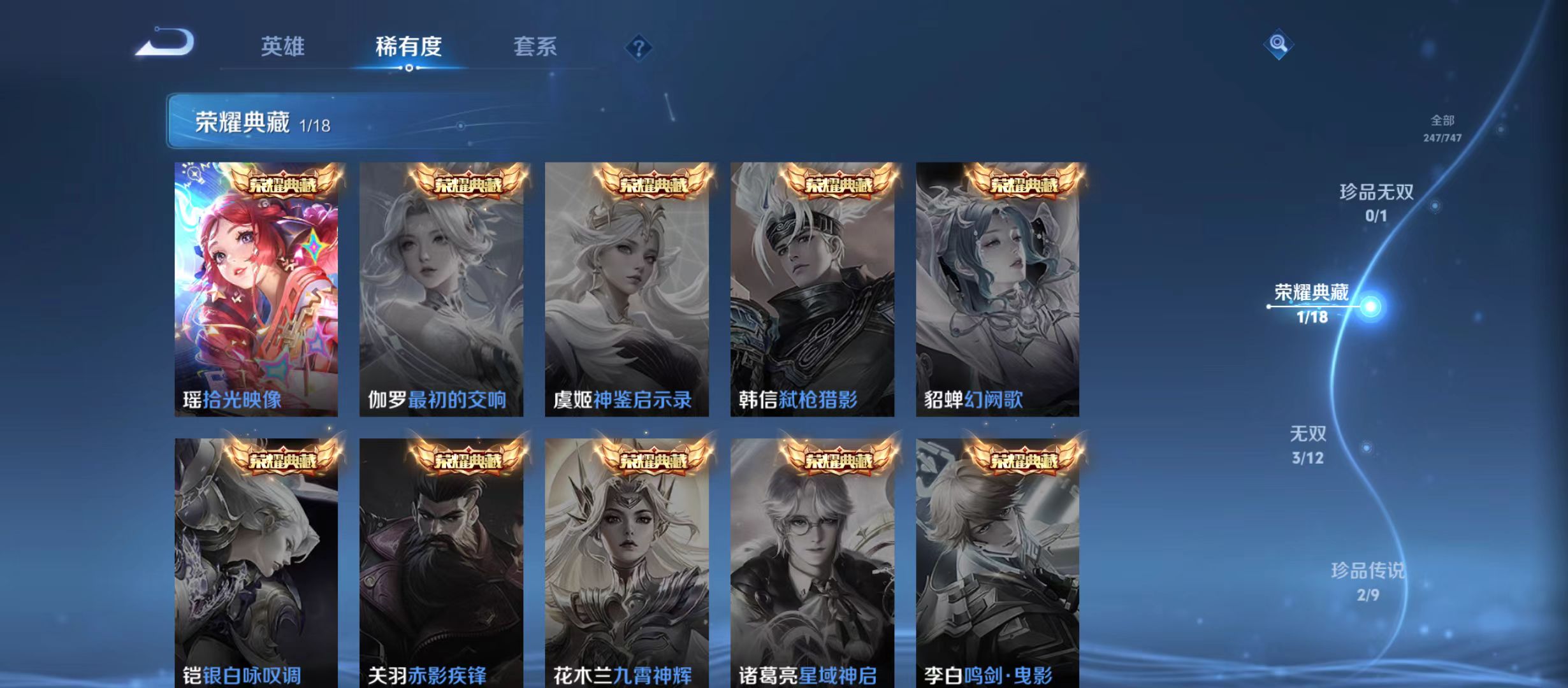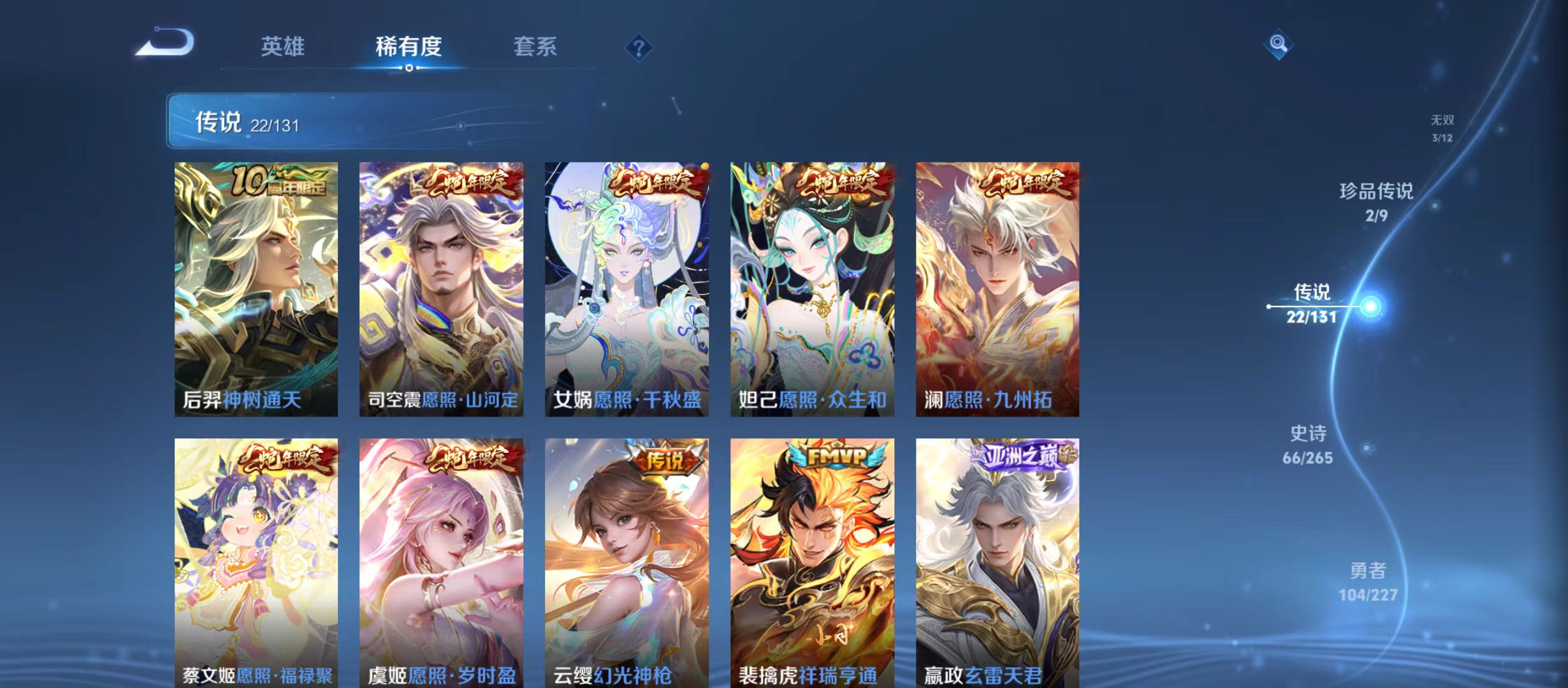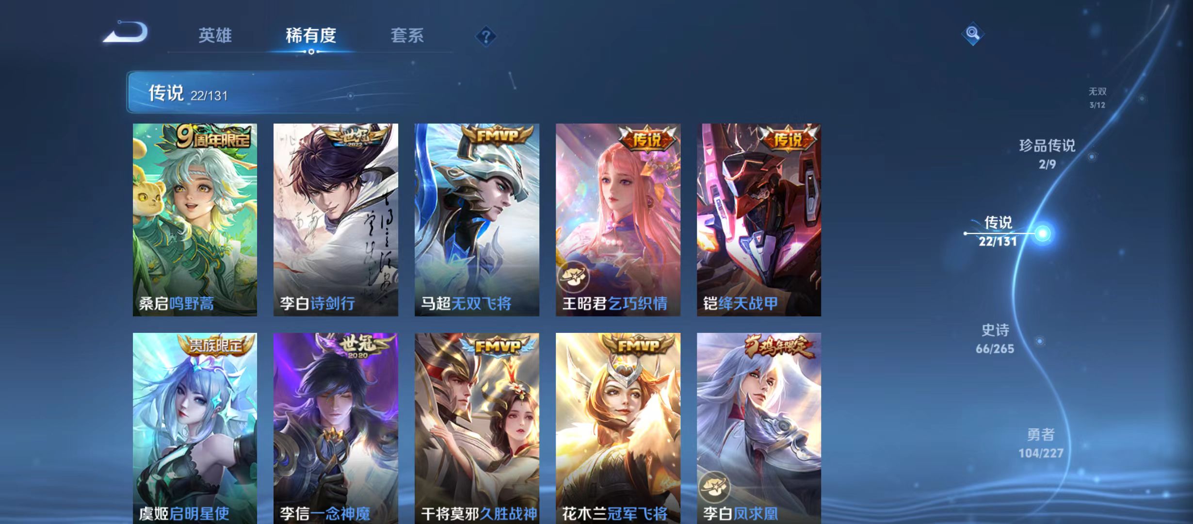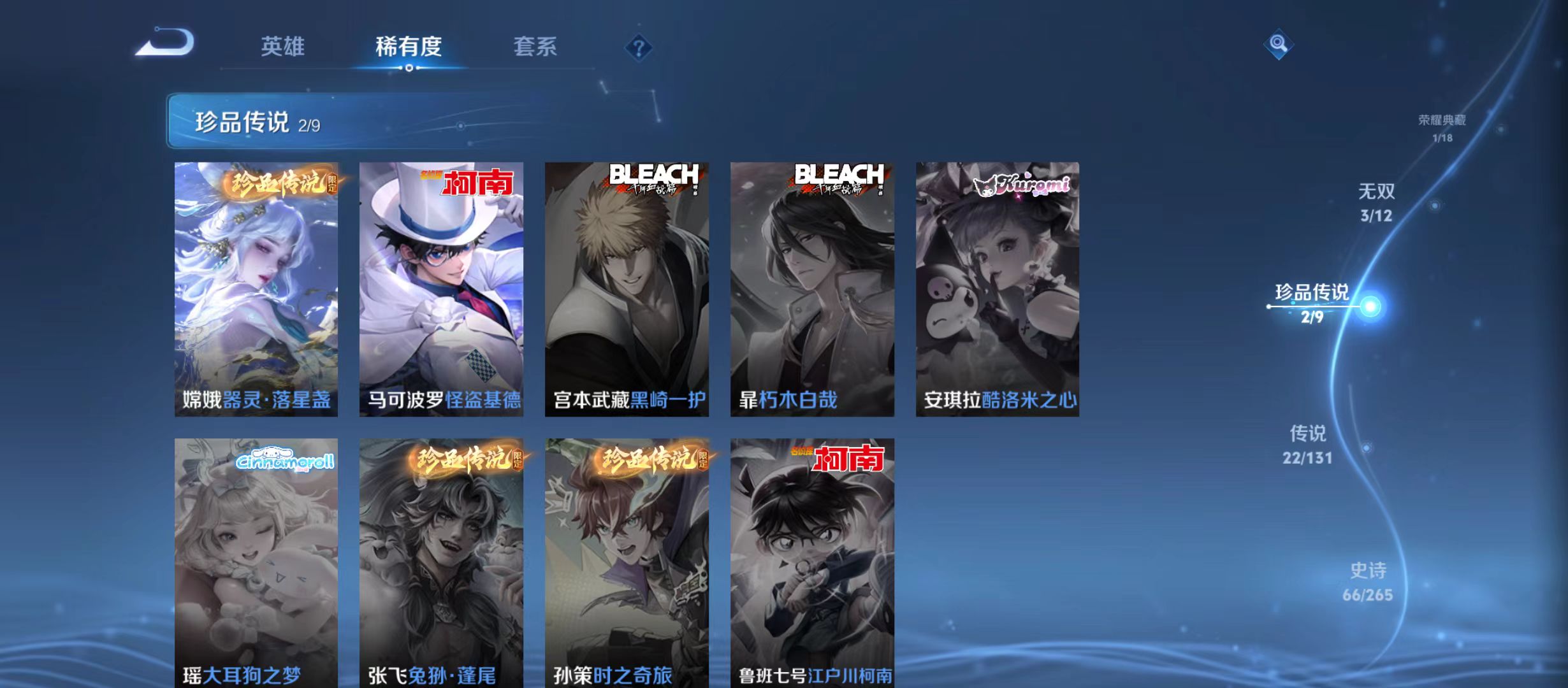 v8-247皮肤 1典藏拾光映像 3无双群星魔术团,天机白泽,器灵·螭龙剑 2珍品怪盗基德,器灵·落星盏 22传说冠军飞将,神树通天,绛天战甲,一念神魔,久胜战神,凤求凰,地狱之眼,地狱火,愿照·九州拓,愿照·福禄聚,玄雷天君,诗剑行,启明星使,愿照·千秋盛,愿照·岁时盈,无双飞将,愿照·山河定,愿照·众生和,幻光神呛,祥瑞亨通,鸣野蒿,乞巧织情 66史诗