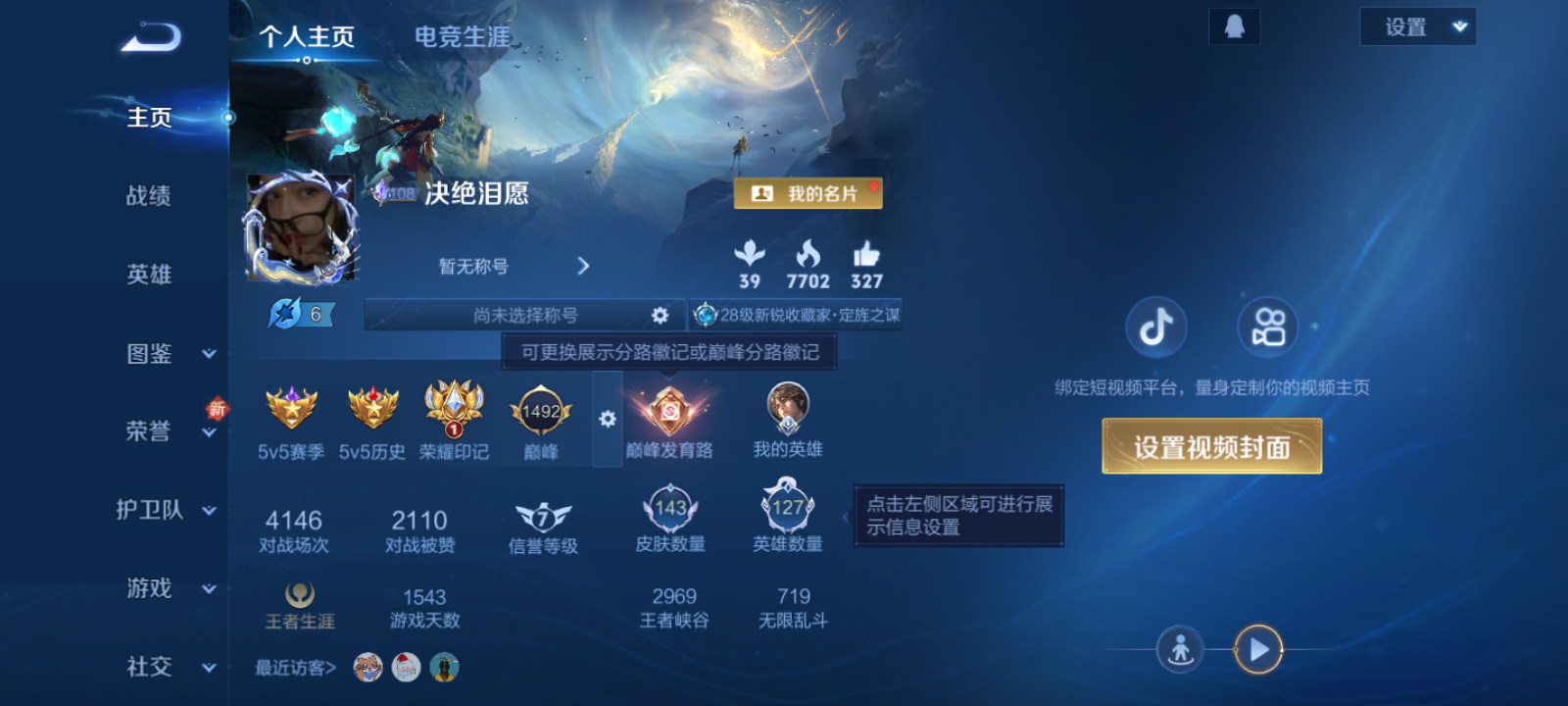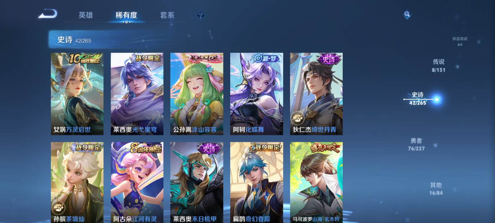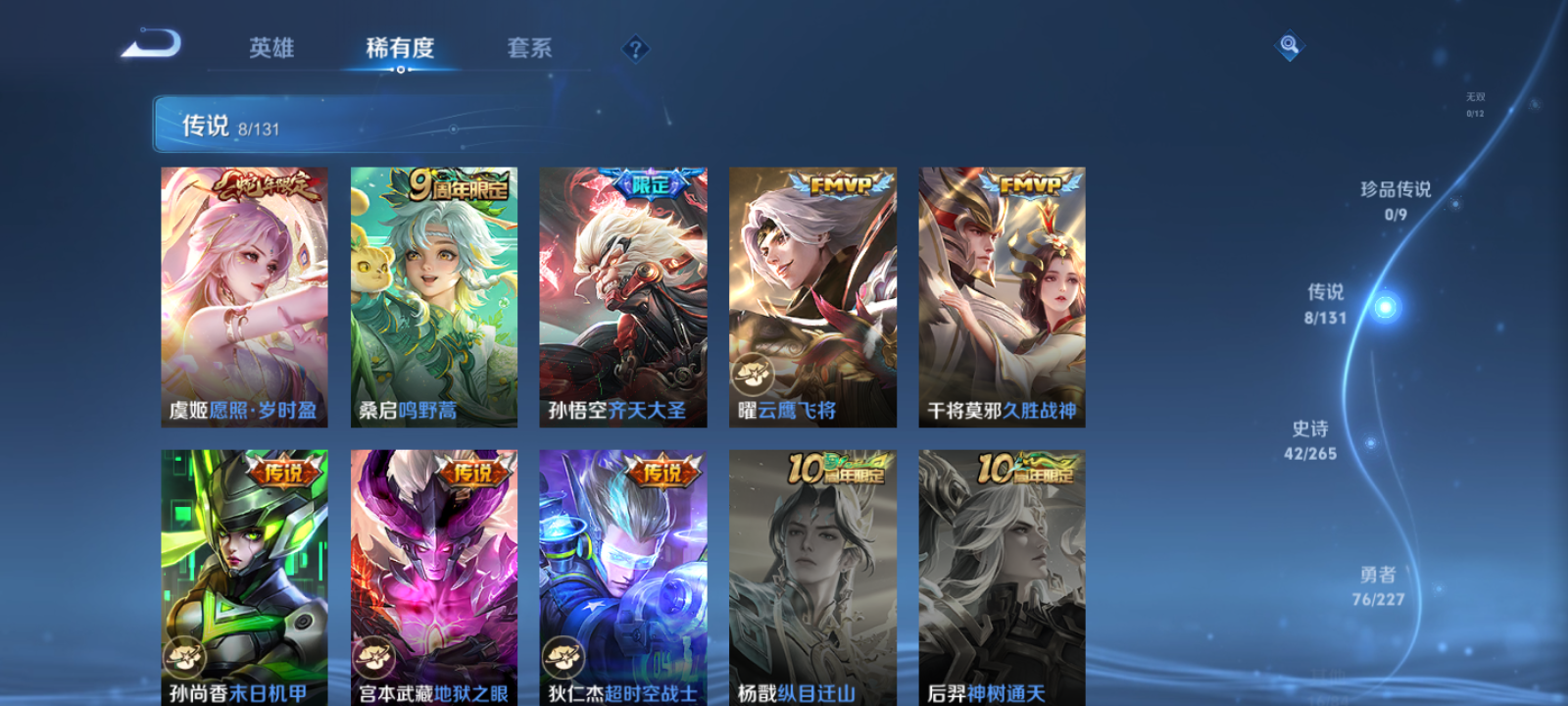 【王者荣耀】【lywz22747】珍品无双0 典藏1 无双0 珍品传说0 传说8 史诗42 英雄127 皮肤143 贵族6级 荣耀典藏:最初的交响__传说皮肤:鸣野蒿|地狱之眼|久胜战神|狄仁杰-超时空战士|云鹰飞将|孙尚香-末日机甲|齐天大圣|愿照·岁时盈__稀有限定:李小龙|山海·玄木吟|唐三藏|大漠名商|电玩高手|古海寻踪|海滩派对|海盐诗旅|胡桃夹子|幻夜卜梦|皇家上将|火炮绅士|江河有灵|金庭之子|魔术师|奇幻香踪|千军破阵|擒涛扼浪|驱傩正仪|沙漠行僧|探海日志|天穹祈灯|午后时光|夜都怪侠|阴阳师|吟游魔法|缤纷独角兽|冰冠公主|冰雪圆舞曲|乘风破浪|德古拉伯爵|功夫厨神|鬼剑武藏|金属风暴|莱西奥-末日机甲|乐园奇幻夜|魅力维加斯|女仆咖啡|偶像歌手|圣诞狂欢|水果甜心|水晶猎龙者|星夜王子|摇滚巨星|鹰眼统帅|幽灵船长|逐浪之夏|紫霞仙子|噬灭天穹|修罗|曙光守护者|心灵战警|特工魅影|茶境仙|谧流熔炉|绮世丹青|化蝶舞|流音漫舞|访茗客|虚灵犬护|逆浪荇歌|涂山容容|光弋星穹|往忆晖光|荣光之誓|万灵启世|鹤鸣心笺__优质皮肤:尼罗河女神|未来旅行|碧珀绯影|锦衣卫|伊势巫女|第七人偶|潮流仙人|芝加哥教父|绝影神呛|前尘|龙域领主|花间舞|灼热之刃|加勒比小姐|功夫炙烤|聚星闪耀|次元突破|野性能量|坚韧之力|功夫老勺|死亡骑士|黄金武士|玩偶对对碰|街头霸王|教廷特使|时空谍影|破局者|零食大作战|西部游侠|胡桃狂想曲|进击墨子号|拳王|救世之瞳|白色死神|大发明家|哥特玫瑰|魅影绮裳|西施-雪境奇遇|爆裂喵拳|景韶洛都|浪漫序章|掌控之力|铁骨偃魂|龙腾万里|孙悟空-西部大镖客|汉昭烈帝|乓乓大师|五福同心|万事如意|曜-归虚梦演|沉稳之力|完美运算|化身博士|花好人间|万象初新|潮玩骑兵|苍林狼骑|蔚蓝守将|特工战影|炽热元素使|春野闲踪|灵野札记|玫蓝誓约|踏浪烽翎|哪吒-罗小黑战记|张良-罗小黑战记|径山谋武__贵族等级:贵族6级__王者段位:非凡王者高质量捡漏皮肤号多限定