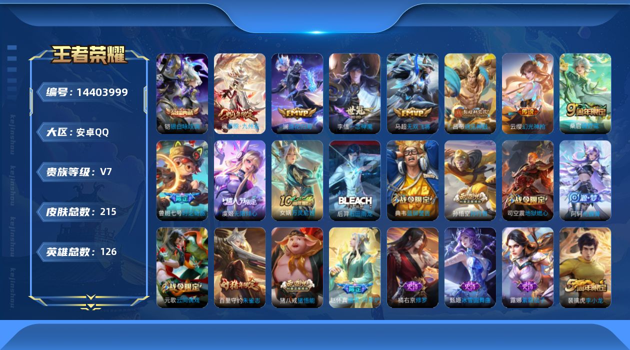 [14403999]v7-126英雄-215皮肤-1典藏-9传说-61史诗 金标暃 cc8373 【荣耀典藏】:铠银白咏叹调 【传说皮肤】:澜愿照九州拓,云缨幻光神呛,桑启鸣野蒿,澜逐花归海,鲁班七号时之奇旅,吕布遇见神鼓,虞姬无限倾心,马超无双飞将,李信一念神魔 【限定皮肤】:姜子牙天穹之誓,狄仁杰阴阳师,赵云皇家上将,墨子神迹守卫,孙尚香蔷薇恋人,鲁班七号时之奇旅,庄周高山流水,白起夜都怪侠,芈月幻夜卜梦,吕布遇见神鼓,元歌云间偶戏,典韦蓝屏警告,狄仁杰魔术师,狄仁杰万华元夜,达摩星际陆战队,达摩沙漠行僧,项羽海滩派对,老夫子航海奇遇记,程咬金演武夺筹,兰陵王金庭之子,亚瑟潮玩骑士王,孙悟空孙行者,后羿圣弓游侠,李元芳匿光侦查者,李元芳云中旅人,虞姬无限倾心,钟馗驱傩正仪,干将莫邪真爱魔法,鬼谷子原初探秘者,黄忠火炮绅士,苏烈千军破阵,百里守约朱雀志,沈梦溪大漠名商,裴擒虎李小龙,裴擒虎擒涛扼浪,猪八戒猪悟能,嫦娥拒霜思,嫦娥暖冬兔眠,鲁班大师探海日志,桑启海盐诗旅,暃星界游侠,艾琳流音漫舞,司空震地狱燃心,阿古朵江河有灵,张良古海寻踪,蒙犽百解令,鬼谷子天穹祈灯,刘邦剑破天穹 【年限皮肤】:百里守约朱雀志 【赛季限定】:狄仁杰万华元夜,达摩沙漠行僧,程咬金演武夺筹,兰陵王金庭之子,张良古海寻踪,李元芳云中旅人,钟馗驱傩正仪,鬼谷子原初探秘者,苏烈千军破阵,沈梦溪大漠名商,裴擒虎擒涛扼浪,鲁班大师探海日志,桑启海盐诗旅,鬼谷子天穹祈灯,刘邦剑破天穹,姜子牙天穹之誓 【战令限定】:墨子神迹守卫,白起夜都怪侠,芈月幻夜卜梦,元歌云间偶戏,典韦蓝屏警告,达摩星际陆战队,老夫子航海奇遇记,艾琳流音漫舞,亚瑟潮玩骑士王,后羿圣弓游侠,干将莫邪真爱魔法,黄忠火炮绅士,嫦娥暖冬兔眠,司空震地狱燃心,暃星界游侠 【史诗皮肤】:露娜紫霞仙子,赵云皇家上将,赵云未来纪元,貂蝉圣诞恋歌,甄姬冰雪圆舞曲,王昭君偶像歌手,狄仁杰魔术师,宫本武藏鬼剑武藏,孙尚香蔷薇恋人,孙尚香水果甜心,妲己魅力维加斯,妲己女仆咖啡,墨子金属风暴,吕布圣诞狂欢,刘禅绅士熊喵,李白千年之狐,张飞乱世虎臣,刘邦德古拉伯爵,夏侯惇乘风破浪,小乔缤纷独角兽,兰陵王暗隐猎兽者,诸葛亮黄金分割率,亚瑟心灵战警,雅典娜冰冠公主,安琪拉心灵骇客,百里守约特工魅影,铠曙光守护者,蔡文姬舞动绿茵,刘禅天才门将,李元芳逐浪之夏,程咬金功夫厨神,阿