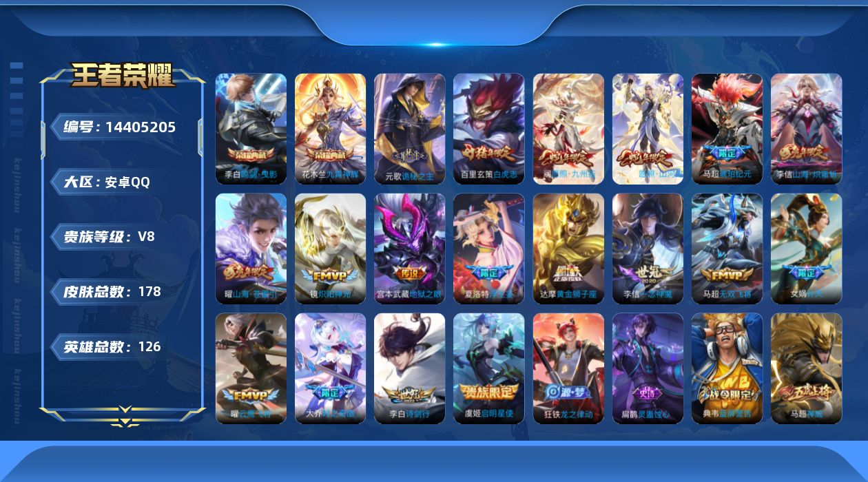 v8 2典藏 18传说 126英雄 178皮肤 可修改实名 【英雄全皮】:李信全皮司空震全皮元歌全皮 【稀有英雄】:大司命嬴政始皇帝韩信韩跳跳夏洛特夏师傅艾琳橘右京橘子娜可露露鸟人不知火舞赵云金蝉唐僧戈娅 【荣耀水晶】:鸣剑·曳影九霄神辉木兰典藏