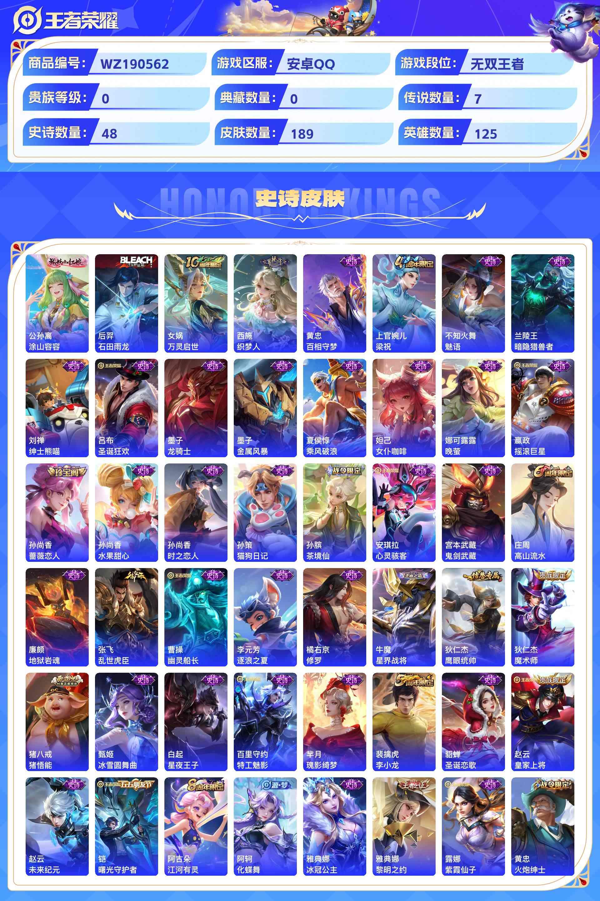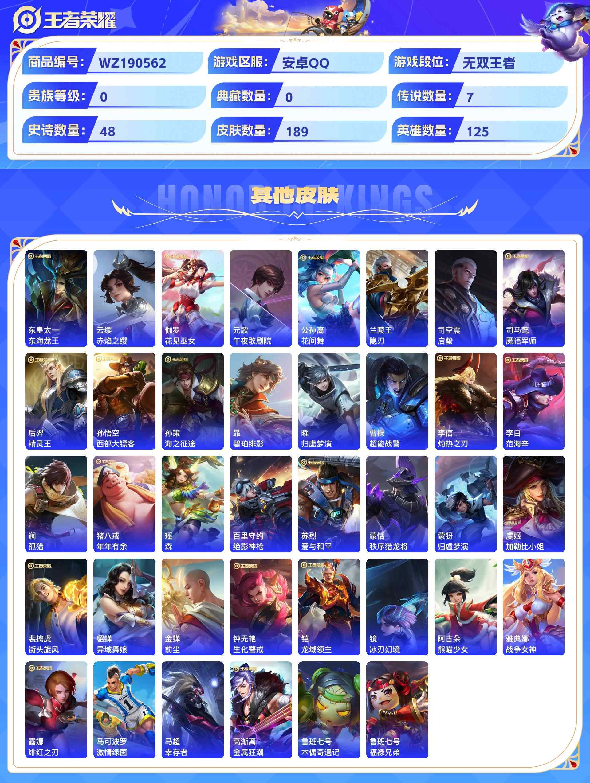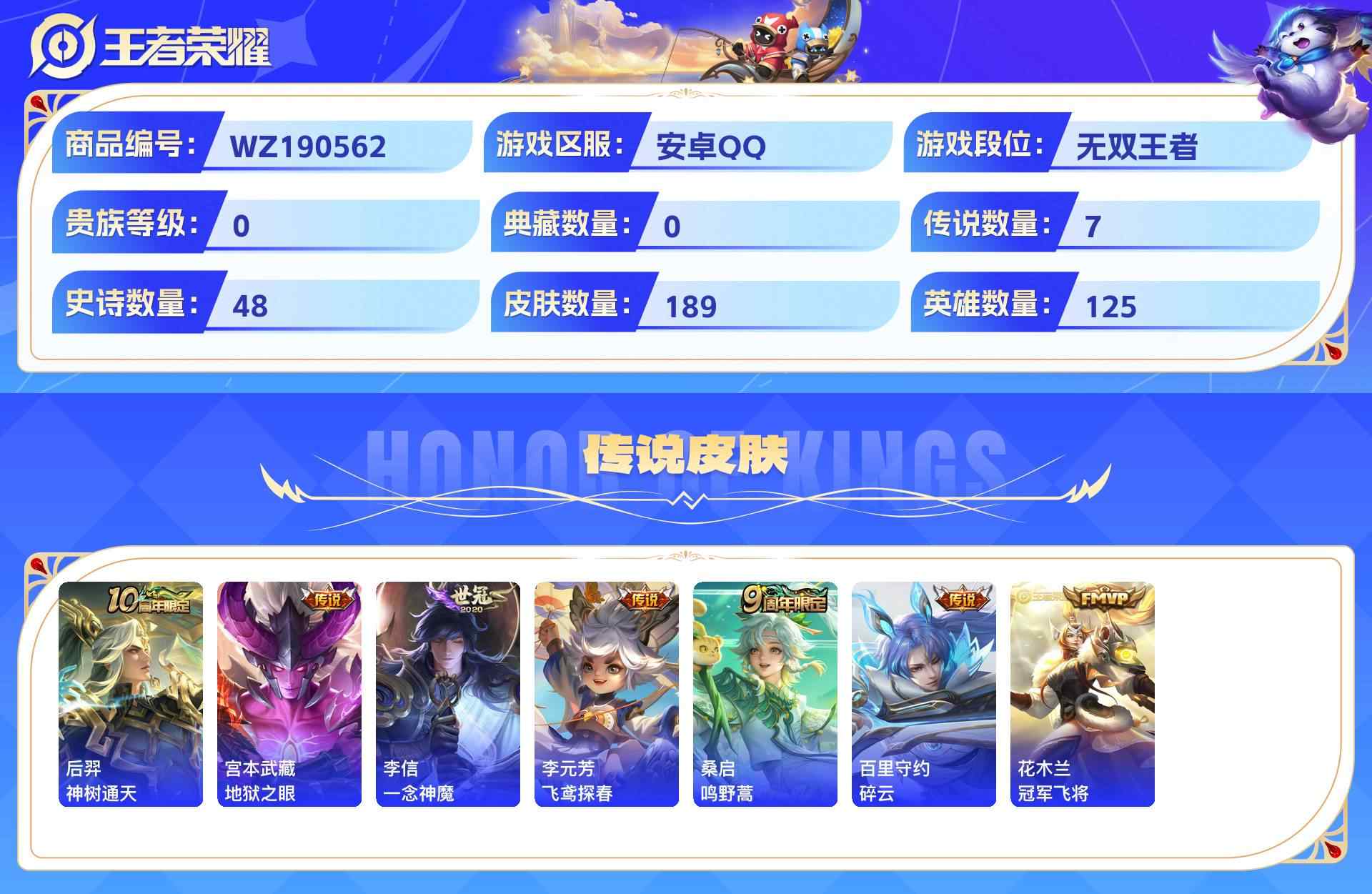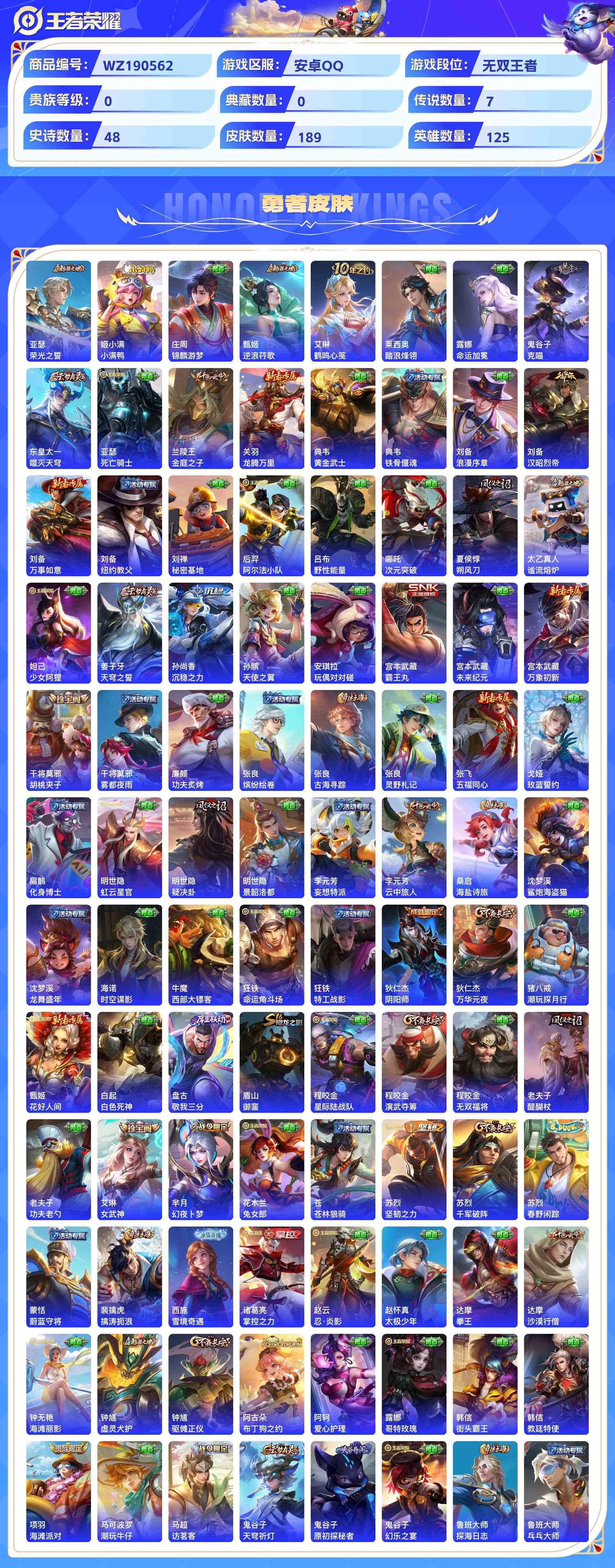 wz190562|精品号【传说皮肤】神树通天地狱之眼一念神魔飞鸢探春鸣野蒿碎云冠军飞将安卓qq 贵族6 189皮 7传说 48史诗1星传说6个性按键1天幕