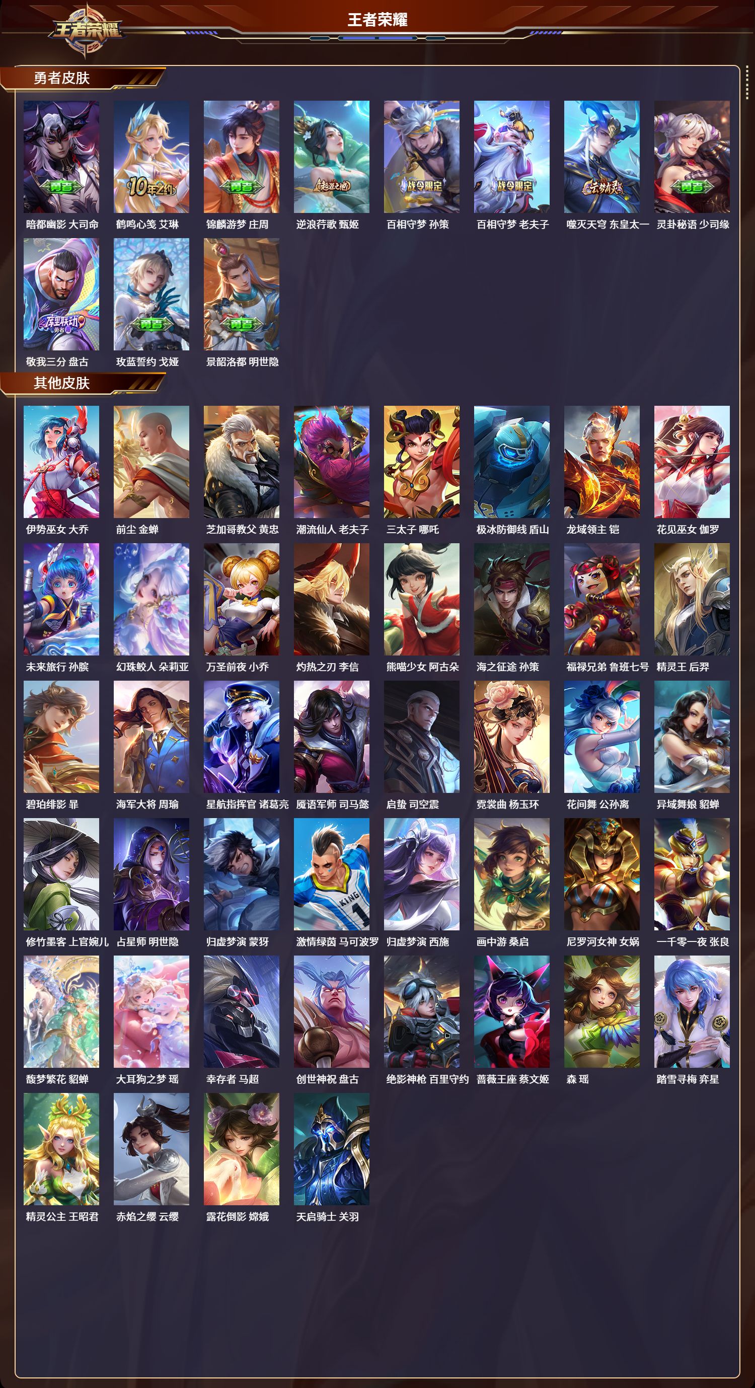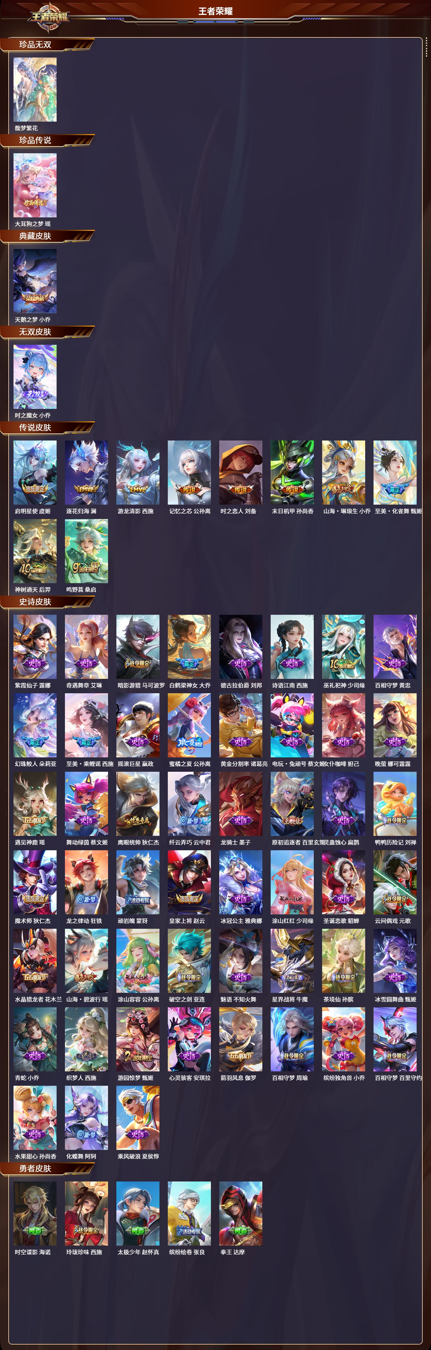 苹果qq/非凡王者/193皮肤/115英雄/1典藏/1珍品无双/1无双/1珍品传说/10传说/51史诗/8稀有英雄【1 珍品无双】馥梦繁花【1 珍品传说】大耳狗之梦 瑶【1 典藏皮肤】天鹅之梦 小乔【1 无双皮肤】时之魔女 小乔【10 传说皮肤】启明星使 虞姬逐花归海 澜游龙清影 西施记忆之芯 公孙离时之恋人 刘备末日机甲 孙尚香山海·琳琅生 小乔至美·化雀舞 甄姬神树通天