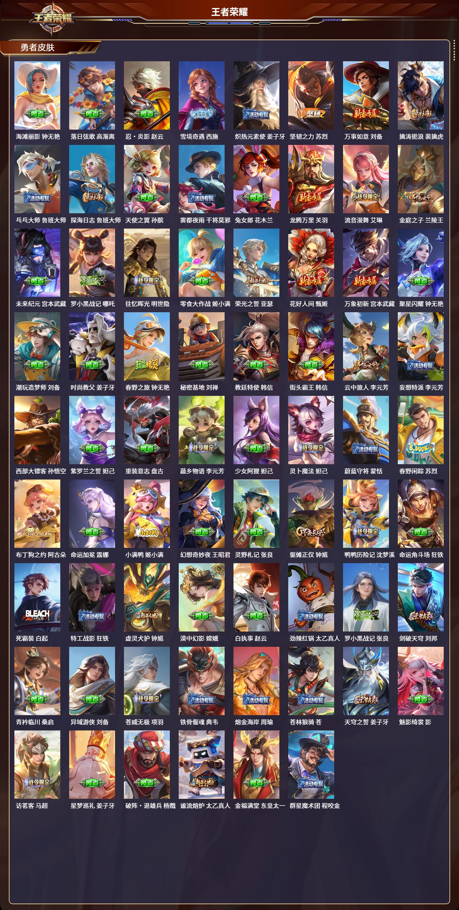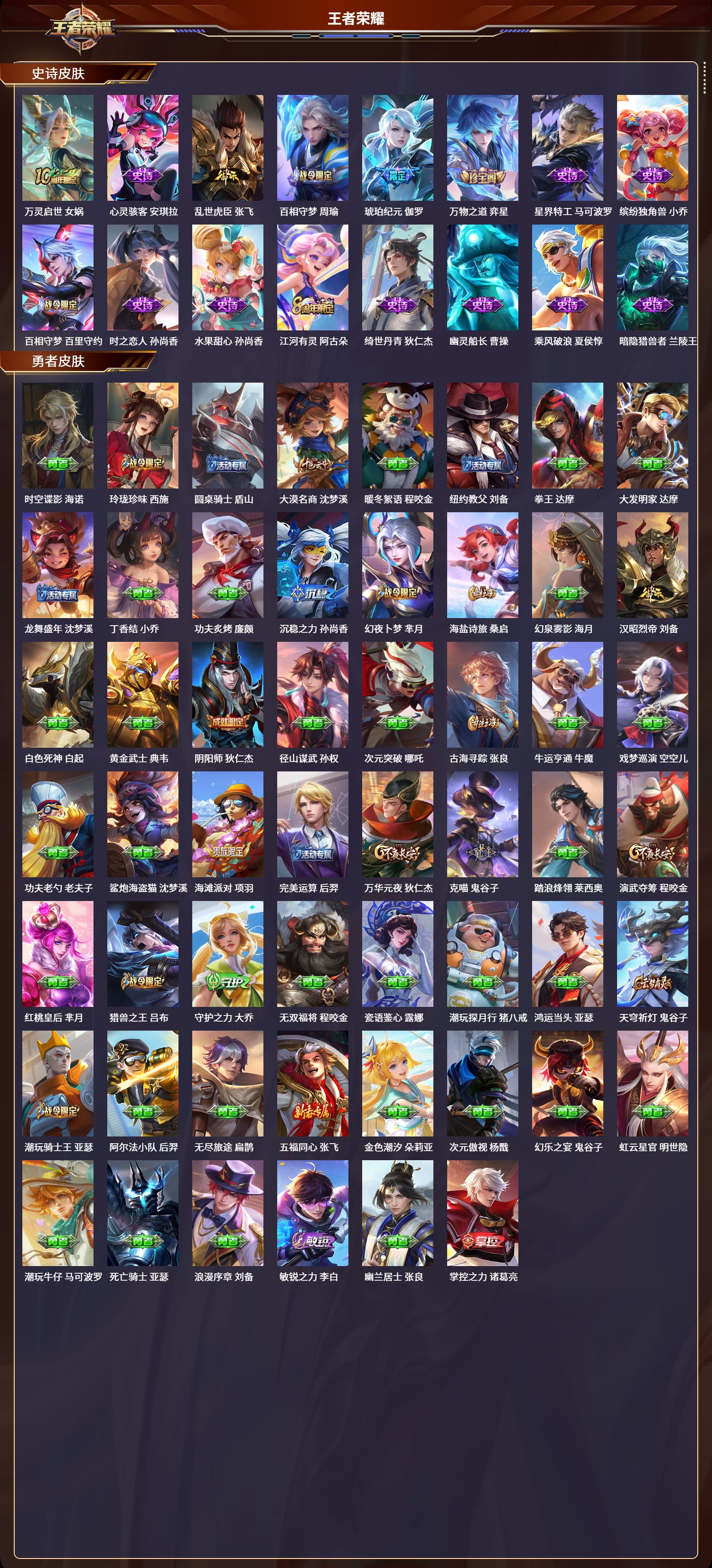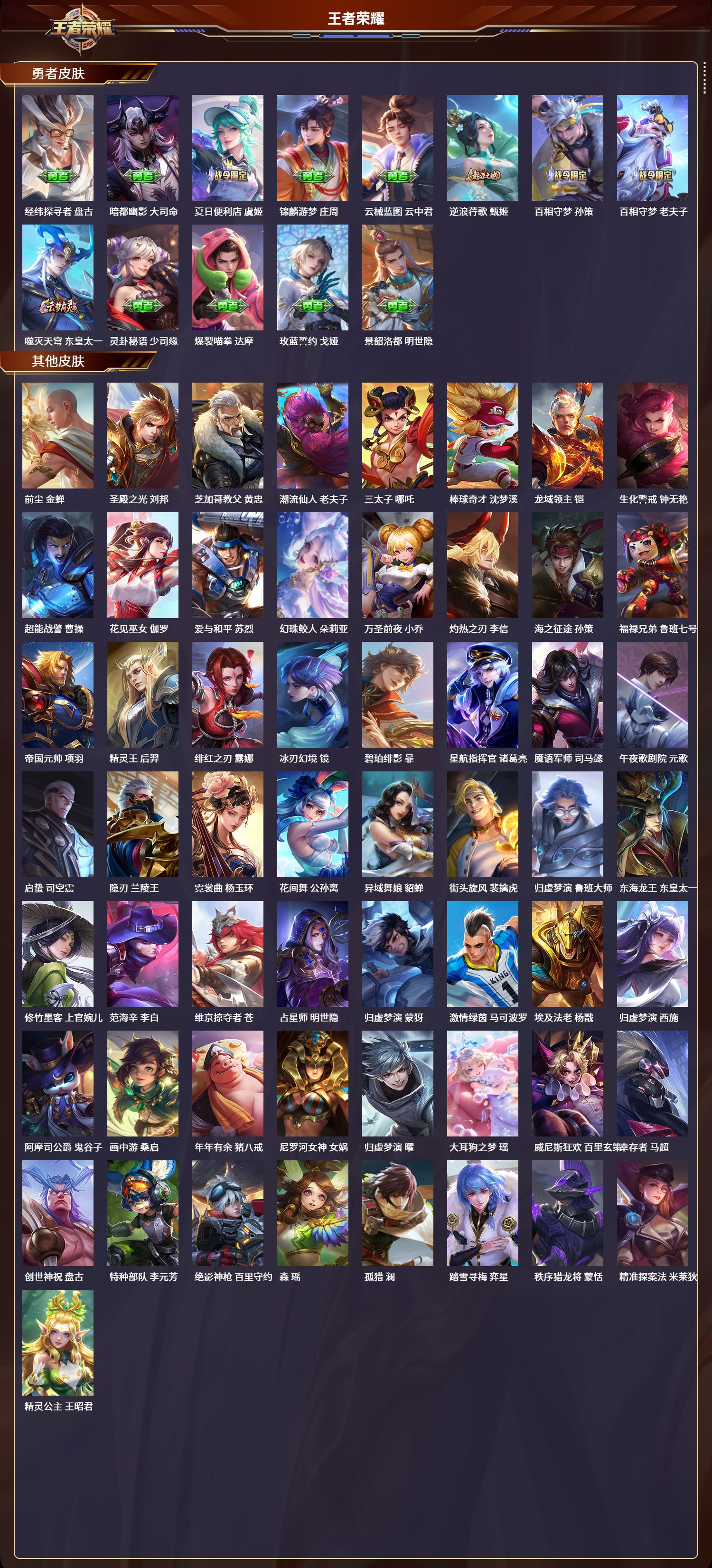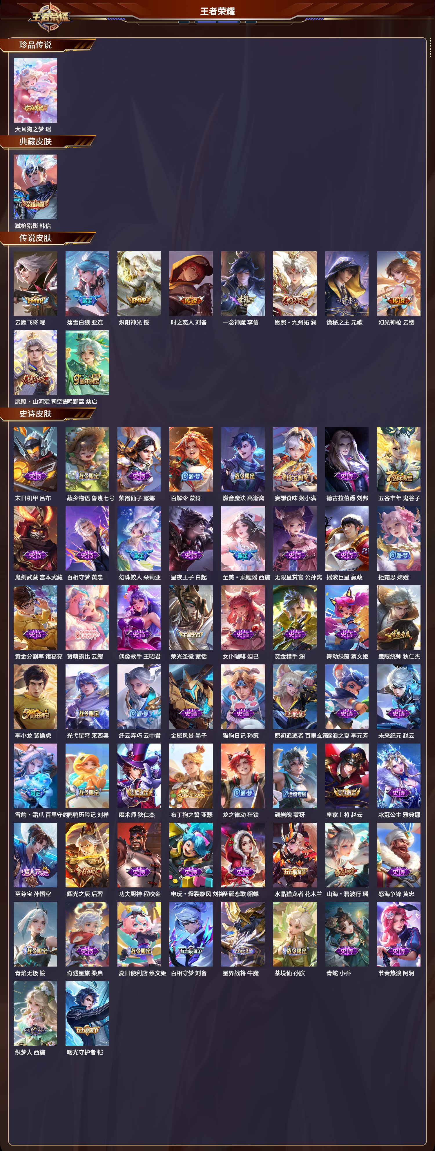 安卓qq/非凡王者/283皮肤/125英雄/1典藏/0珍品无双/0无双/1珍品传说/10传说/74史诗/9稀有英雄【1 珍品传说】大耳狗之梦 瑶【1 典藏皮肤】弑呛猎影 韩信【10 传说皮肤】云鹰飞将 曜落雪白狼 亚连炽阳神光 镜时之恋人 刘备一念神魔 李信愿照·九州拓 澜诡秘之主 元歌幻光神呛 云缨愿照·山河定 司空震鸣野蒿 桑启【74 史诗皮肤】末日机甲 吕布蔬乡物语