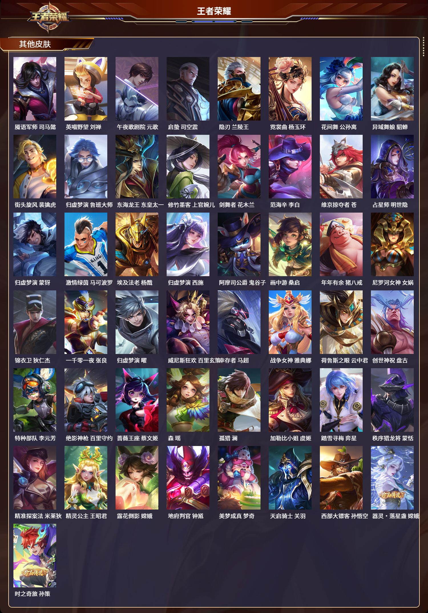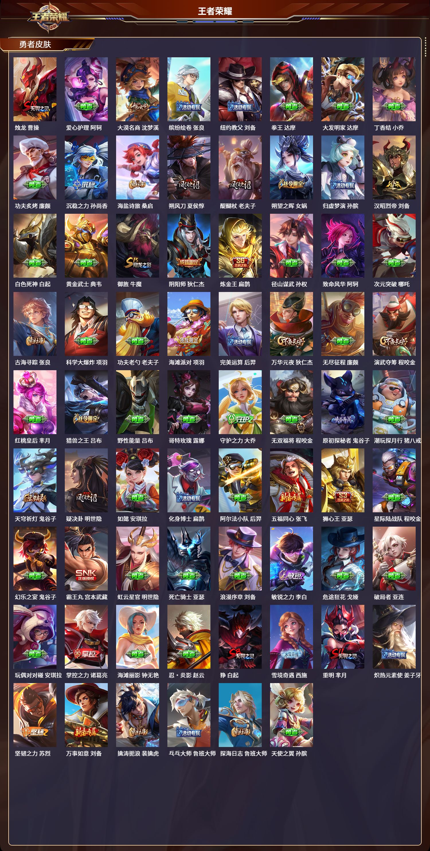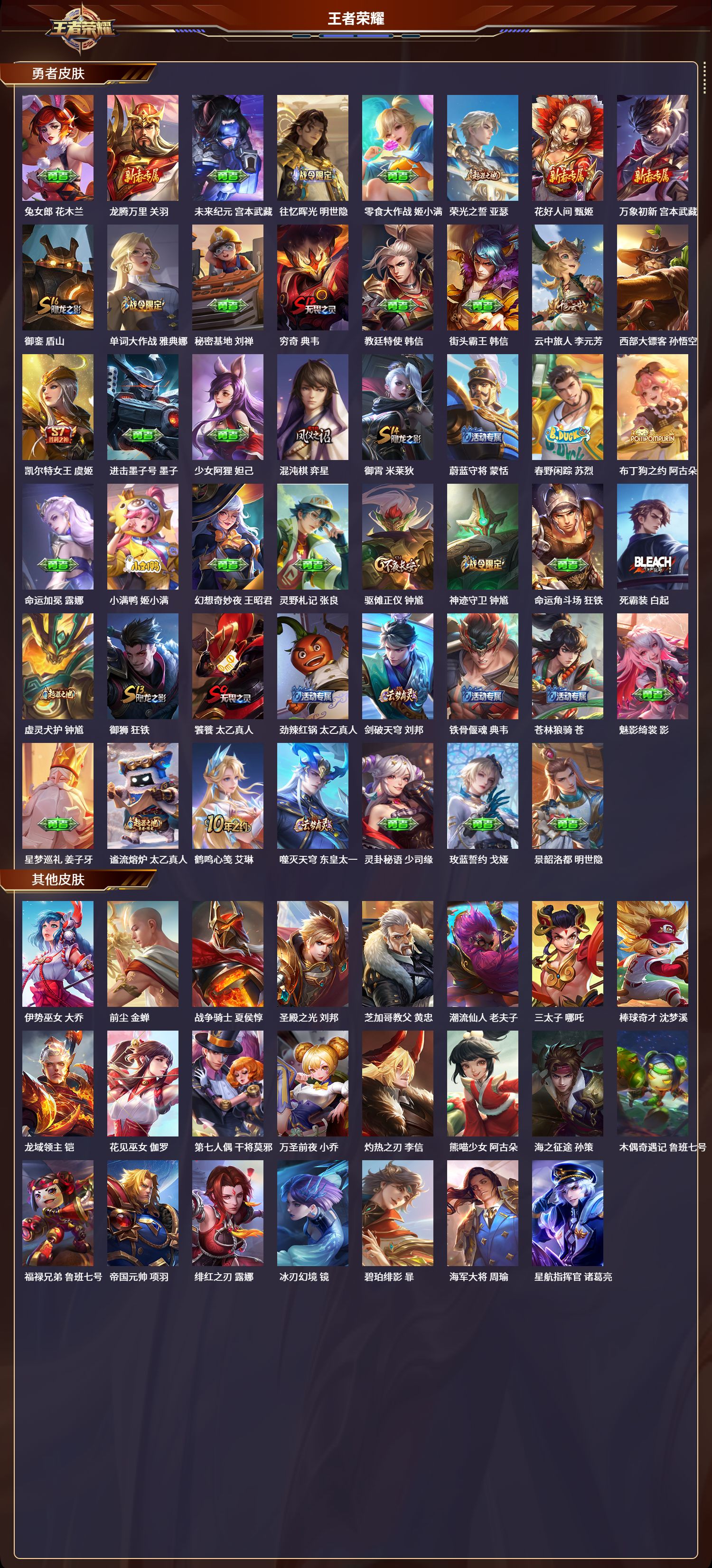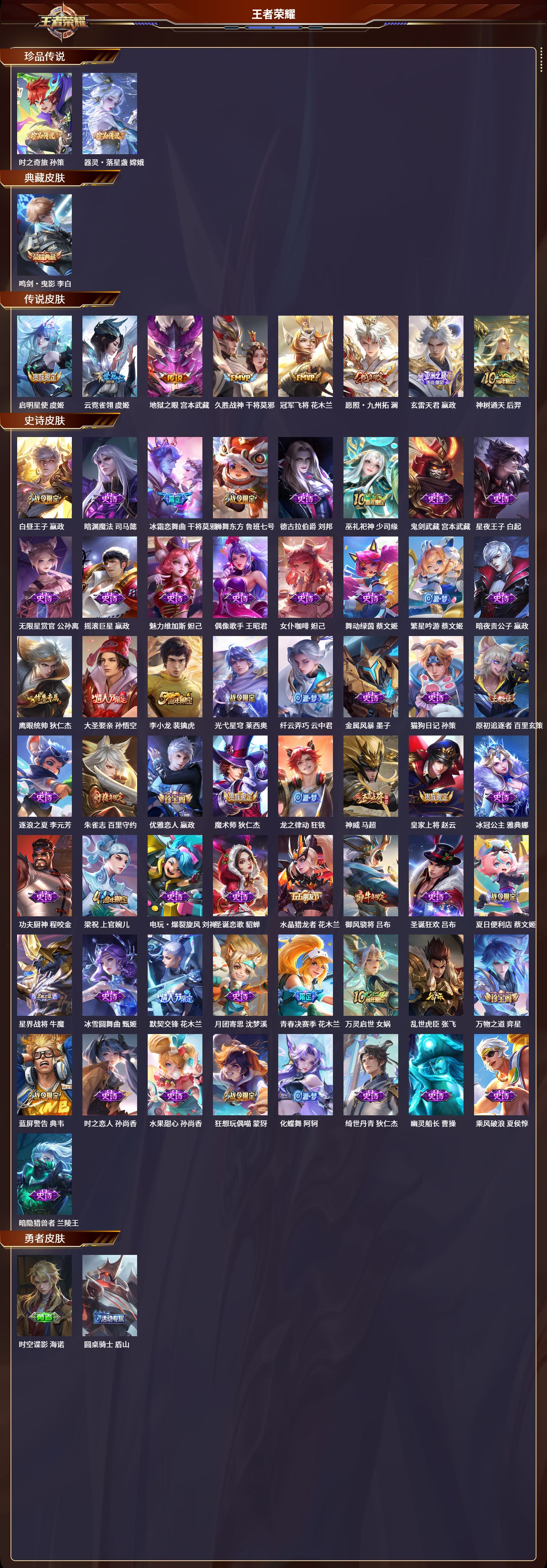安卓qq/荣耀王者/257皮肤/124英雄/1典藏/0珍品无双/0无双/2珍品传说/8传说/57史诗/8稀有英雄【2 珍品传说】时之奇旅 孙策器灵·落星盏 嫦娥【1 典藏皮肤】鸣剑·曳影 李白【8 传说皮肤】启明星使 虞姬云霓雀翎 虞姬地狱之眼 宫本武藏久胜战神 干将莫邪冠军飞将 花木兰愿照·九州拓 澜玄雷天君 嬴政神树通天 后羿【57 史诗皮肤】白昼王子 嬴政暗渊魔法 司