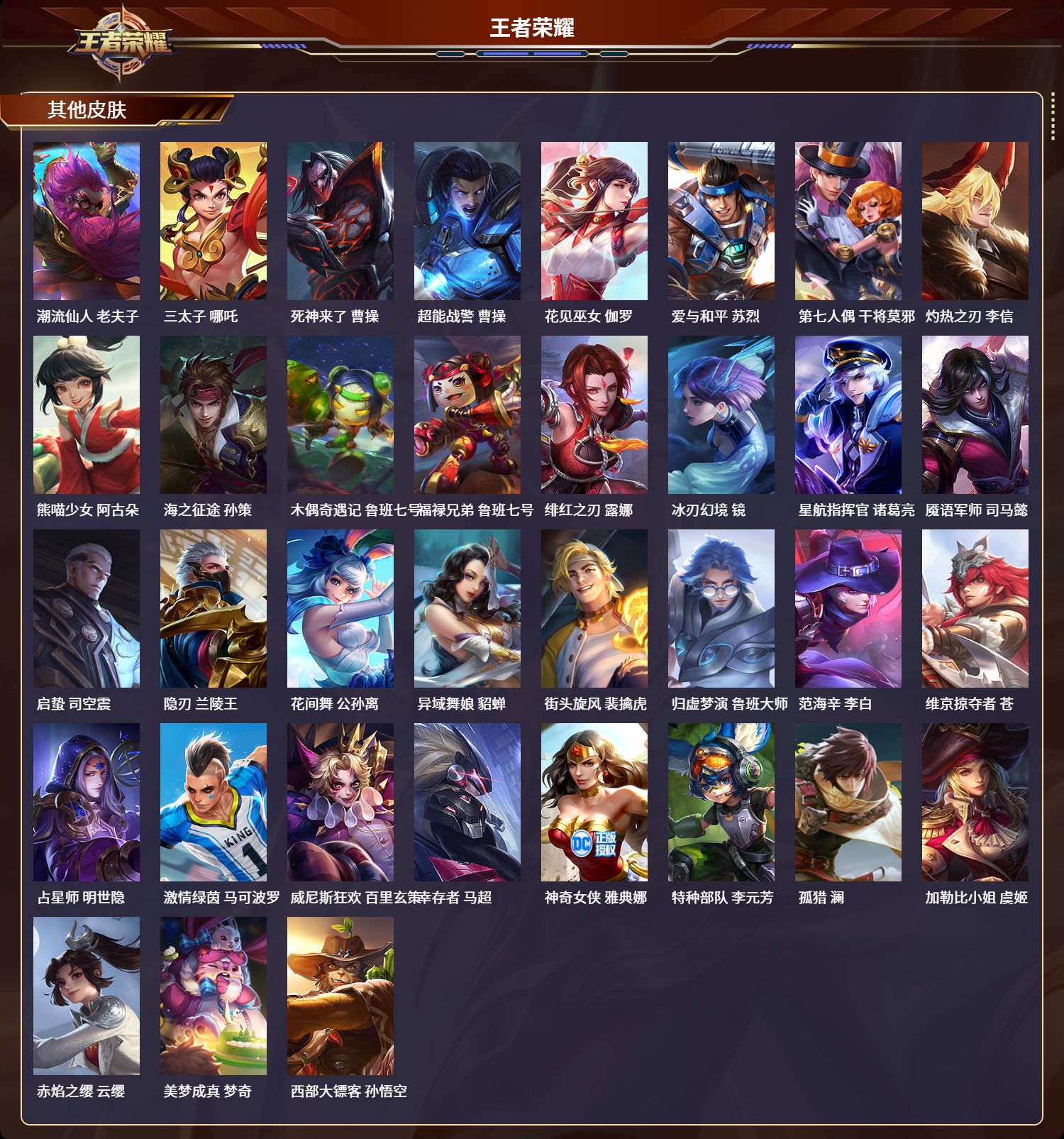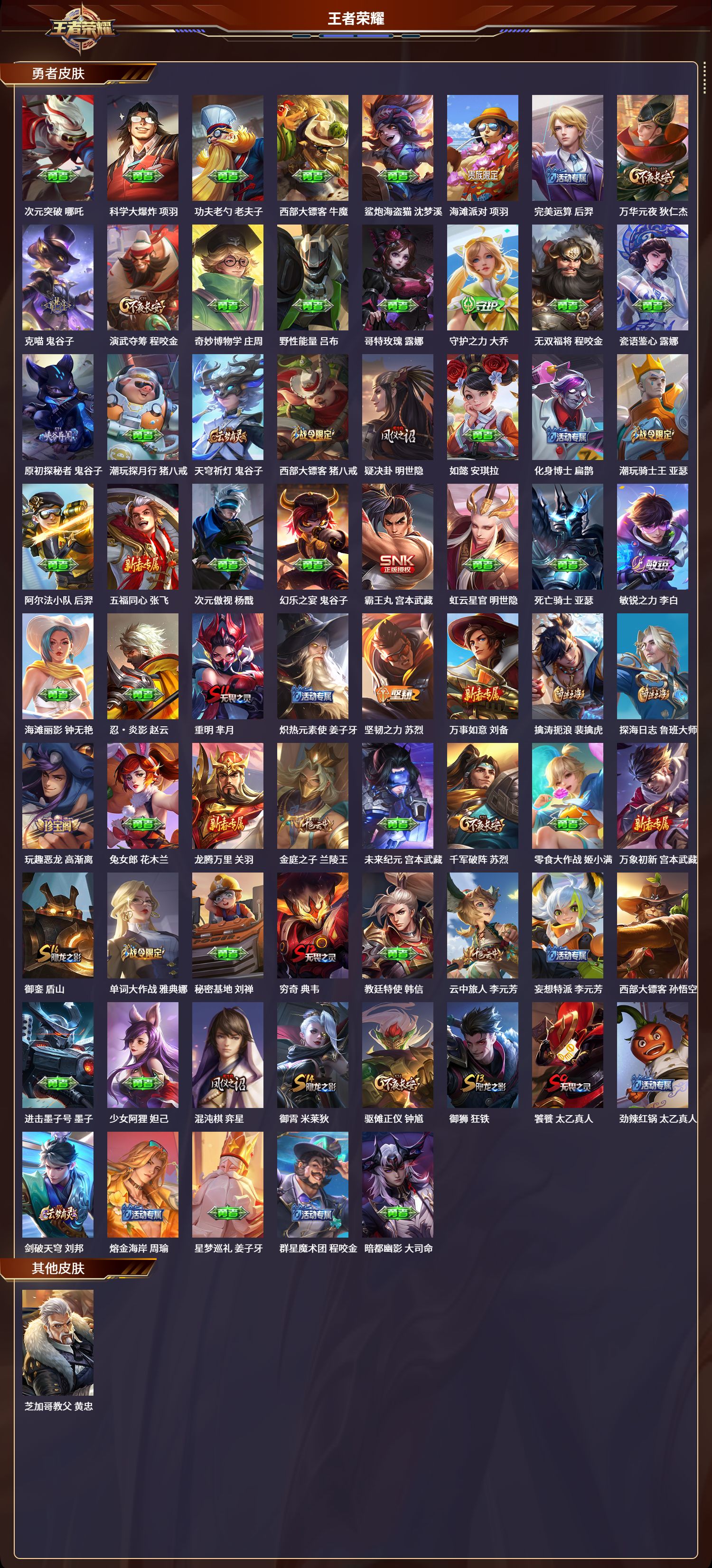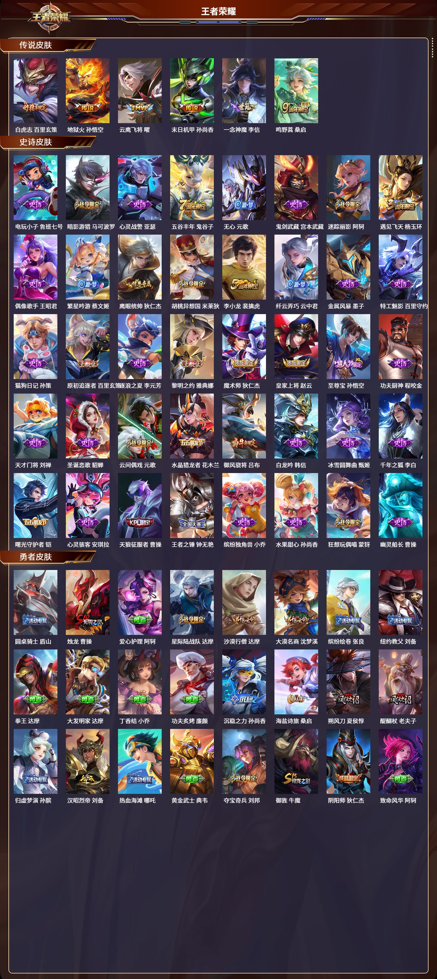 安卓qq/永恒钻石/174皮肤/123英雄/0典藏/0珍品无双/0无双/0珍品传说/6传说/40史诗/7稀有英雄【6 传说皮肤】白虎志 百里玄策地狱火 孙悟空云鹰飞将 曜末日机甲 孙尚香一念神魔 李信鸣野蒿 桑启【40 史诗皮肤】电玩小子 鲁班七号暗影游猎 马可波罗心灵战警 亚瑟五谷丰年 鬼谷子无心 元歌鬼剑武藏 宫本武藏迷踪丽影 阿轲遇见飞天 杨玉环偶像歌手 王昭君