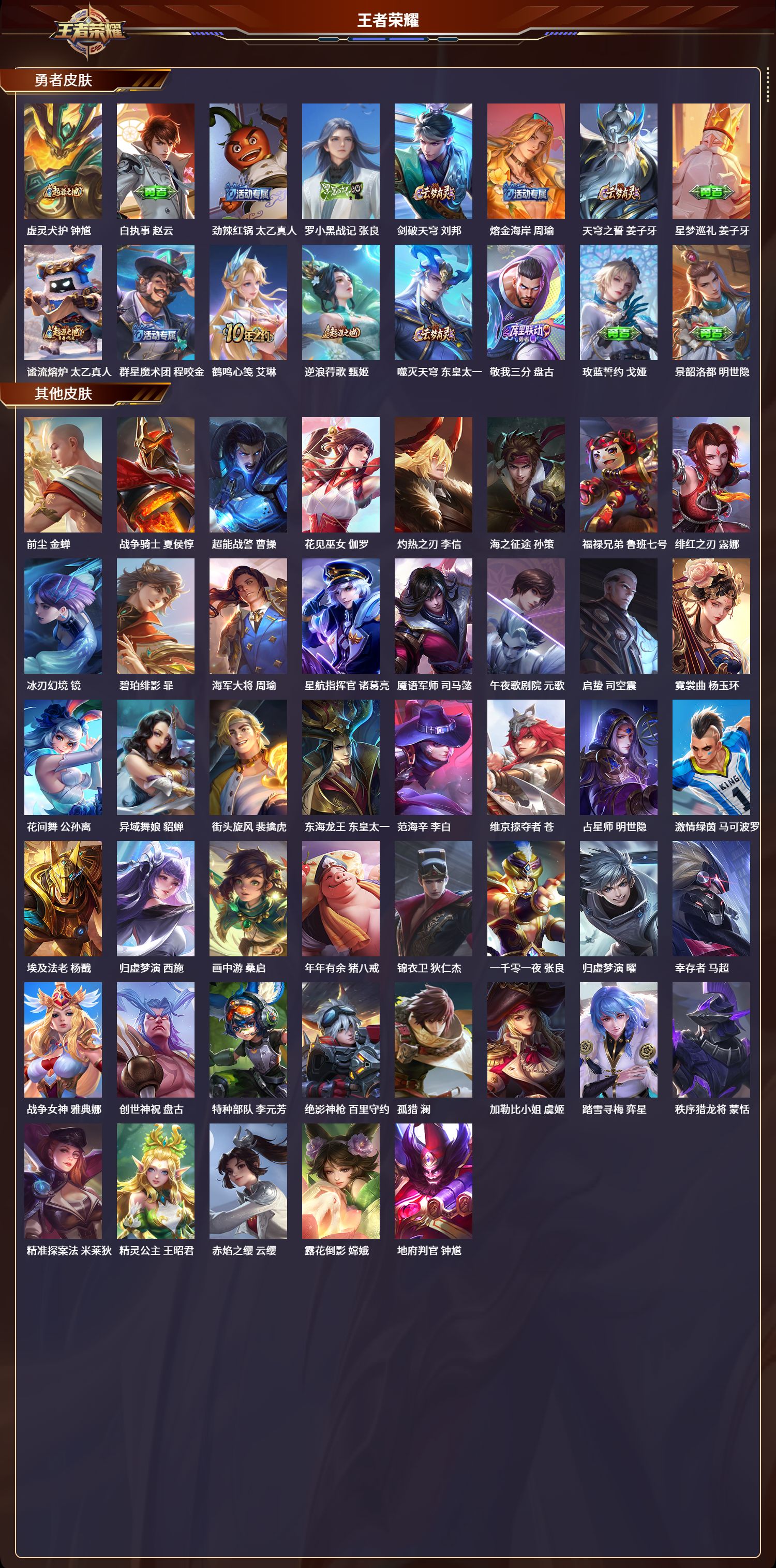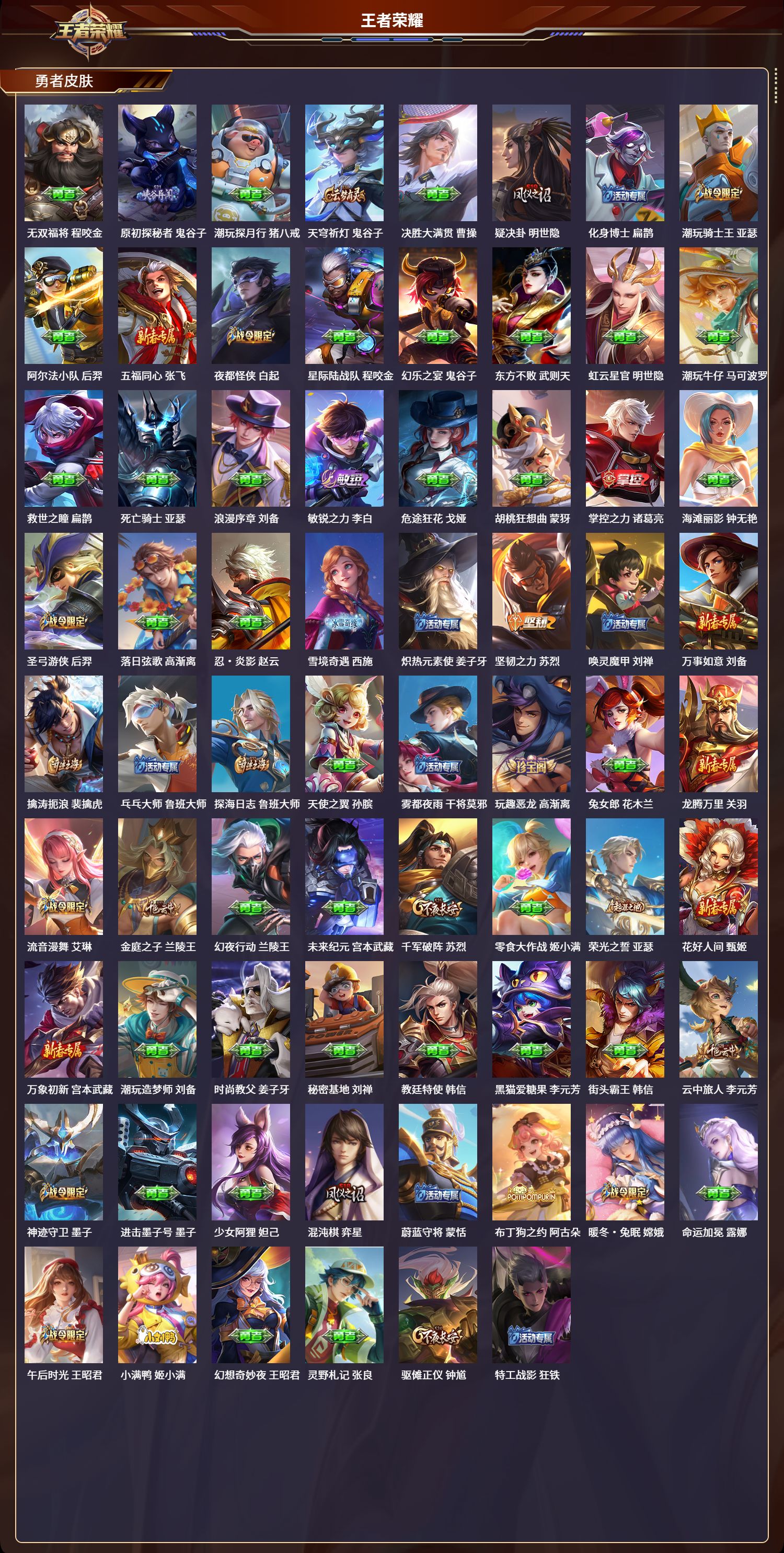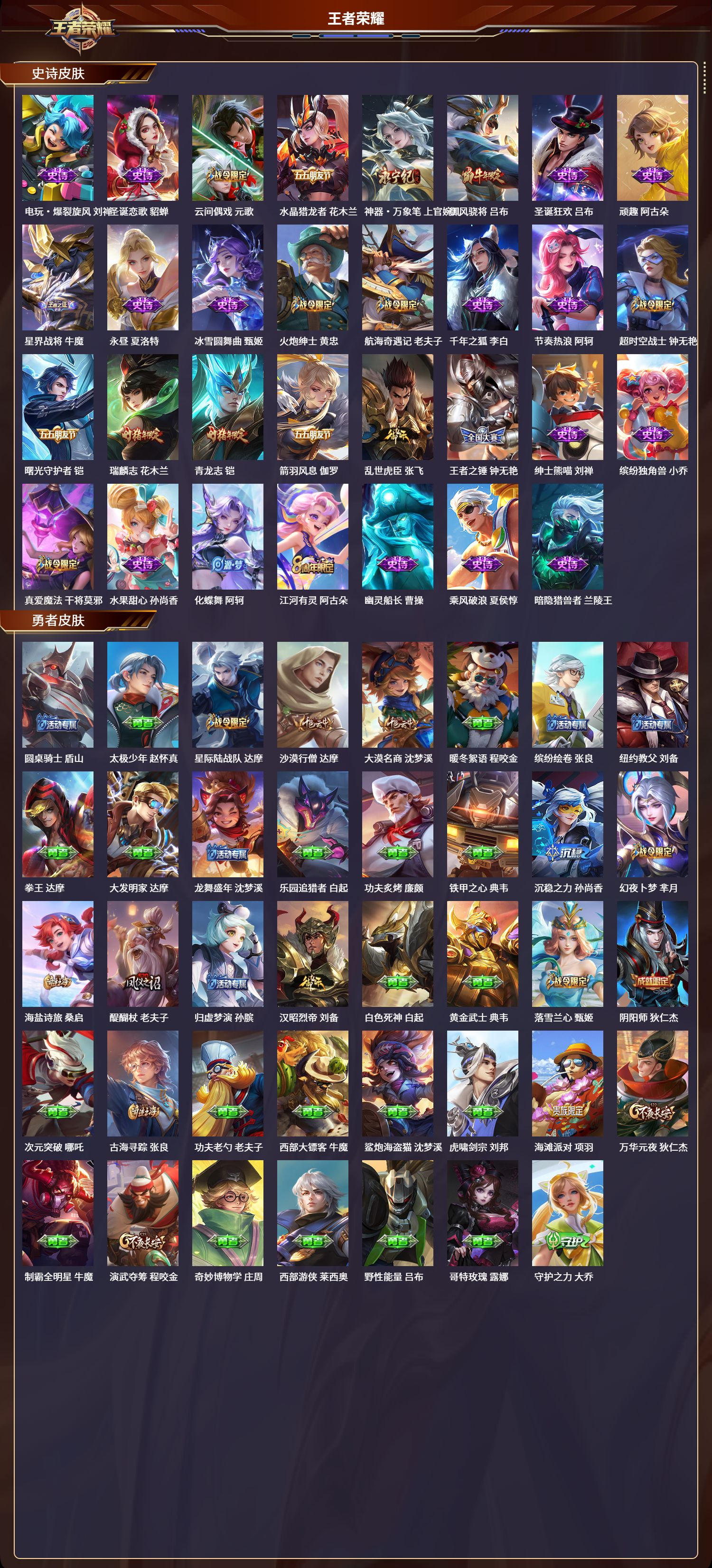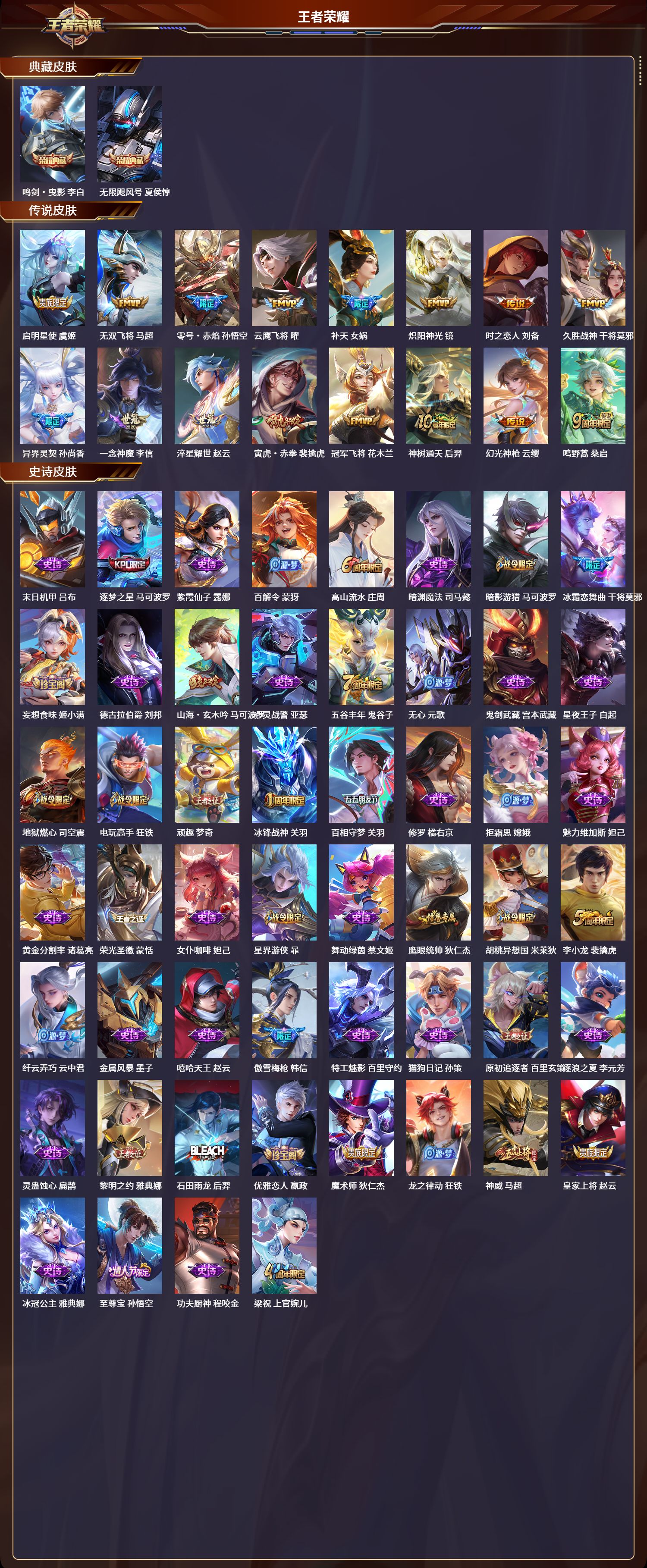 安卓qq/至圣王者/273皮肤/125英雄/2典藏/0珍品无双/0无双/0珍品传说/16传说/83史诗/9稀有英雄【2 典藏皮肤】鸣剑·曳影 李白无限飓风号 夏侯惇【16 传说皮肤】启明星使 虞姬无双飞将 马超零号·赤焰 孙悟空云鹰飞将 曜补天 女娲炽阳神光 镜时之恋人 刘备久胜战神 干将莫邪异界灵契 孙尚香一念神魔 李信淬星耀世 赵云寅虎·赤拳 裴擒虎冠军飞将 花木兰