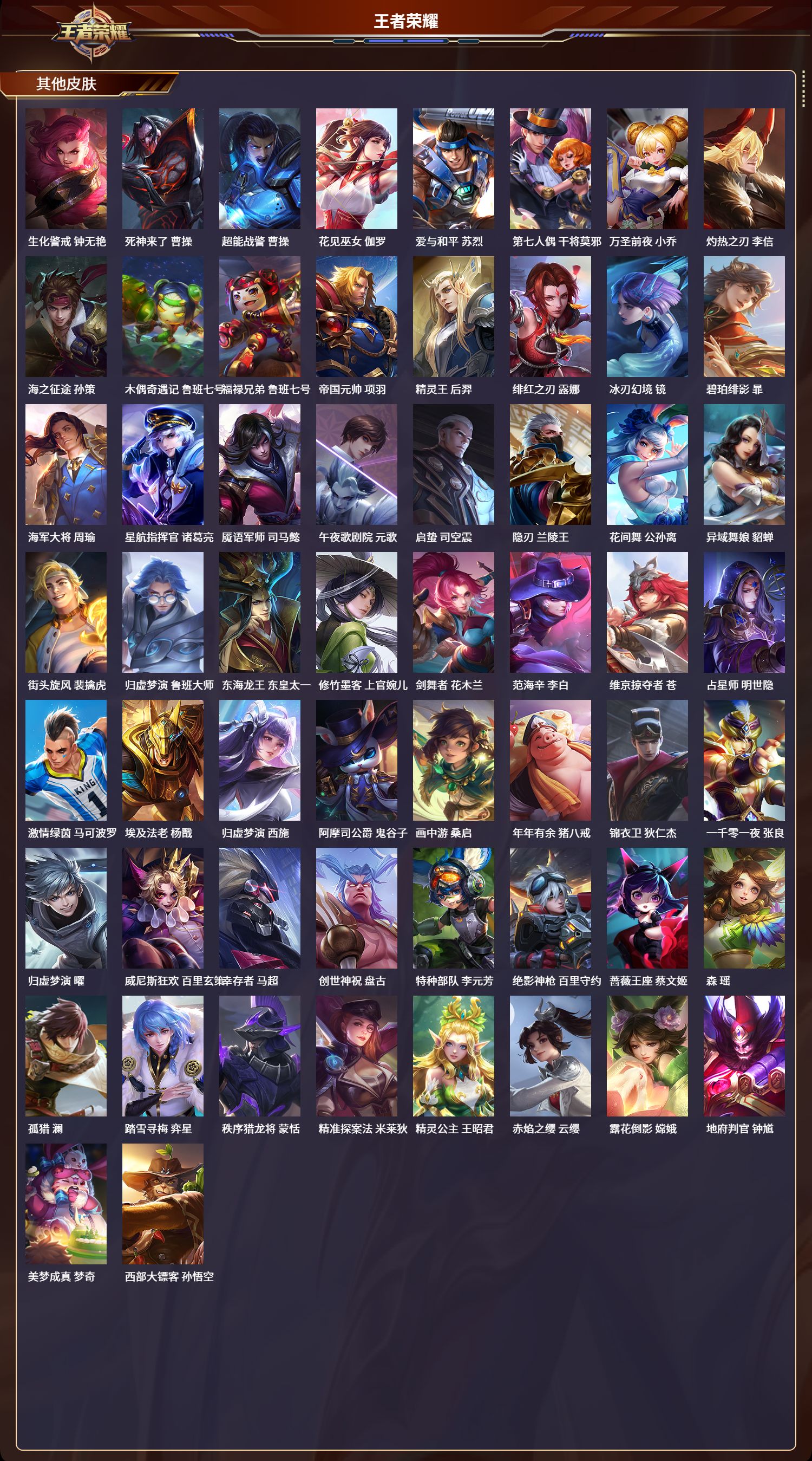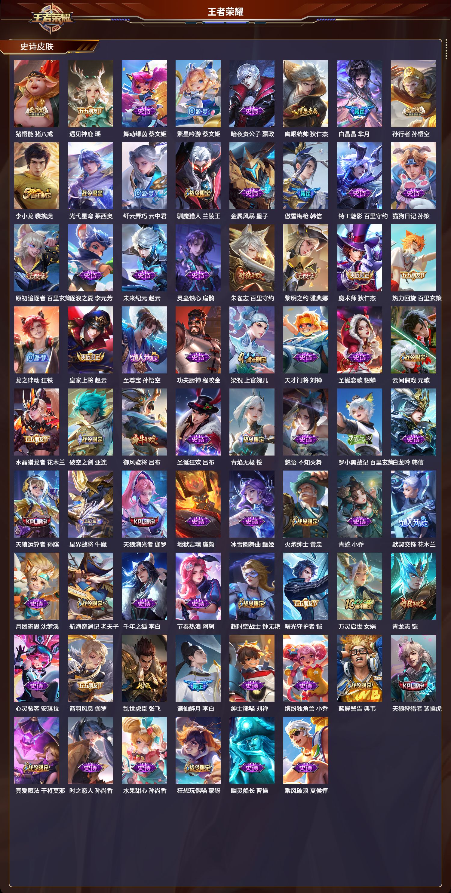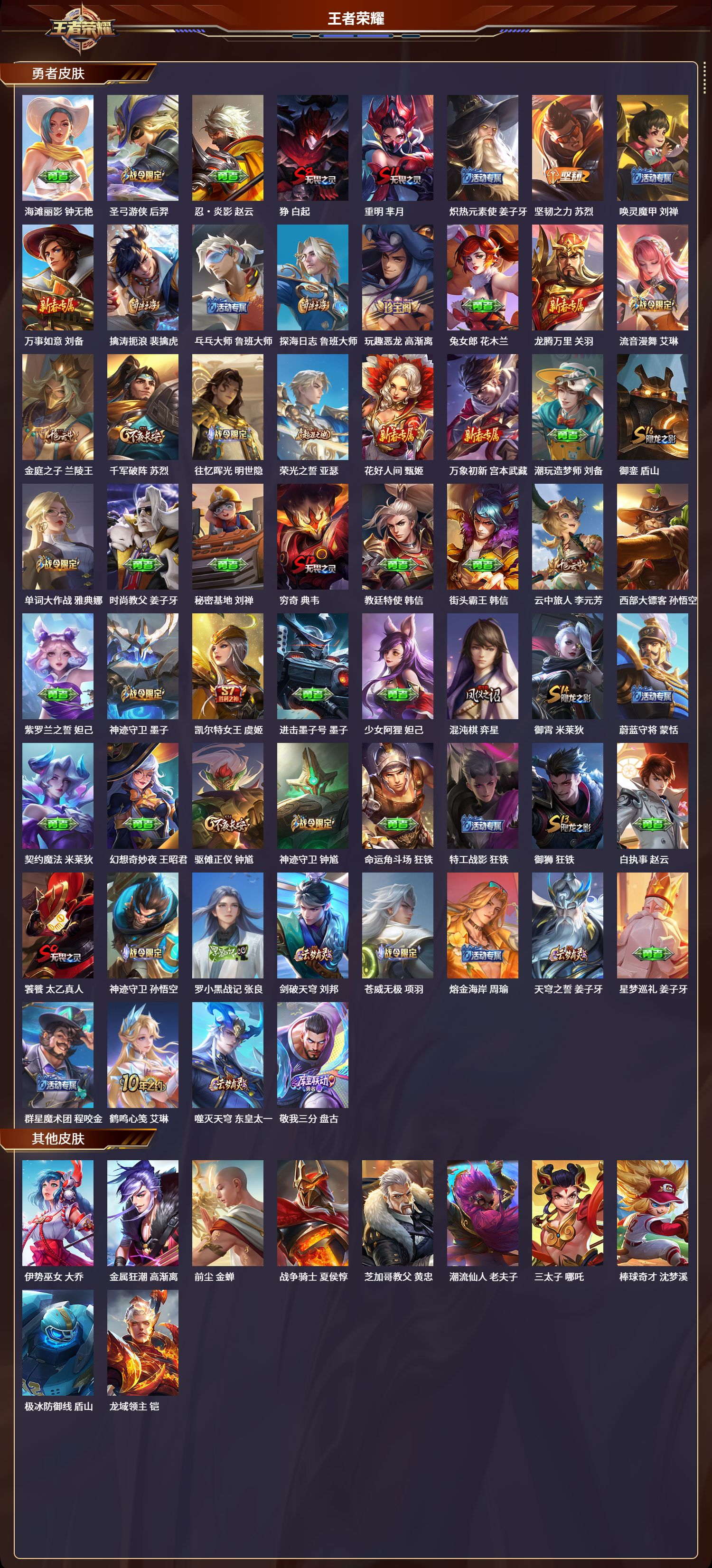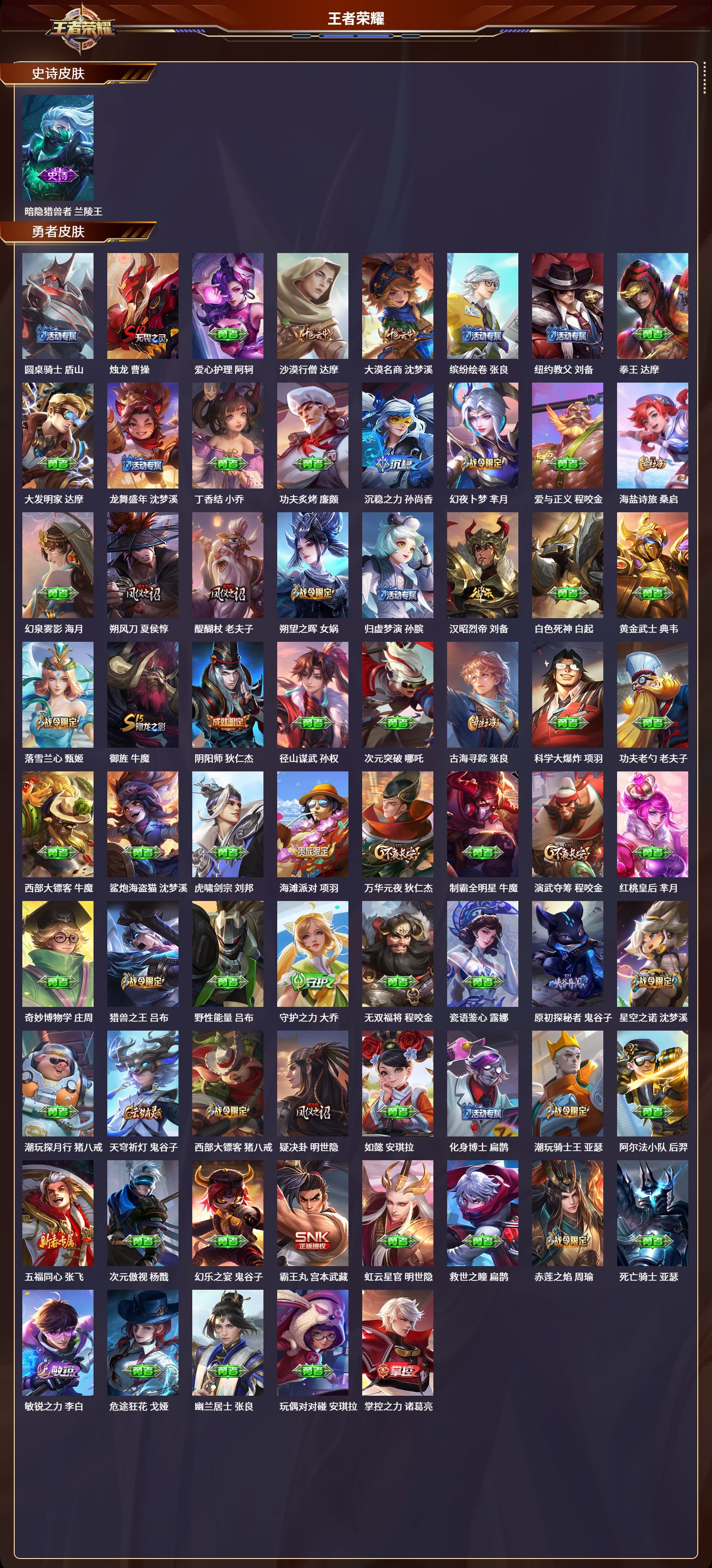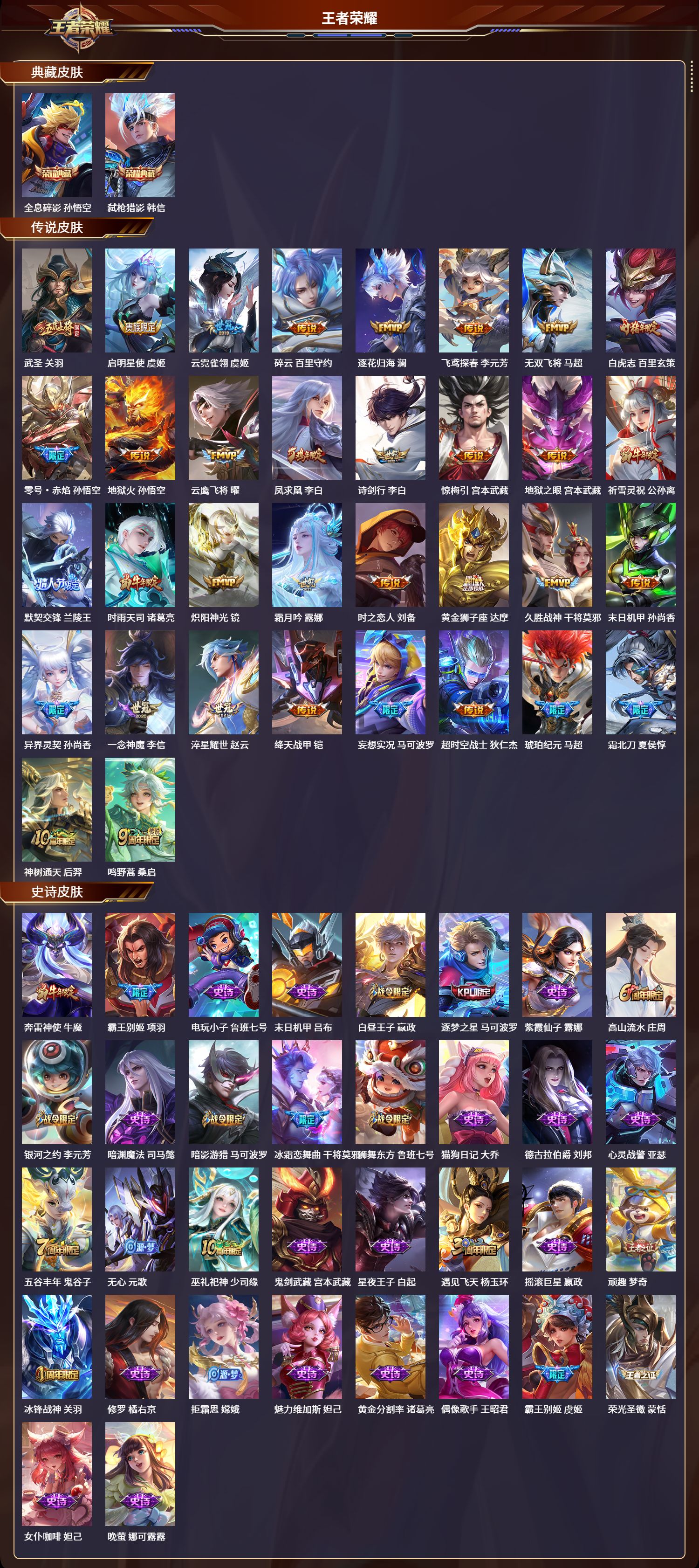 安卓qq/无双王者/339皮肤/125英雄/2典藏/0珍品无双/0无双/0珍品传说/34传说/105史诗/9稀有英雄【2 典藏皮肤】全息碎影 孙悟空弑呛猎影 韩信【34 传说皮肤】武圣 关羽启明星使 虞姬云霓雀翎 虞姬碎云 百里守约逐花归海 澜飞鸢探春 李元芳无双飞将 马超白虎志 百里玄策零号·赤焰 孙悟空地狱火 孙悟空云鹰飞将 曜凤求凰 李白诗剑行 李白惊梅引 宫本