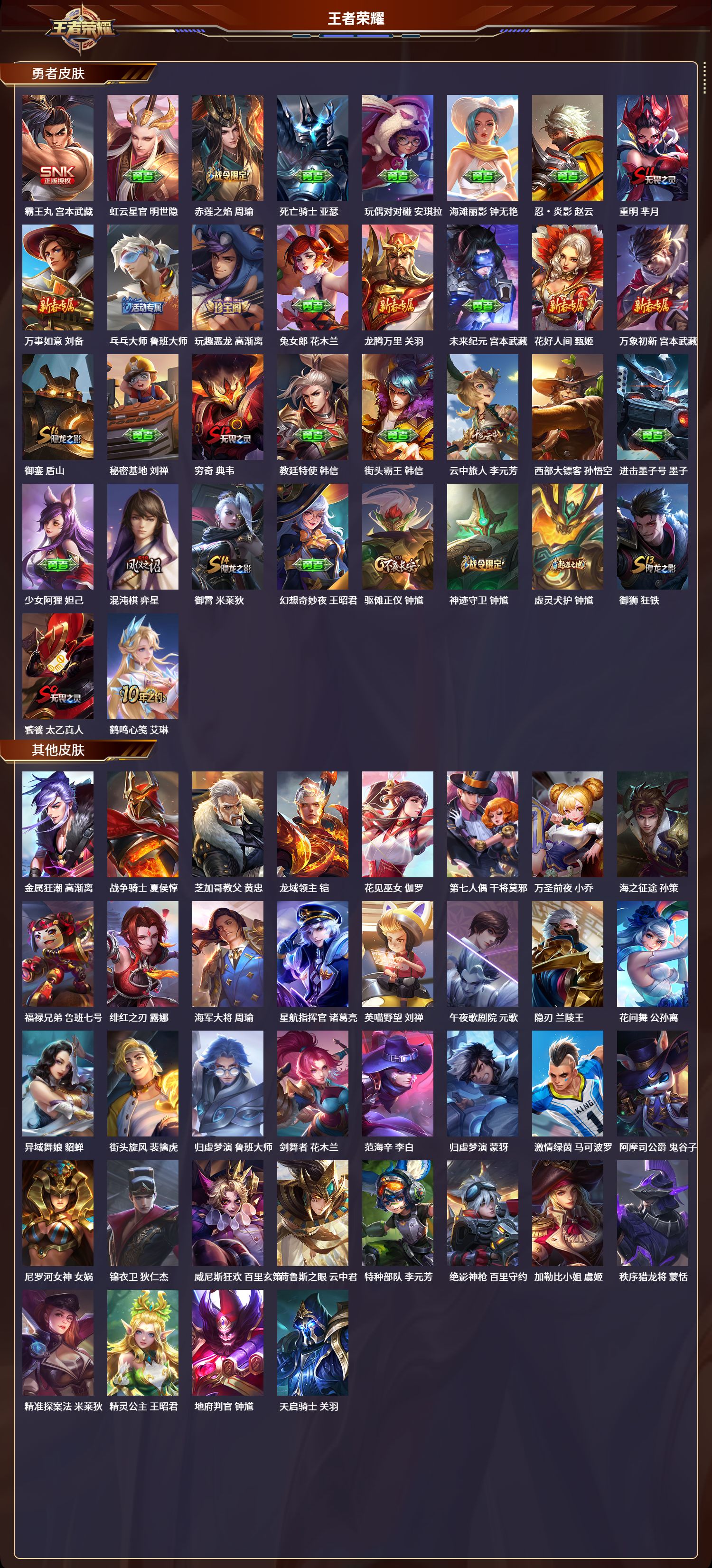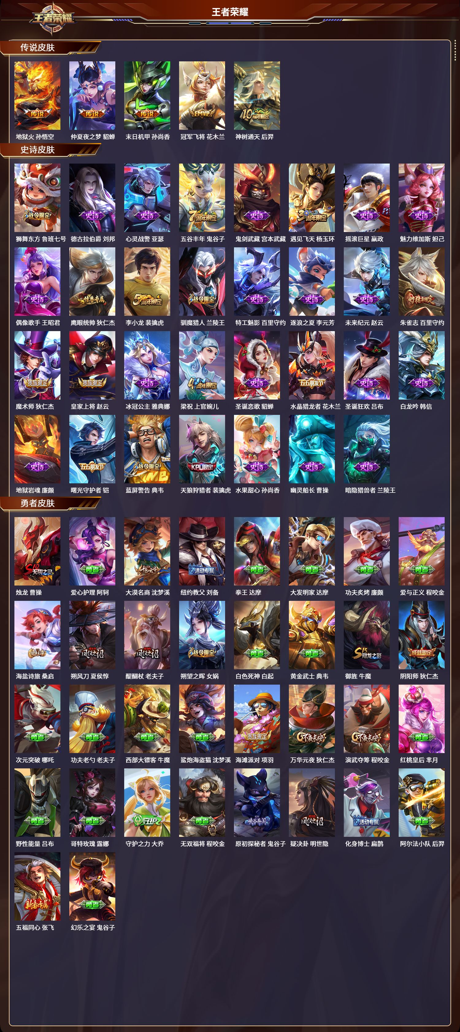 安卓qq/荣耀黄金/140皮肤/124英雄/0典藏/0珍品无双/0无双/0珍品传说/5传说/31史诗/8稀有英雄【5 传说皮肤】地狱火 孙悟空仲夏夜之梦 貂蝉末日机甲 孙尚香冠军飞将 花木兰神树通天 后羿【31 史诗皮肤】狮舞东方 鲁班七号德古拉伯爵 刘邦心灵战警 亚瑟五谷丰年 鬼谷子鬼剑武藏 宫本武藏遇见飞天 杨玉环摇滚巨星 嬴政魅力维加斯 妲己偶像