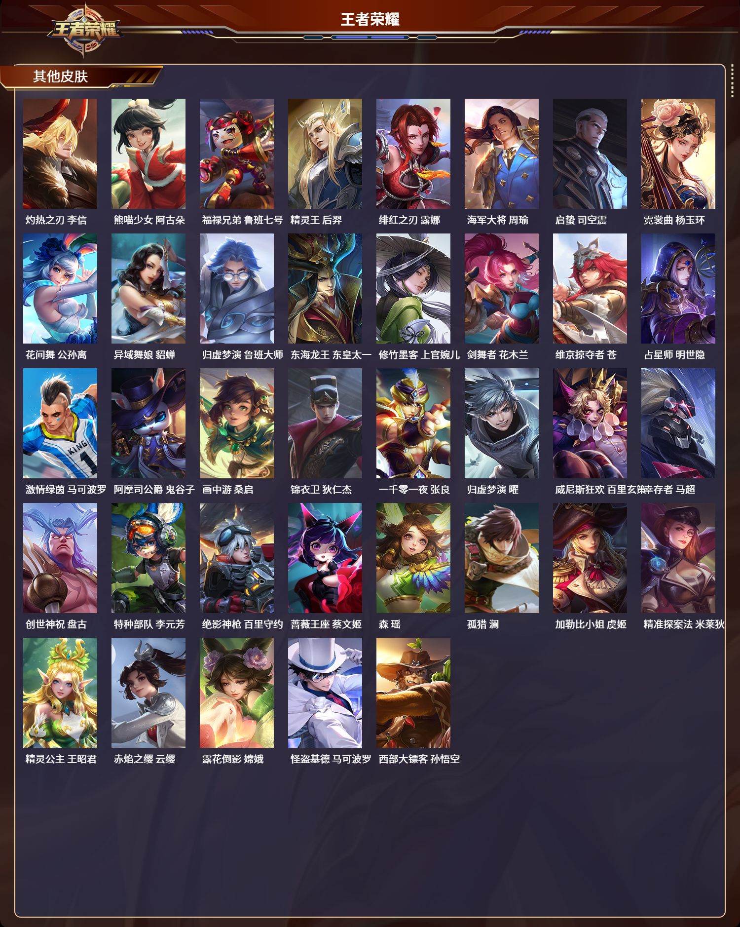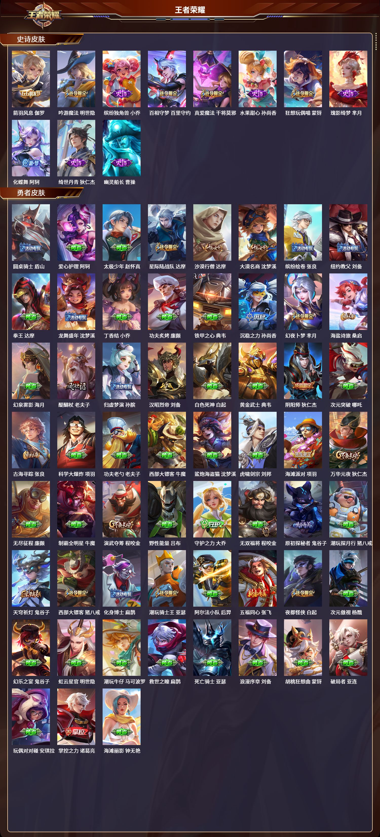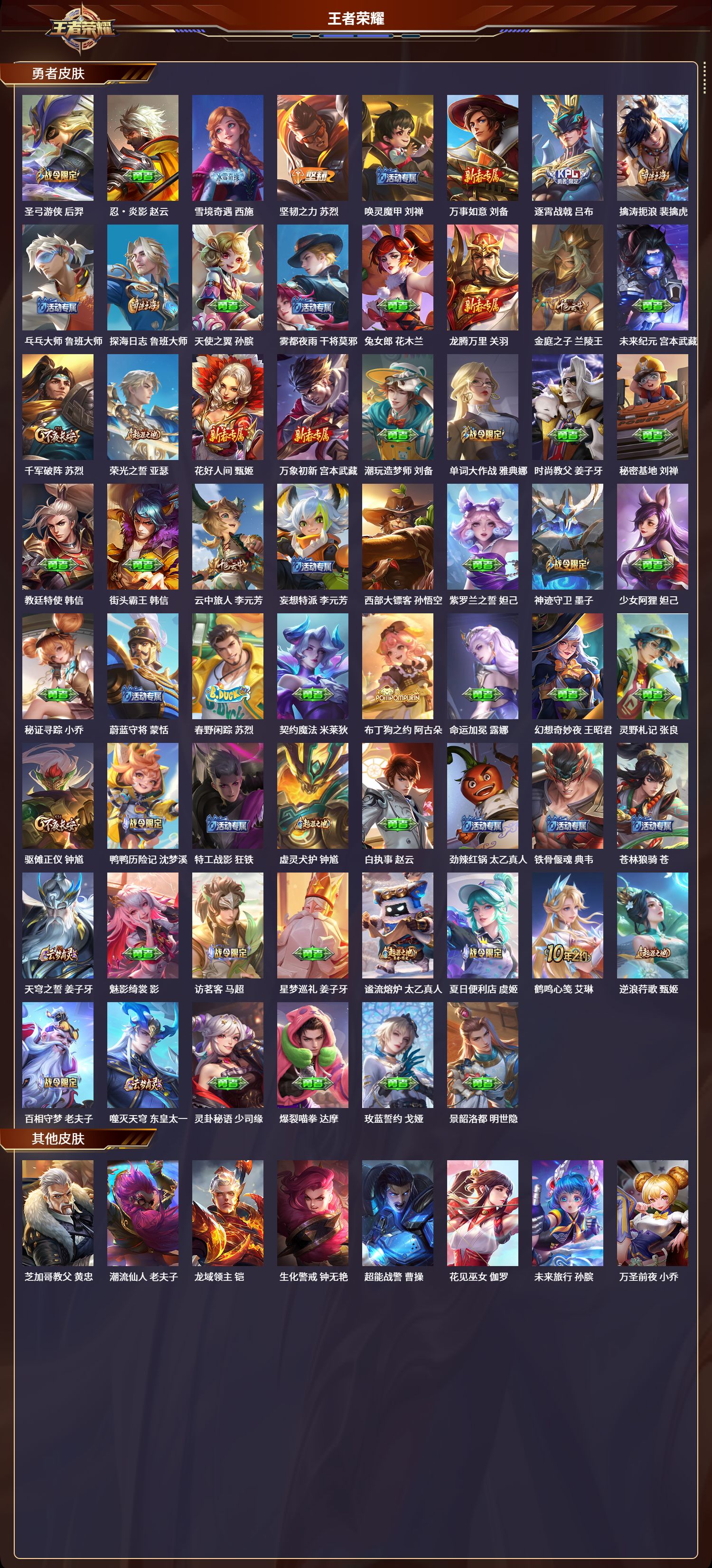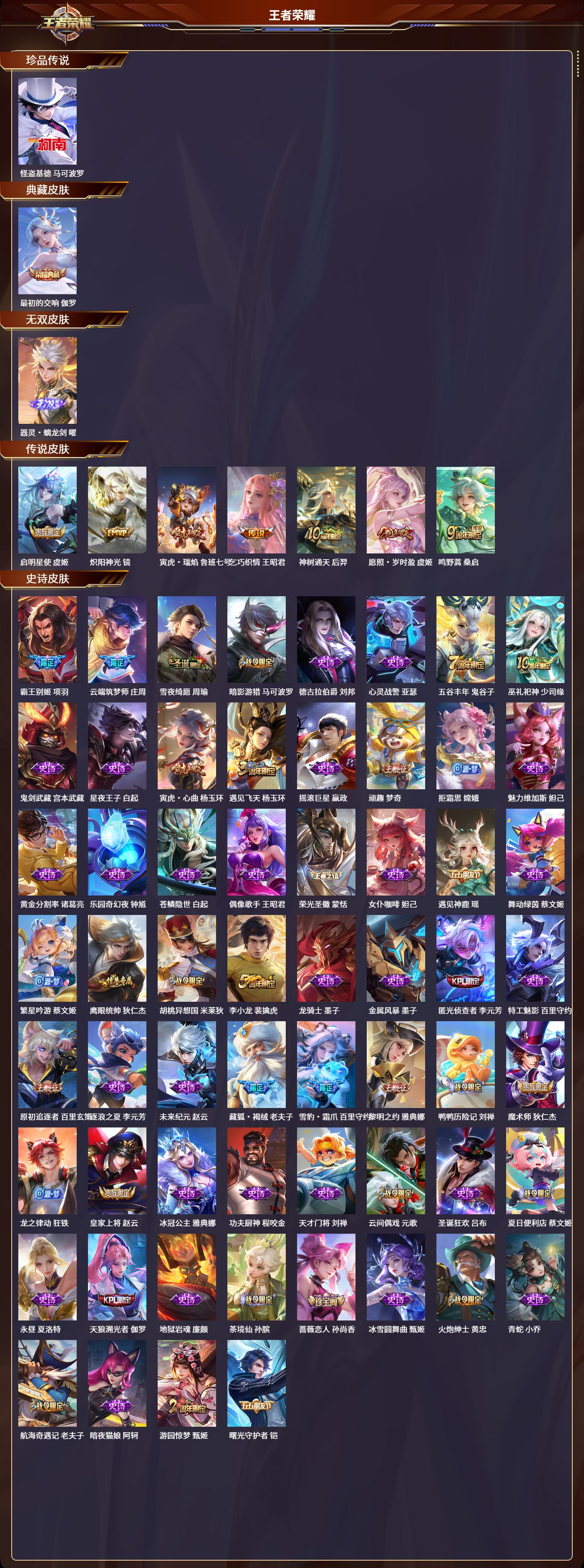 安卓qq/至尊星耀/246皮肤/125英雄/1典藏/0珍品无双/1无双/1珍品传说/7传说/71史诗/9稀有英雄【1 珍品传说】怪盗基德 马可波罗【1 典藏皮肤】最初的交响 伽罗【1 无双皮肤】器灵·螭龙剑 曜【7 传说皮肤】启明星使 虞姬炽阳神光 镜寅虎·瑞焰 鲁班七号乞巧织情 王昭君神树通天 后羿愿照·岁时盈 虞姬鸣野蒿 桑启【71 史诗皮肤】霸王别姬 项羽云端筑梦师 庄