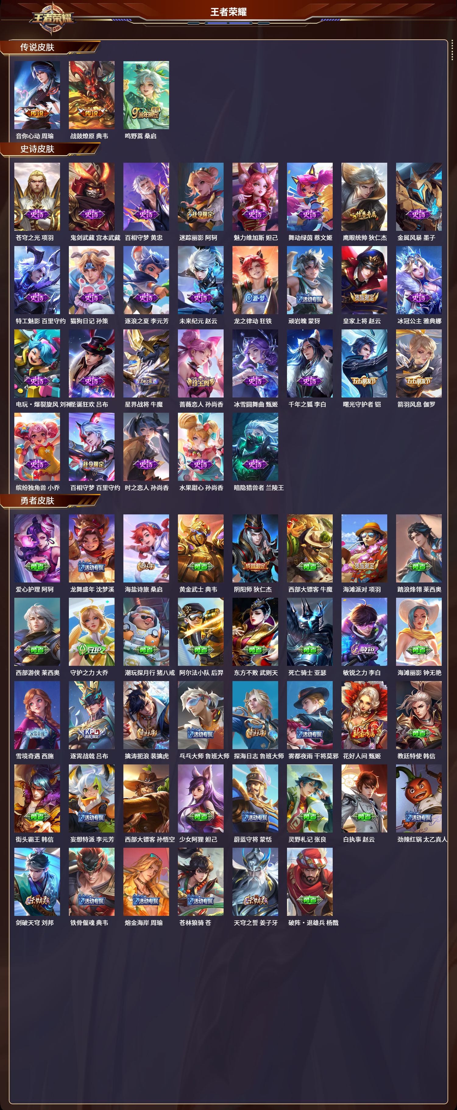苹果qq/永恒钻石/91皮肤/116英雄/0典藏/0珍品无双/0无双/0珍品传说/3传说/29史诗/6稀有英雄【3 传说皮肤】音你心动 周瑜战鼓燎原 典韦鸣野蒿 桑启【29 史诗皮肤】苍穹之光 项羽鬼剑武藏 宫本武藏百相守梦 黄忠迷踪丽影 阿轲魅力维加斯 妲己舞动绿茵 蔡文姬鹰眼统帅 狄仁杰金属风暴 墨子特工魅影 百里守约猫狗日记 孙策逐浪之夏 李元芳