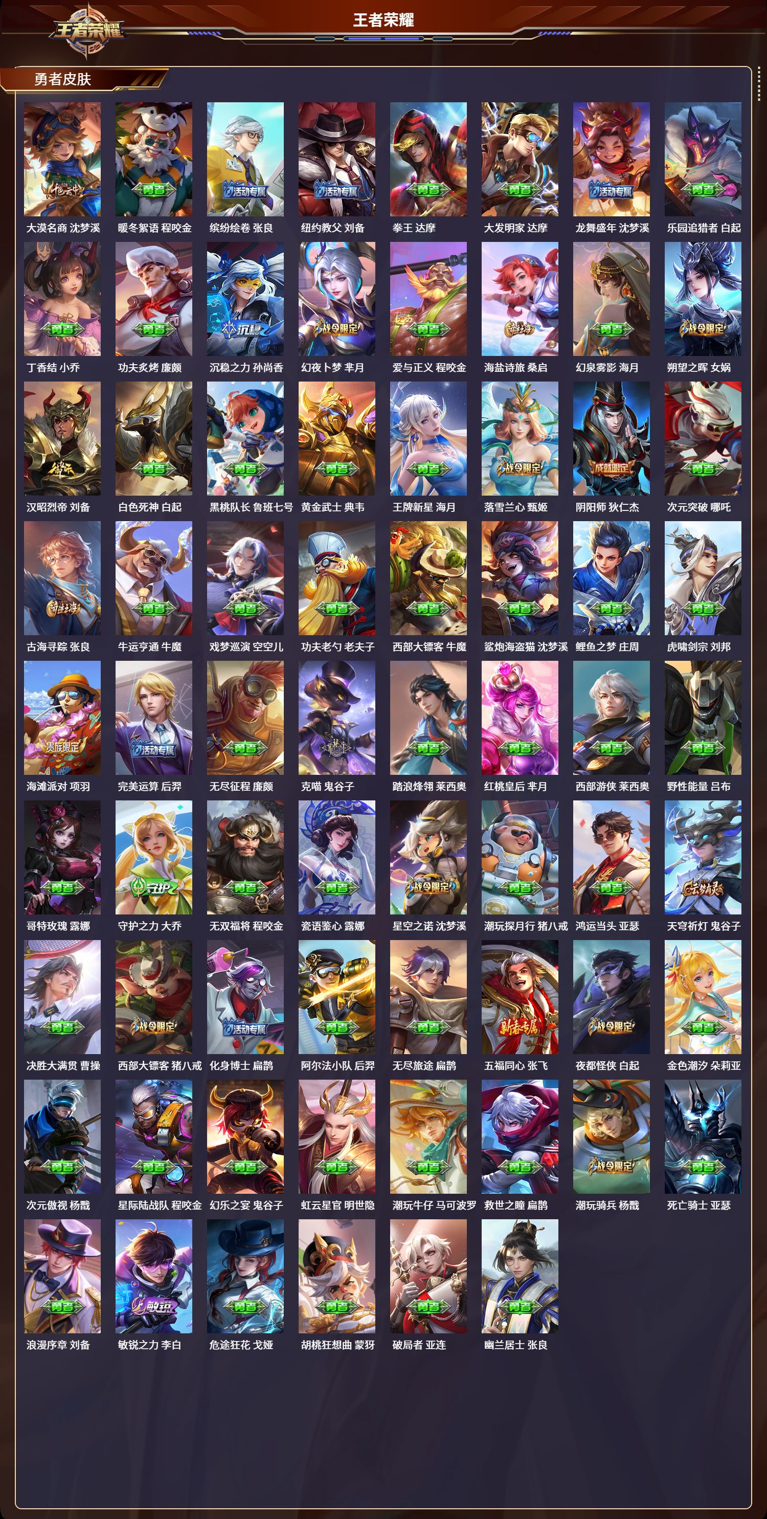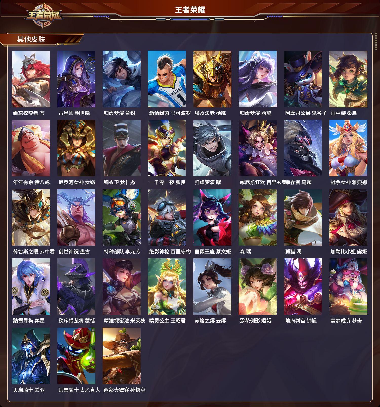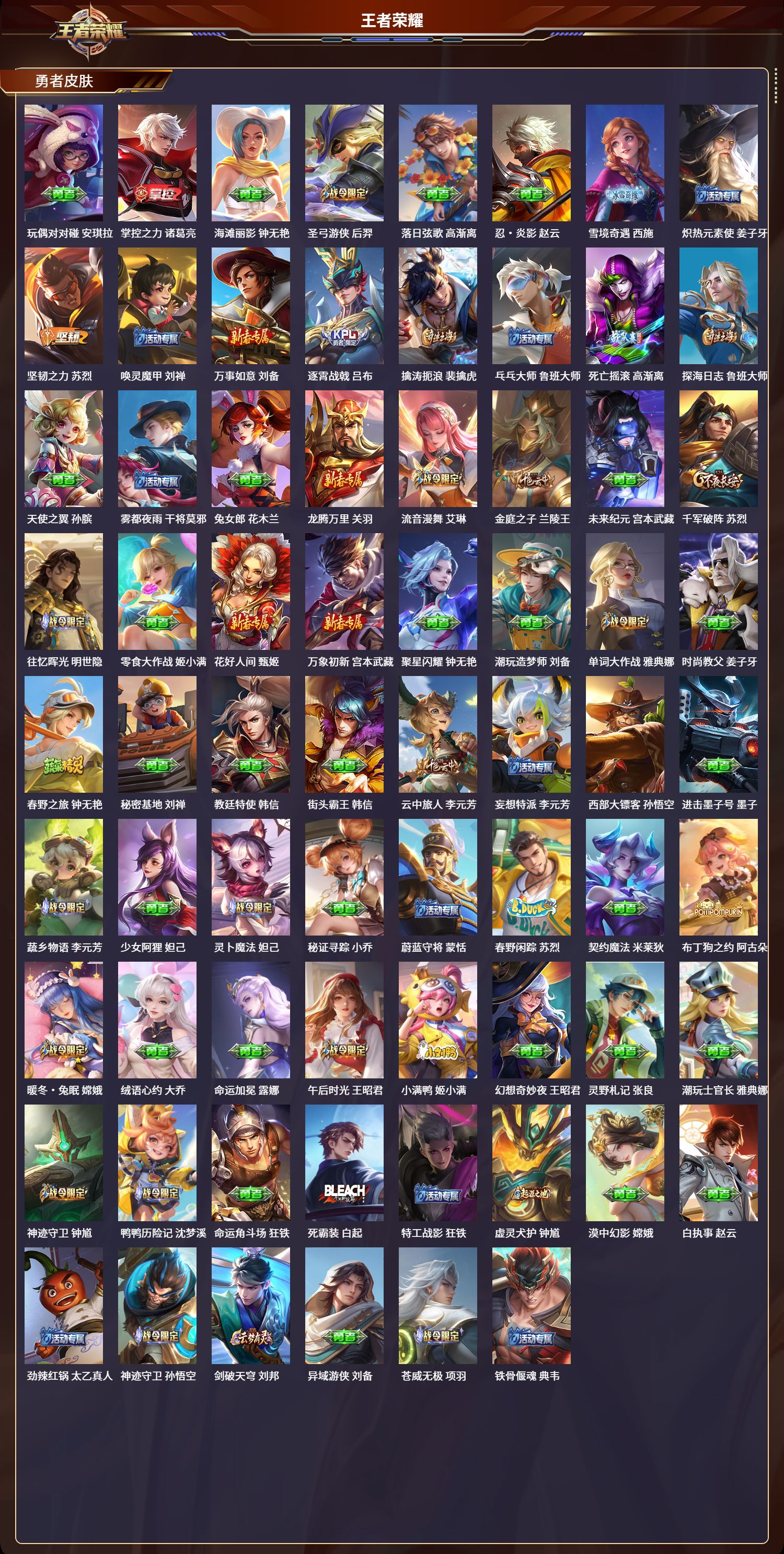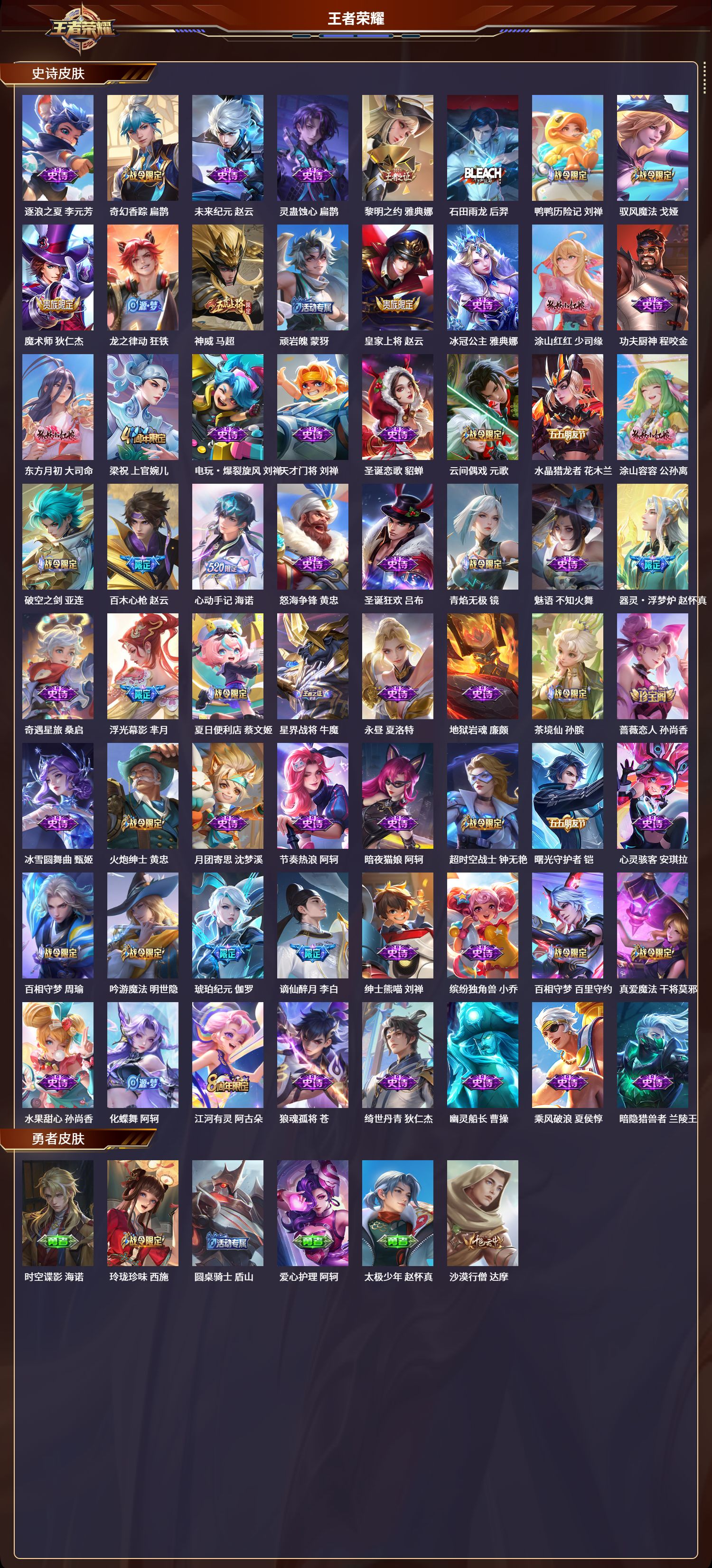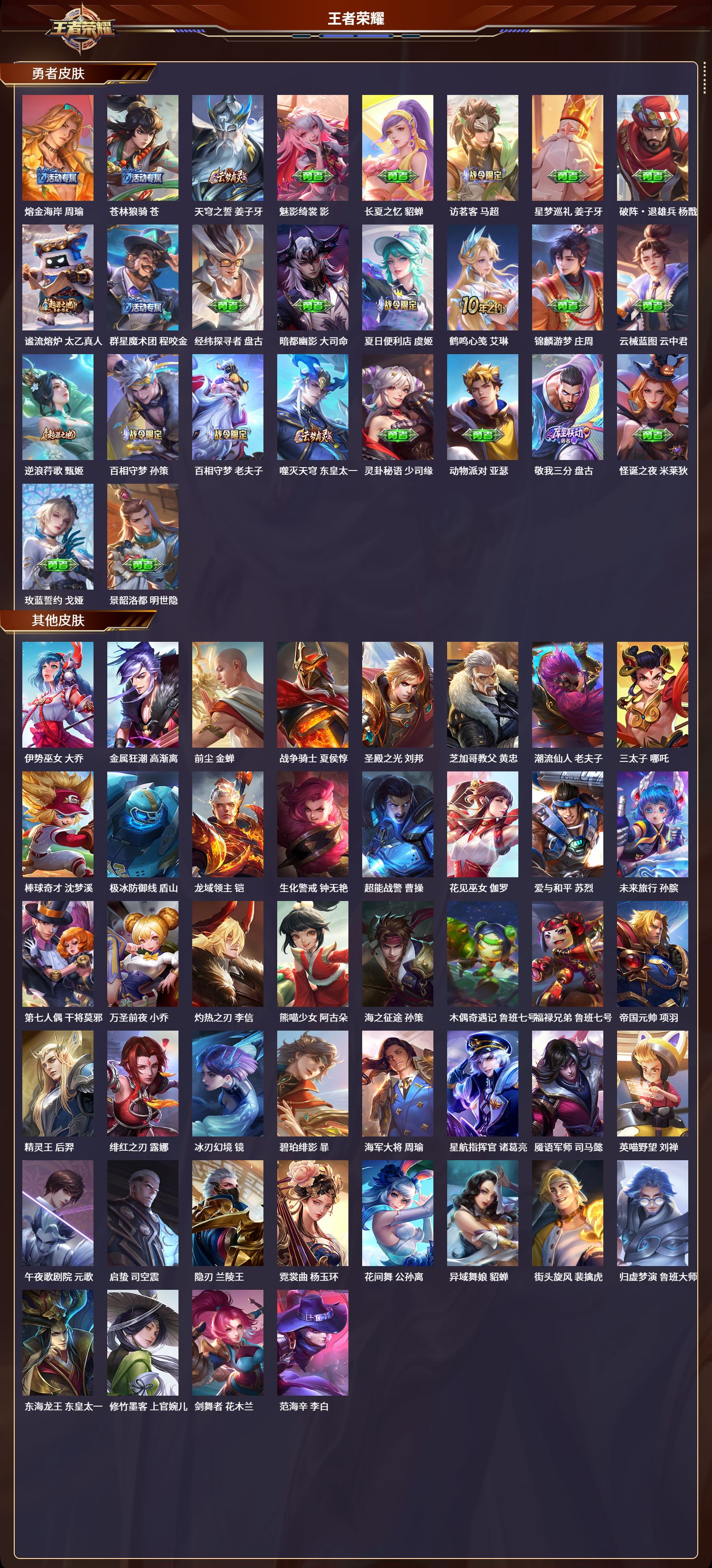 安卓qq/无双王者/385皮肤/125英雄/4典藏/0珍品无双/0无双/0珍品传说/18传说/112史诗/9稀有英雄【4 典藏皮肤】鸣剑·曳影 李白无限飓风号 夏侯惇拾光映像 瑶最初的交响 伽罗【18 传说皮肤】启明星使 虞姬花朝如约 蔡文姬无双飞将 马超白虎志 百里玄策李 曜云鹰飞将 曜游龙清影 西施仲夏夜之梦 貂蝉惊梅引 宫本武藏地狱之眼 宫本武藏武陵仙君 诸