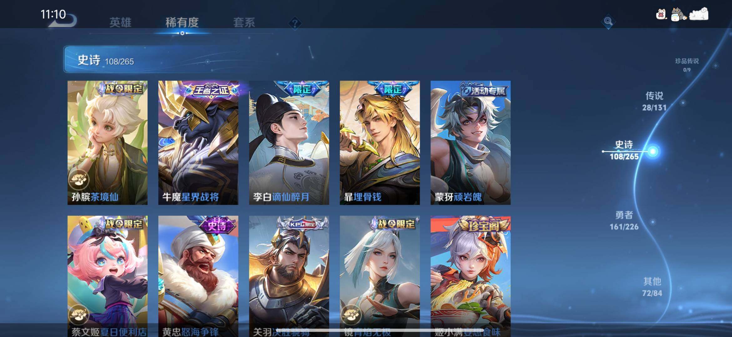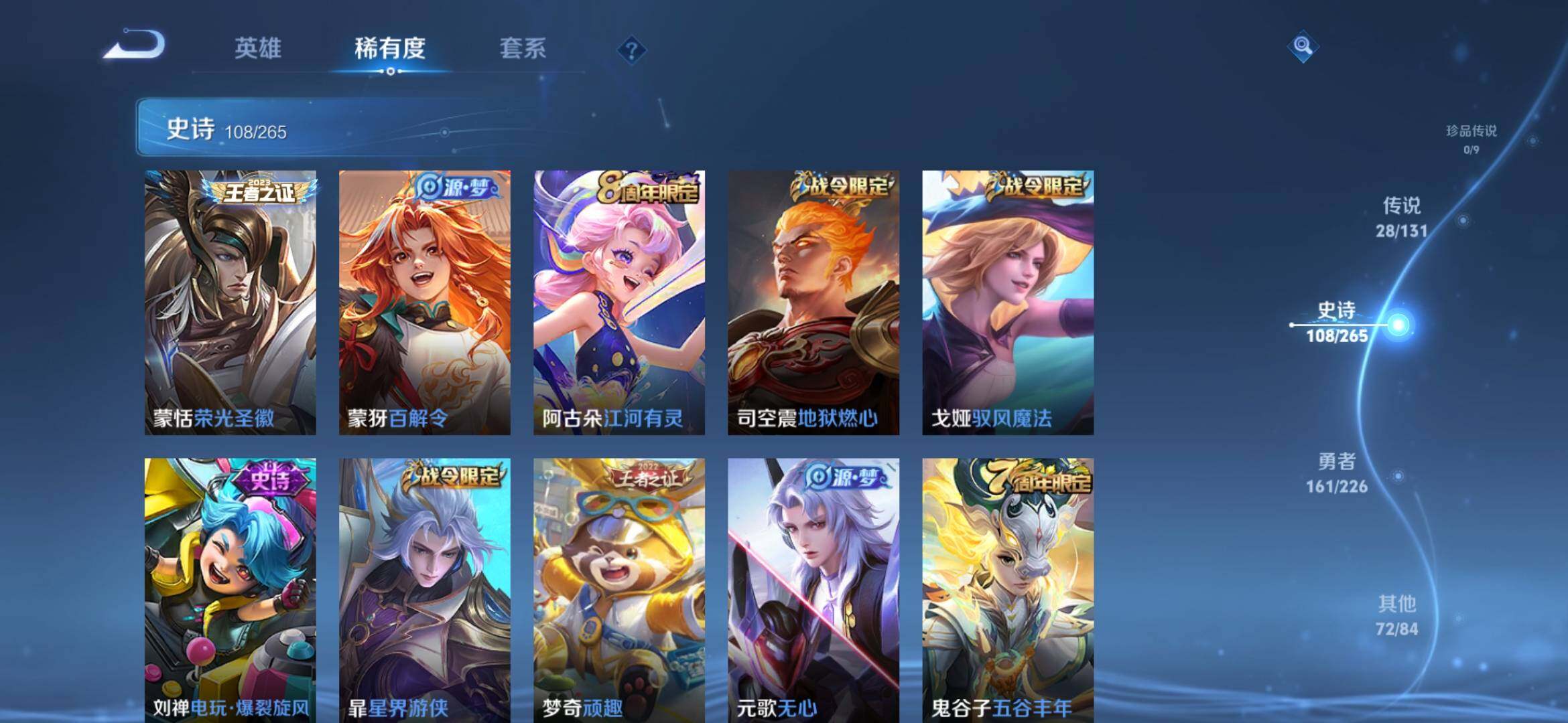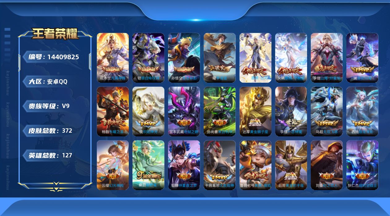 [14409825]安卓q-v9-最强王者段位-127英雄-372皮肤-3典藏皮肤-28传说-108史诗 【英雄全皮】:刘禅全皮,达摩全皮,刘邦全皮,鬼谷子全皮,黄忠全皮,李信全皮,蒙恬全皮,司空震全皮,戈娅全皮,影全皮 【荣耀典藏】:孙悟空全息碎影,花木兰九霄神辉,铠银白咏叹调 【传说皮肤】:后羿神树通天,司空震愿照山河定,女娲愿照千秋盛,云缨幻光神呛,桑启鸣野蒿,澜逐花归海,李信山海炽霜斩,马超无双飞将,鲁班七号寅虎瑞焰,西施游龙清影,曜李 ,李元芳飞鸢探春,铠绛天战甲,镜炽阳神光,虞姬启明星使,李信一念神魔,刘备时之恋人,干将莫邪久胜战神,达摩黄金狮子座,花木兰冠军飞将,梦奇胖达荣荣,后羿黄金射手座,杨戬永曜之星,貂蝉仲夏夜之梦,孙尚香末日机甲,宫本武藏地狱之眼,孙悟空地狱火,狄仁杰超时空战士 【限定皮肤】:暃埋骨钱,蒙犽顽岩魄,蔡文姬夏日便利店,大乔绒语心约,虞姬夏日便利店,姜子牙天穹之誓,杨戬破阵退雄兵,李白谪仙醉月,狄仁杰阴阳师,赵云皇家上将,赵云引擎之心,墨子神迹守卫,鲁班七号寅虎瑞焰,高渐离死亡摇滚,高渐离玩趣恶龙,阿轲迷踪丽影,钟无艳超时空战士,芈月幻夜卜梦,吕布猎兽之王,元歌云间偶戏,元歌无心,甄姬落雪兰心,马可波罗逐梦之星,马可波罗暗影游猎,狄仁杰魔术师,狄仁杰万华元夜,达摩星际陆战队,达摩沙漠行僧,项羽海滩派对,老夫子醍醐杖,老夫子航海奇遇记,关羽冰锋战神,程咬金演武夺筹,刘邦夺宝奇兵,韩信逐梦之影,韩信飞衡,韩信傲雪梅呛,亚瑟潮玩骑士王,牛魔奔雷神使,李元芳银河之约,李元芳云中旅人,虞姬启明星使,钟馗驱傩正仪,杨玉环寅虎心曲,杨戬永曜之星,雅典娜单词大作战,雅典娜黎明之约,太乙真人华丽摇滚,鬼谷子原初探秘者,鬼谷子五谷丰年,黄忠烈魂,黄忠火炮绅士,苏烈千军破阵,百里玄策原初追逐者,弈星混沌棋,梦奇顽趣,公孙离玉兔公主,沈梦溪星空之诺,沈梦溪大漠名商,明世隐疑决卦,裴擒虎李小龙,裴擒虎擒涛扼浪,米莱狄胡桃异想国,李信山海炽霜斩,伽罗天狼溯光者,盾山御銮,猪八戒西部大镖客,上官婉儿梁祝,嫦娥拒霜思,嫦娥暖冬兔眠,曜李 ,西施玲珑珍味,蒙犽狂想玩偶喵,鲁班大师探海日志,桑启海盐诗旅,暃星界游侠,戈娅驭风魔法,艾琳女武神,艾琳流音漫舞,司空震地狱燃心,阿古朵江河有灵,张良古海寻踪,蒙犽百解令,蒙恬荣光圣徽,鬼谷子天穹祈灯,姬小满妄想食味,沈梦溪龙舞盛年,刘邦