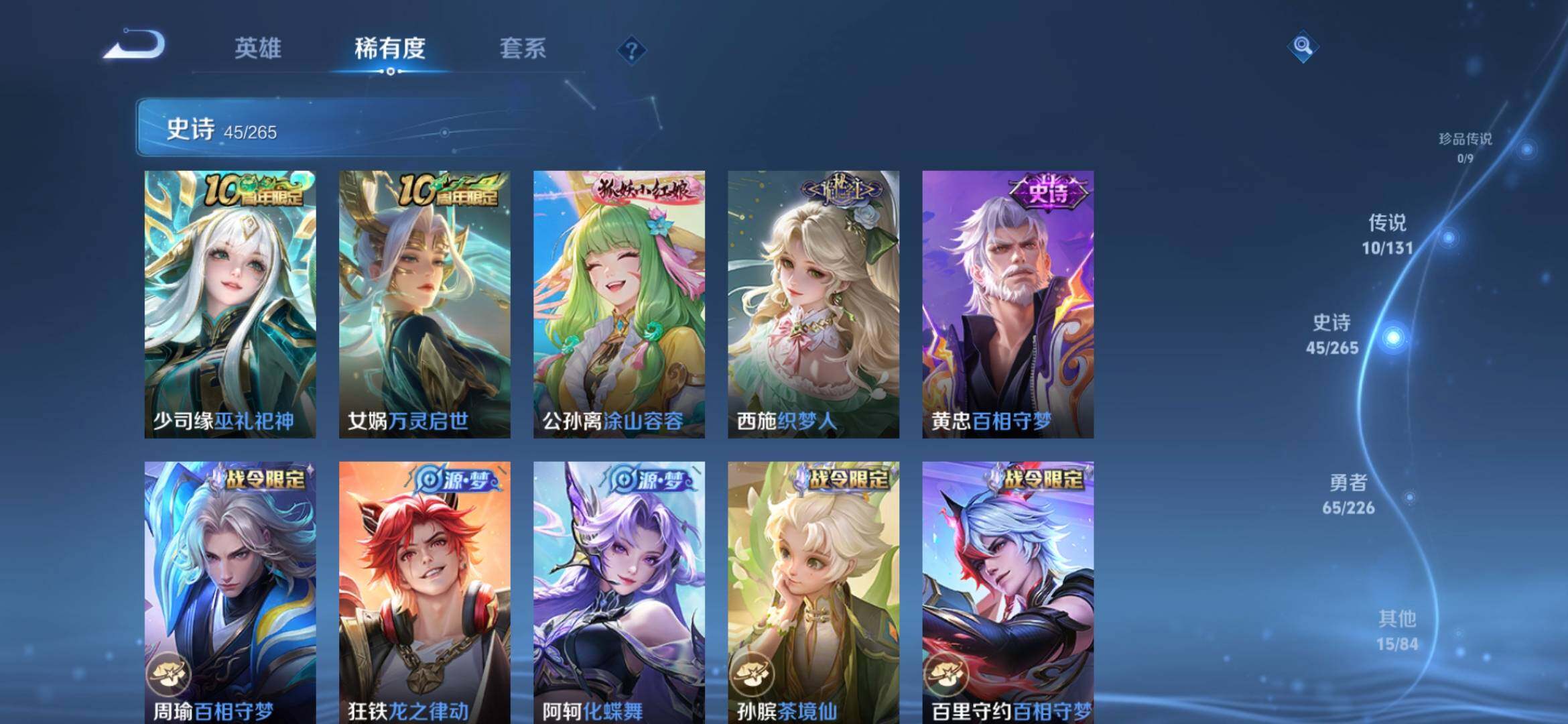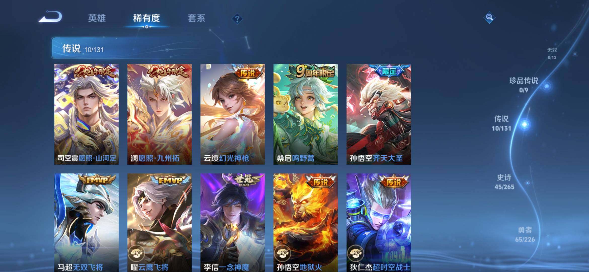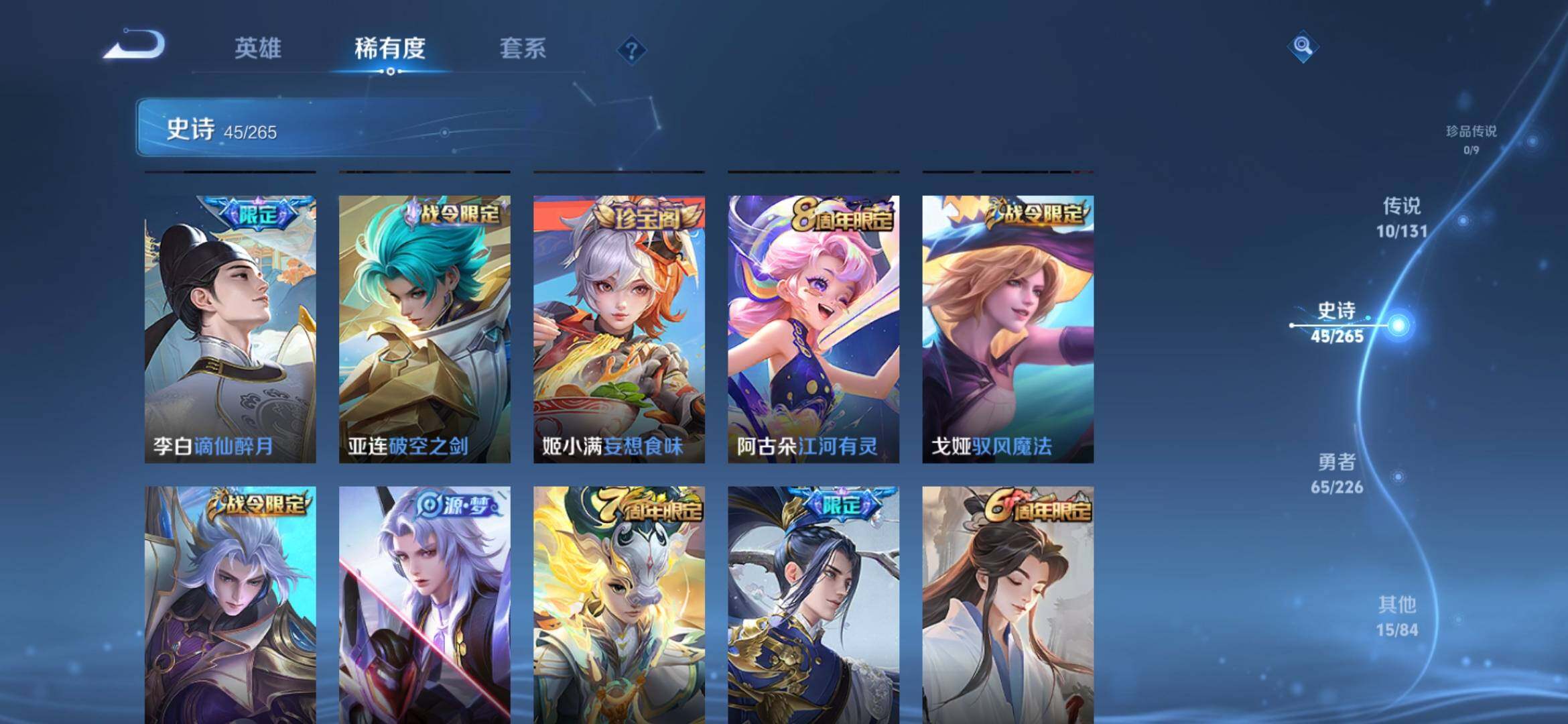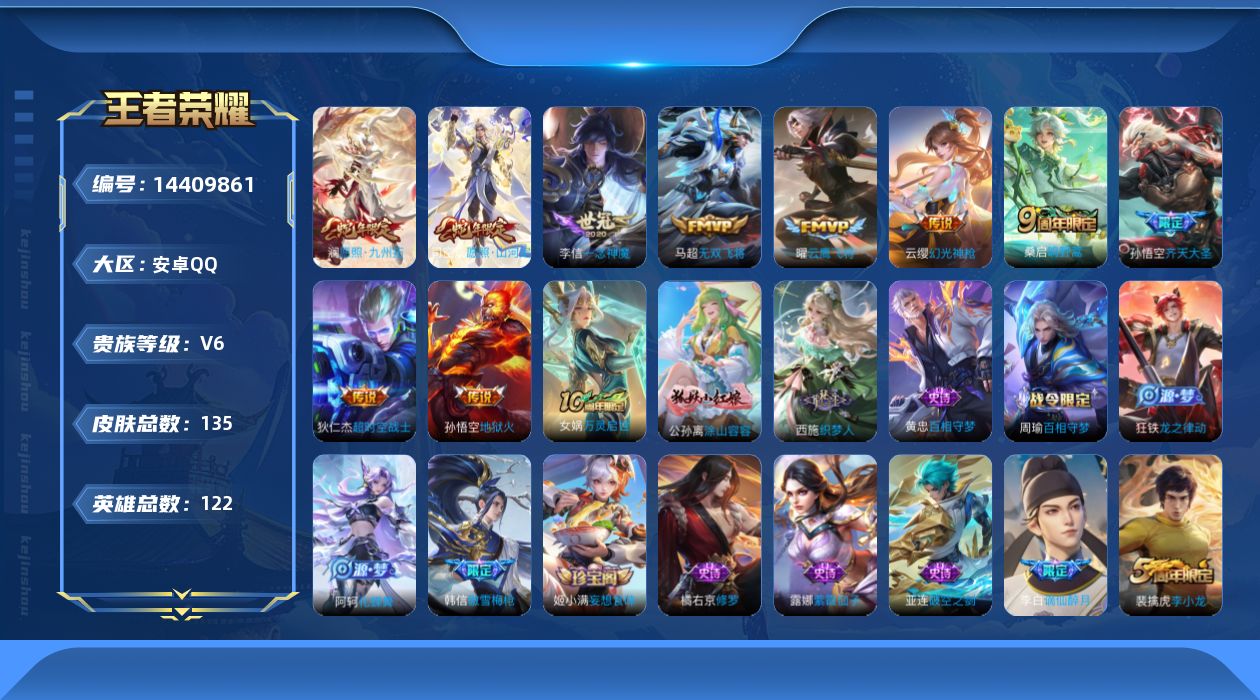 [14409861]安卓q-v6-至尊星耀ii段位-122英雄-135皮肤-10传说-45史诗 【传说皮肤】:司空震愿照山河定,澜愿照九州拓,云缨幻光神呛,桑启鸣野蒿,孙悟空齐天大圣,马超无双飞将,曜云鹰飞将,李信一念神魔,孙悟空地狱火,狄仁杰超时空战士 【限定皮肤】:姜子牙天穹之誓,李白谪仙醉月,狄仁杰阴阳师,赵云皇家上将,庄周高山流水,元歌无心,狄仁杰魔术师,项羽海滩派对,韩信傲雪梅呛,兰陵王金庭之子,孙悟空齐天大圣,李元芳银河之约,李元芳云中旅人,鬼谷子五谷丰年,沈梦溪大漠名商,裴擒虎李小龙,裴擒虎擒涛扼浪,鲁班大师探海日志,桑启海盐诗旅,暃星界游侠,戈娅驭风魔法,阿古朵江河有灵,张良古海寻踪,鬼谷子天穹祈灯,姬小满妄想食味,沈梦溪龙舞盛年,周瑜熔金海岸 【赛季限定】:兰陵王金庭之子,张良古海寻踪,李元芳云中旅人,沈梦溪大漠名商,裴擒虎擒涛扼浪,鲁班大师探海日志,桑启海盐诗旅,鬼谷子天穹祈灯,姜子牙天穹之誓 【战令限定】:李元芳银河之约,暃星界游侠,戈娅驭风魔法 【史诗皮肤】:露娜紫霞仙子,赵云皇家上将,貂蝉圣诞恋歌,狄仁杰魔术师,宫本武藏鬼剑武藏,孙尚香水果甜心,嬴政摇滚巨星,妲己女仆咖啡,墨子金属风暴,曹操幽灵船长,李白千年之狐,张飞乱世虎臣,花木兰水晶猎龙者,夏侯惇乘风破浪,安琪拉心灵骇客,铠曙光守护者,程咬金功夫厨神,白起星夜王子,阿轲节奏热浪,孙策猫狗日记,伽罗箭羽风息,狄仁杰鹰眼统帅,李元芳银河之约,橘右京修罗,裴擒虎李小龙,庄周高山流水,韩信傲雪梅呛,鬼谷子五谷丰年,元歌无心,暃星界游侠,戈娅驭风魔法,阿古朵江河有灵,姬小满妄想食味,亚连破空之剑,李白谪仙醉月,百里守约百相守梦,孙膑茶境仙,阿轲化蝶舞,狂铁龙之律动,周瑜百相守梦,黄忠百相守梦,西施织梦人,公孙离涂山容容,女娲万灵启世,少司缘巫礼祀神 【其他皮肤】:项羽海滩派对,韩信教廷特使,韩信街头霸王,露娜哥特玫瑰,达摩大发明家,赵云白执事,赵云忍炎影,宫本武藏未来纪元,妲己少女阿狸,亚瑟死亡骑士,花木兰兔女郎,甄姬花好人间,狄仁杰阴阳师,刘备汉昭烈帝,关羽龙腾万里,墨子进击墨子号,王昭君幻想奇妙夜,老夫子功夫老勺,大乔守护之力,明世隐虹云星官,小乔丁香结,哪吒次元突破,刘禅秘密基地,杨戬次元傲视,马可波罗潮玩牛仔,兰陵王金庭之子,米莱狄契约魔法,沈梦溪大漠名商,李元芳云中旅人,桑启海盐诗旅,海月幻泉雾影,牛魔