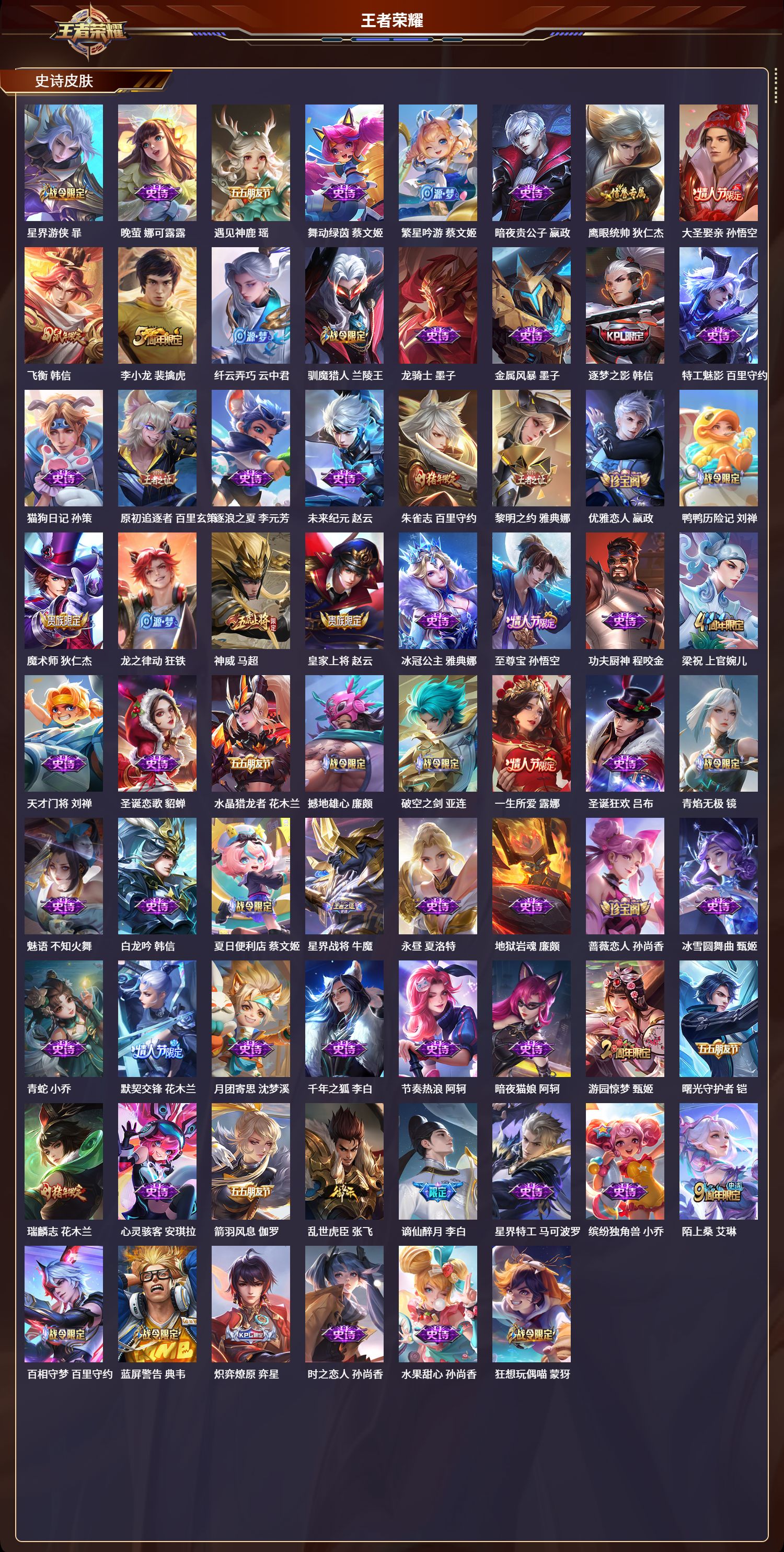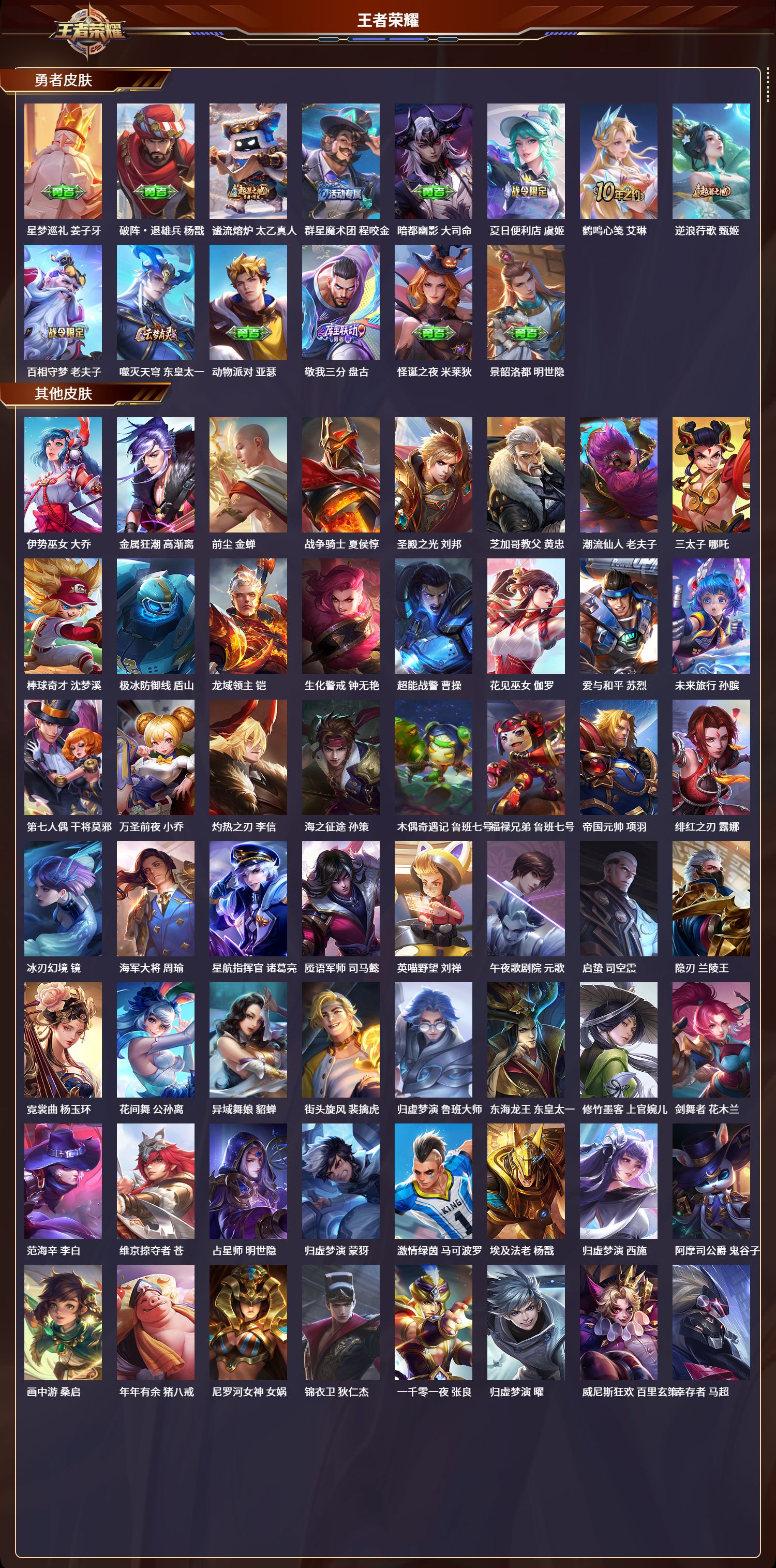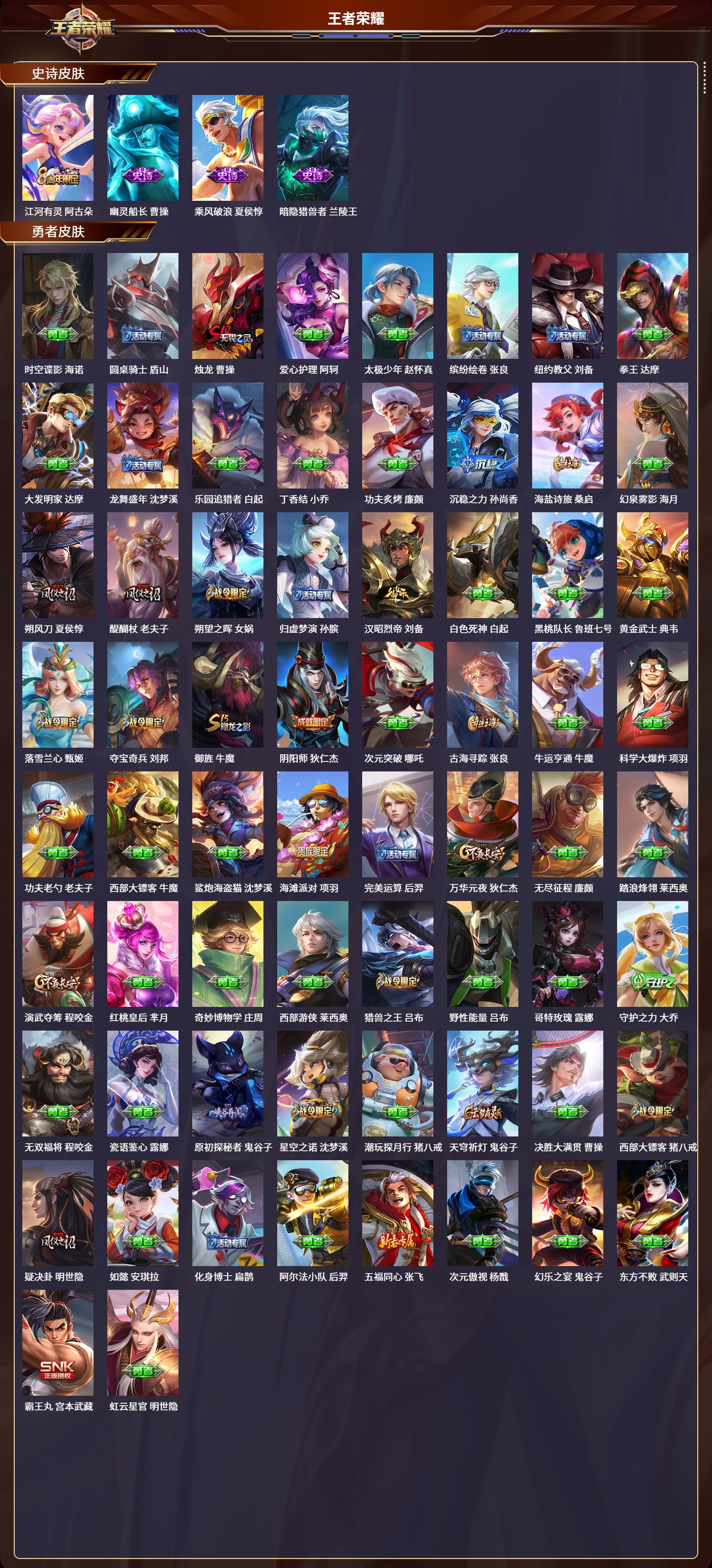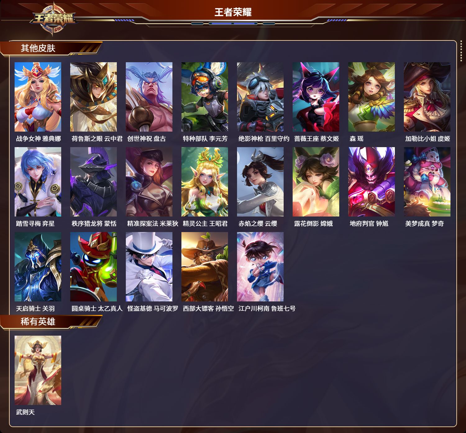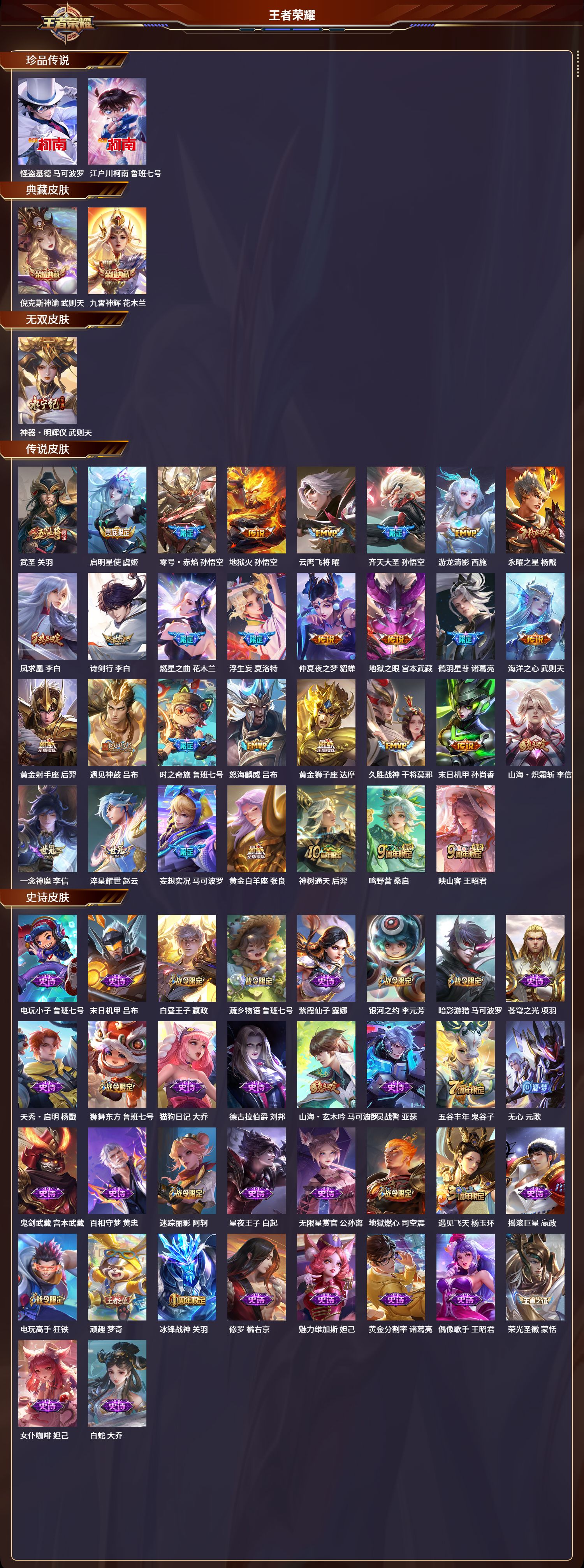 苹果qq/至尊星耀/369皮肤/126英雄/2典藏/0珍品无双/1无双/2珍品传说/31传说/108史诗/10稀有英雄【2 珍品传说】怪盗基德 马可波罗江户川柯南 鲁班七号【2 典藏皮肤】倪克斯神谕 武则天九霄神辉 花木兰【1 无双皮肤】神器·明辉仪 武则天【31 传说皮肤】武圣 关羽启明星使 虞姬零号·赤焰 孙悟空地狱火 孙悟空云鹰飞将 曜齐天大圣 孙悟空