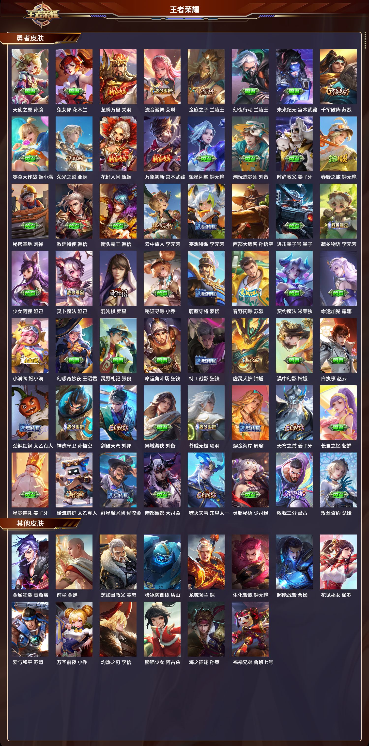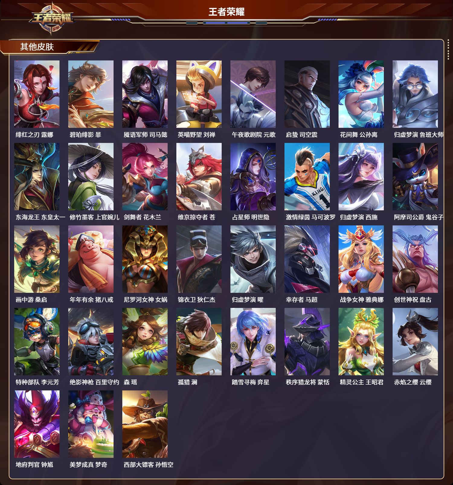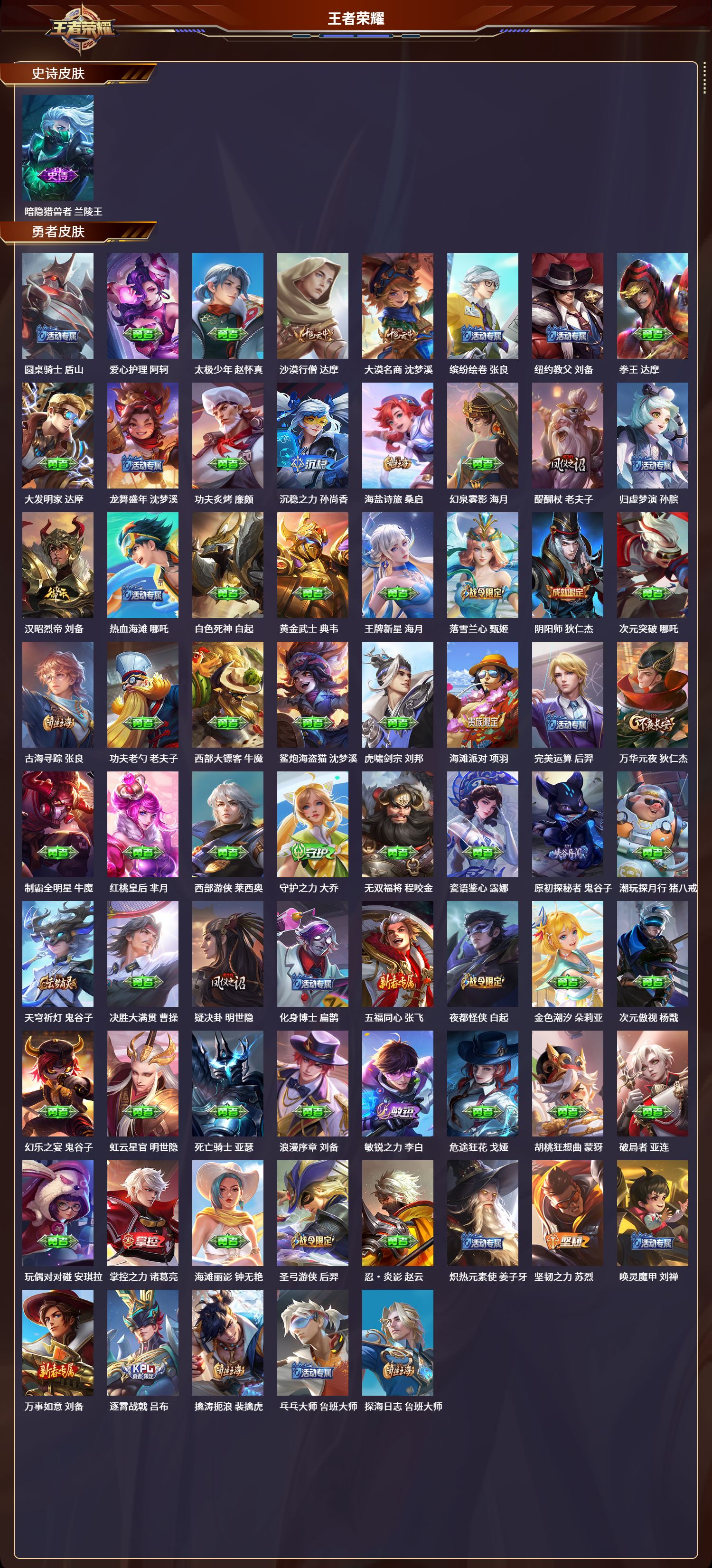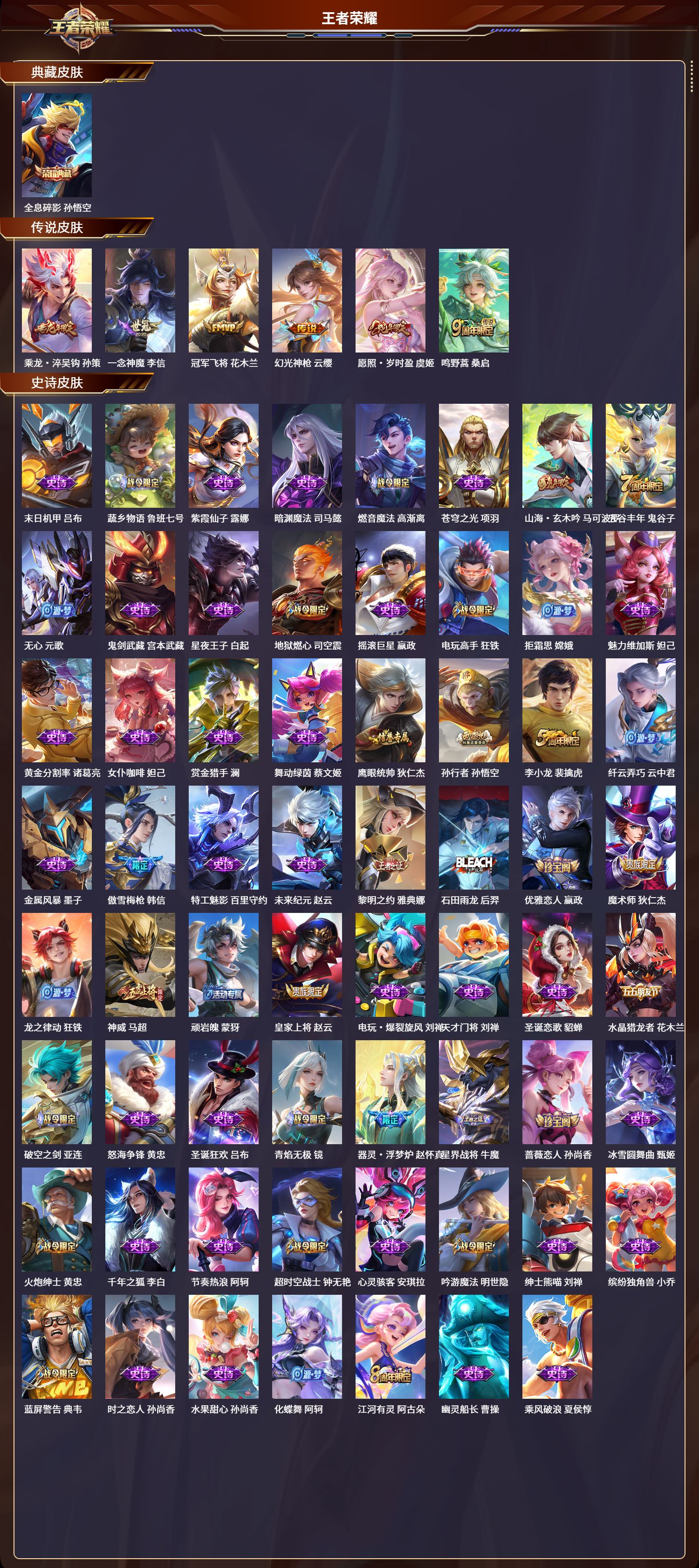 安卓qq/无双王者/245皮肤/125英雄/1典藏/0珍品无双/0无双/0珍品传说/6传说/64史诗/9稀有英雄【1 典藏皮肤】全息碎影 孙悟空【6 传说皮肤】乘龙·淬吴钩 孙策一念神魔 李信冠军飞将 花木兰幻光神呛 云缨愿照·岁时盈 虞姬鸣野蒿 桑启【64 史诗皮肤】末日机甲 吕布蔬乡物语 鲁班七号紫霞仙子 露娜暗渊魔法 司马懿燃音魔法 高渐离苍穹之光 项羽山海·玄木吟