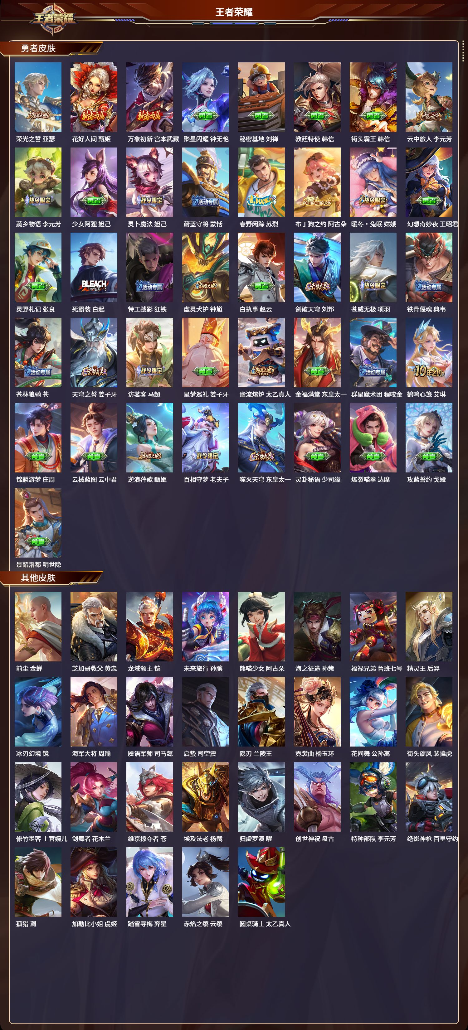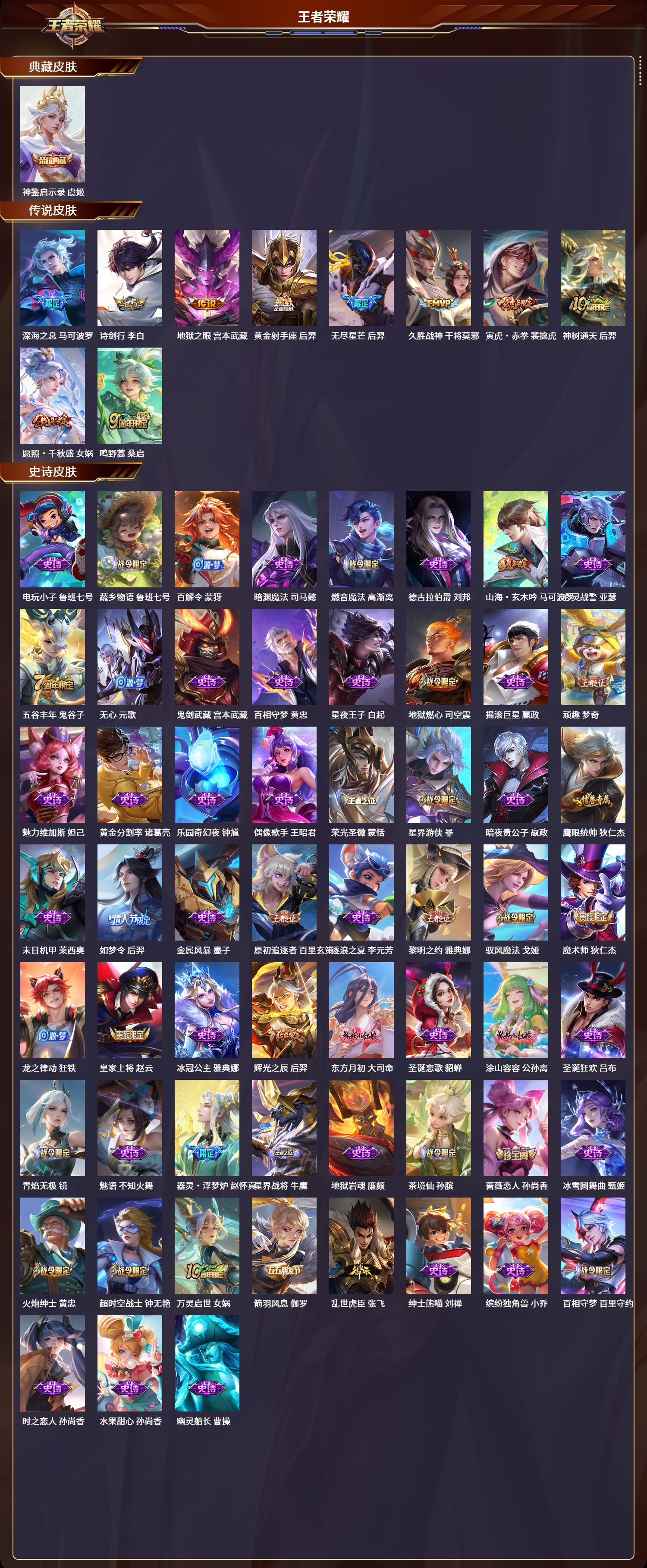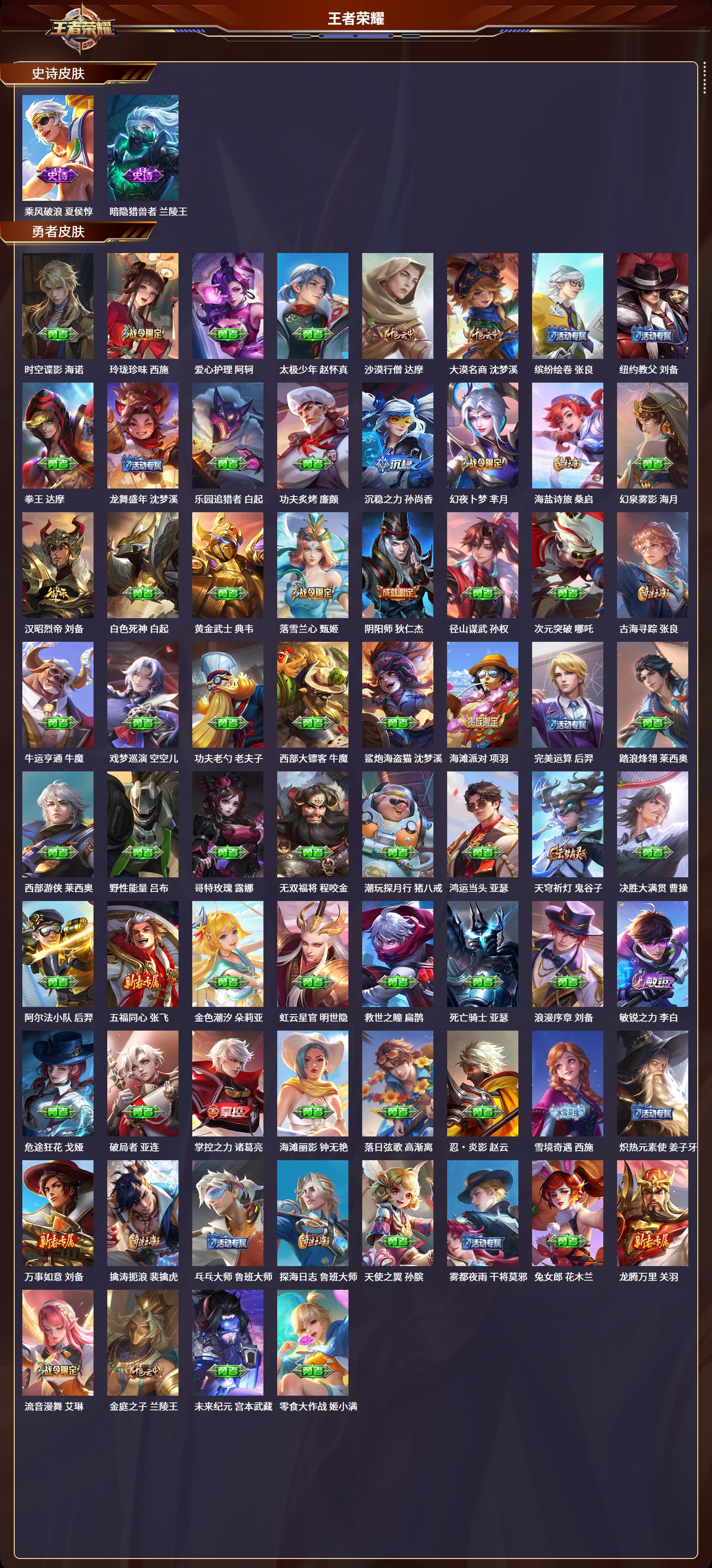安卓qq/最强王者/212皮肤/124英雄/1典藏/0珍品无双/0无双/0珍品传说/10传说/61史诗/8稀有英雄【1 典藏皮肤】神鉴启示录 虞姬【10 传说皮肤】深海之息 马可波罗诗剑行 李白地狱之眼 宫本武藏黄金射手座 后羿无尽星芒 后羿久胜战神 干将莫邪寅虎·赤拳 裴擒虎神树通天 后羿愿照·千秋盛 女娲鸣野蒿 桑启【61 史诗皮肤】电玩小子 鲁班七号蔬乡物语 鲁班七号
