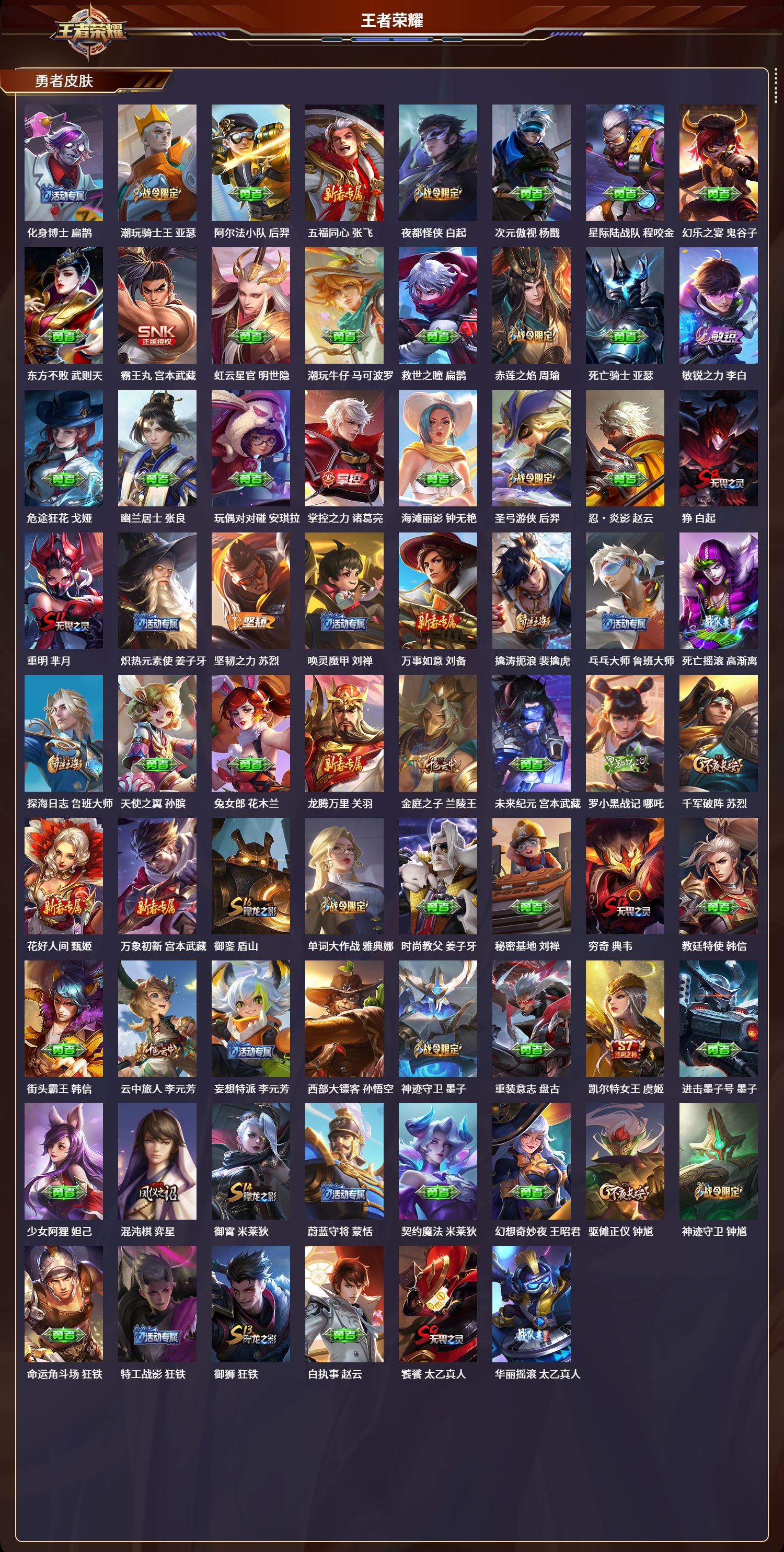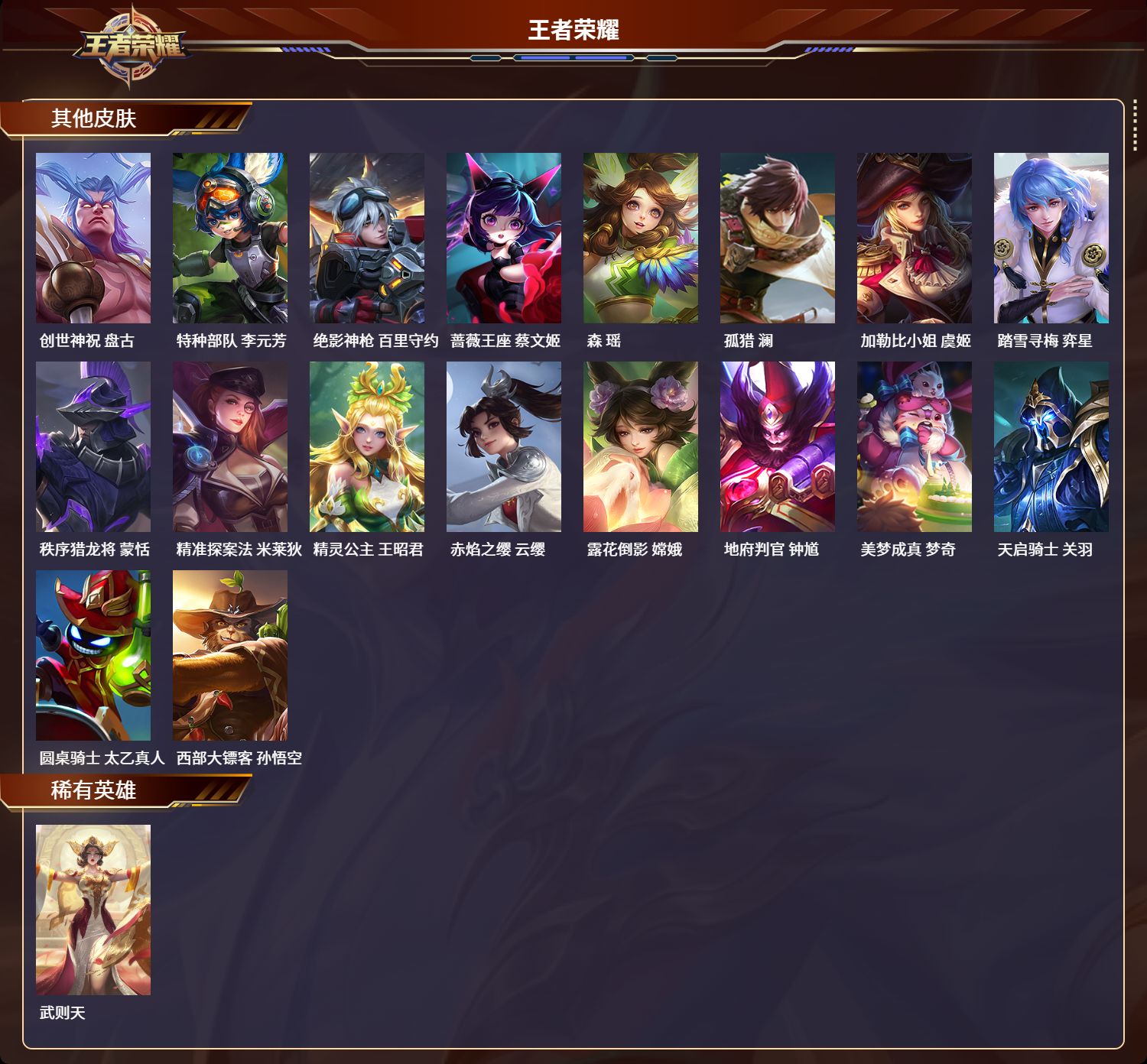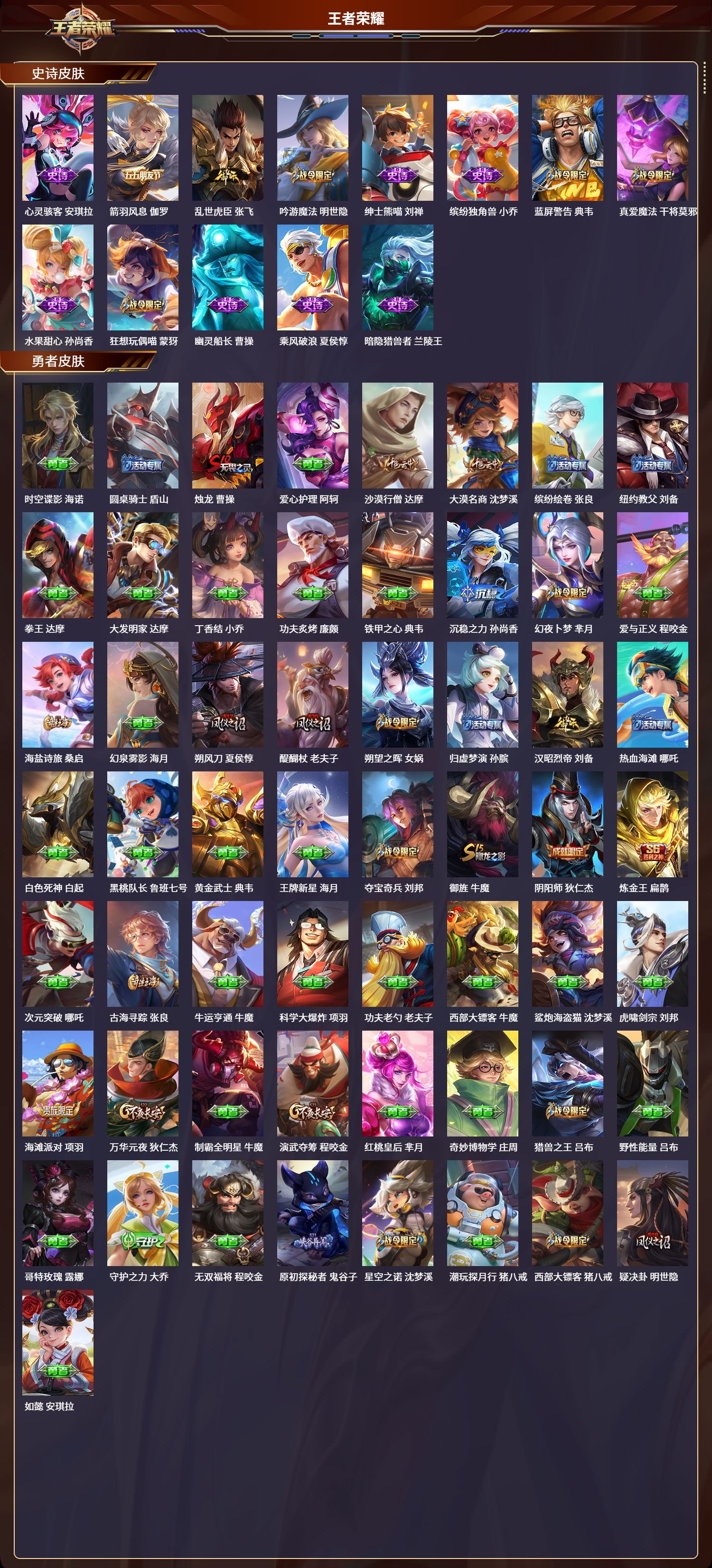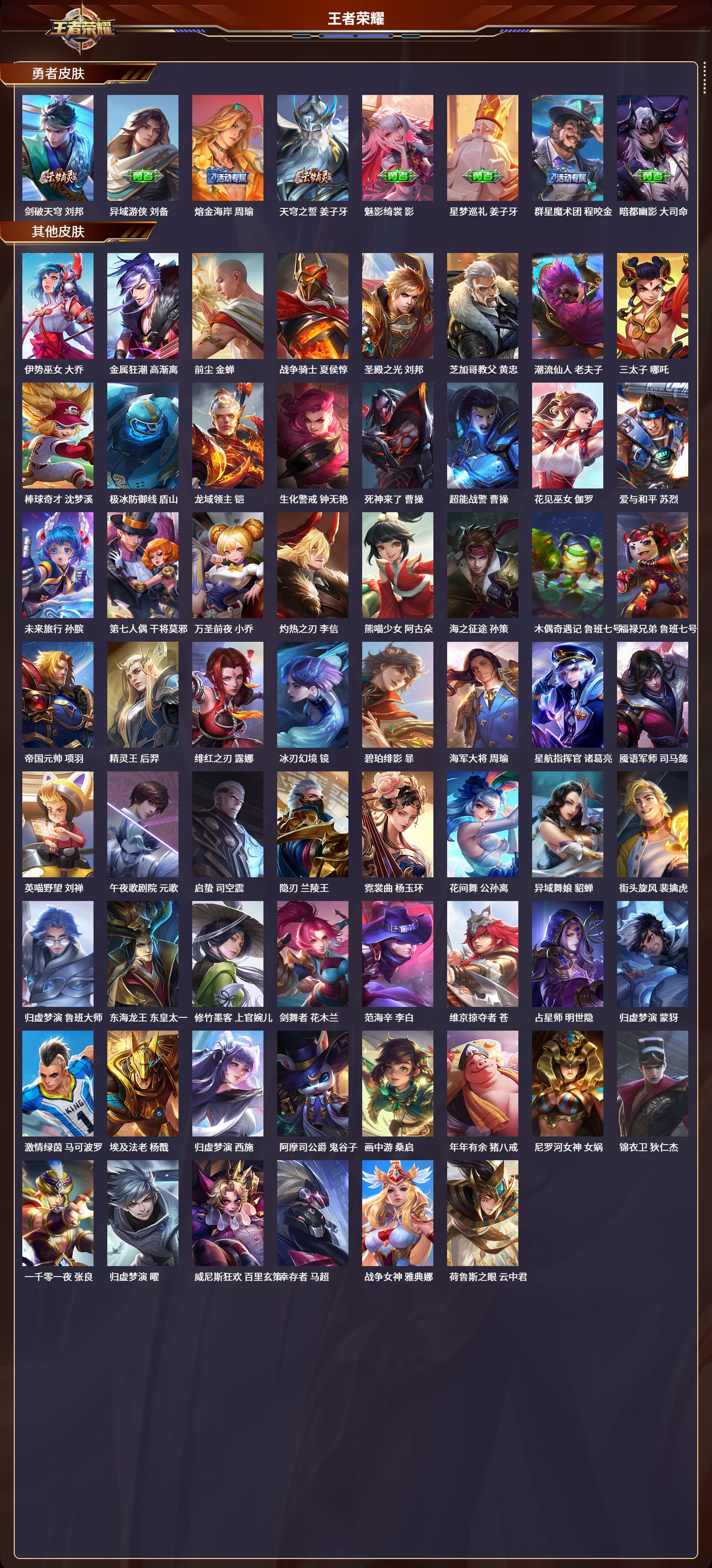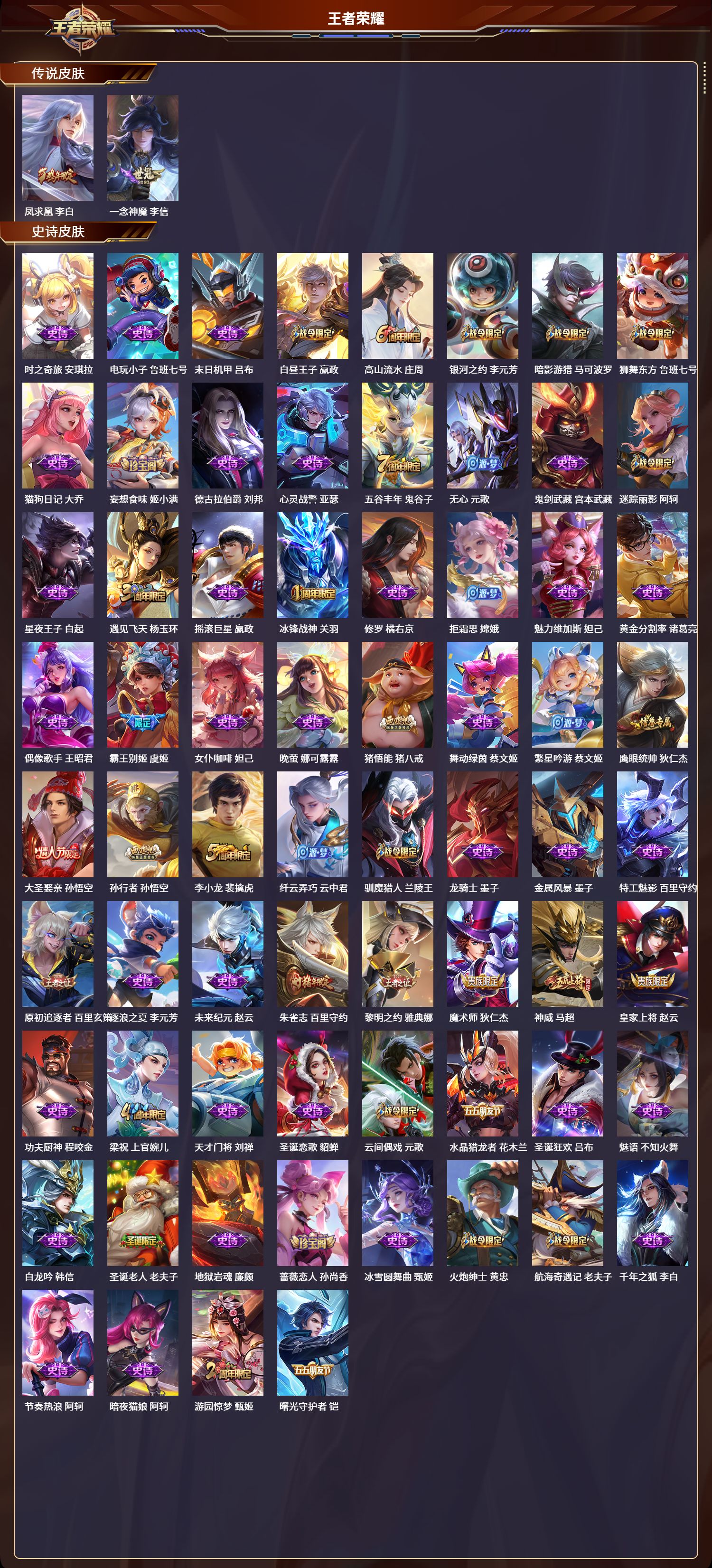 安卓qq/永恒钻石/299皮肤/125英雄/0典藏/0珍品无双/0无双/0珍品传说/2传说/81史诗/9稀有英雄【2 传说皮肤】凤求凰 李白一念神魔 李信【81 史诗皮肤】时之奇旅 安琪拉电玩小子 鲁班七号末日机甲 吕布白昼王子 嬴政高山流水 庄周银河之约 李元芳暗影游猎 马可波罗狮舞东方 鲁班七号猫狗日记 大乔妄想食味 姬小满德古拉伯爵 刘邦心灵战警 亚瑟五谷丰年 鬼